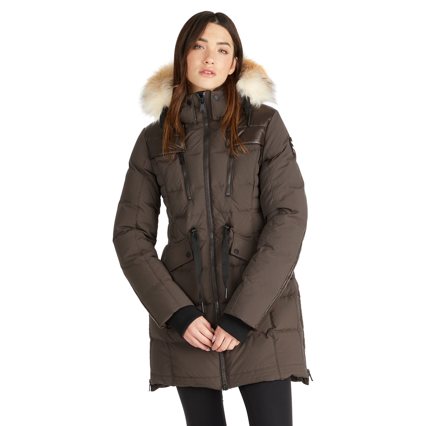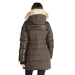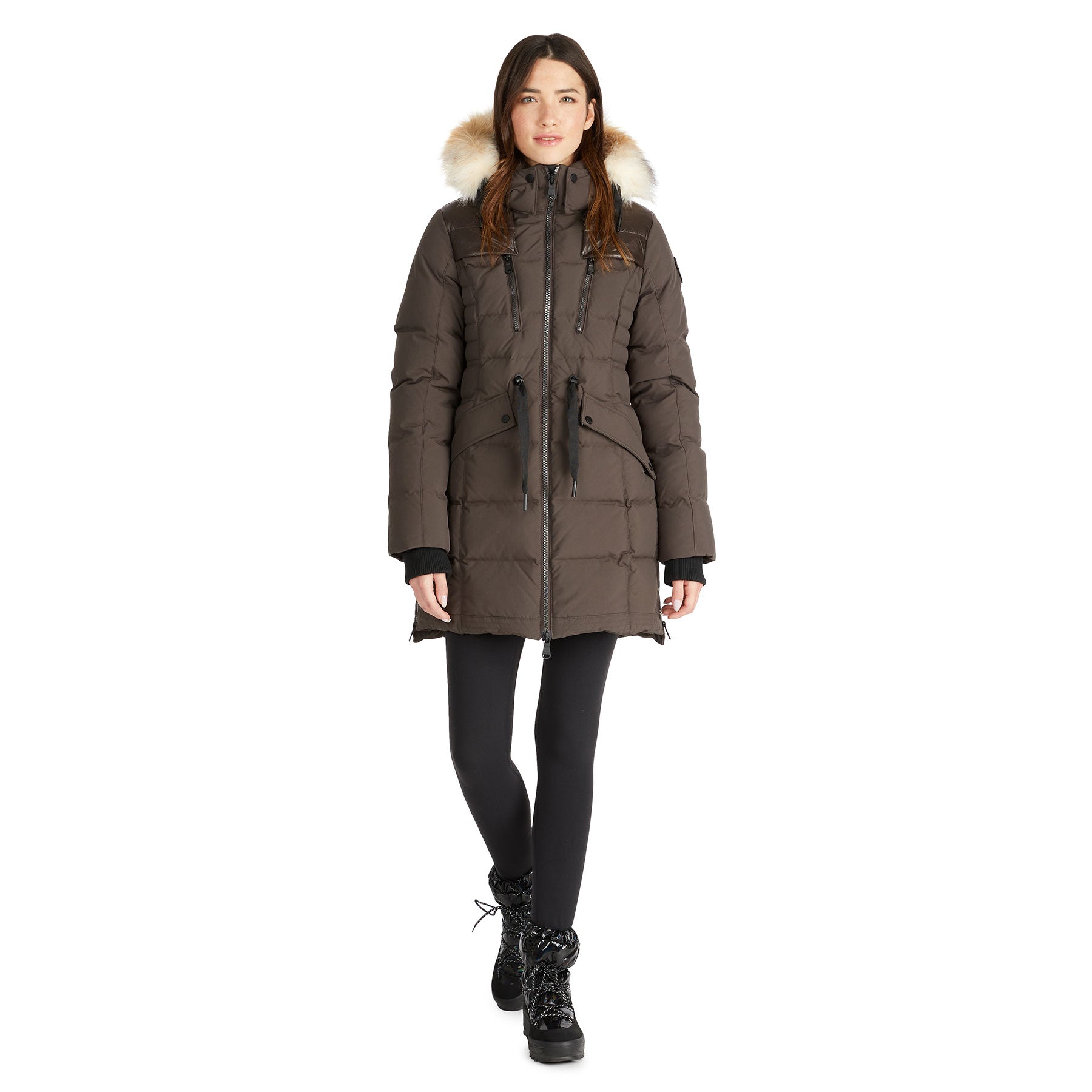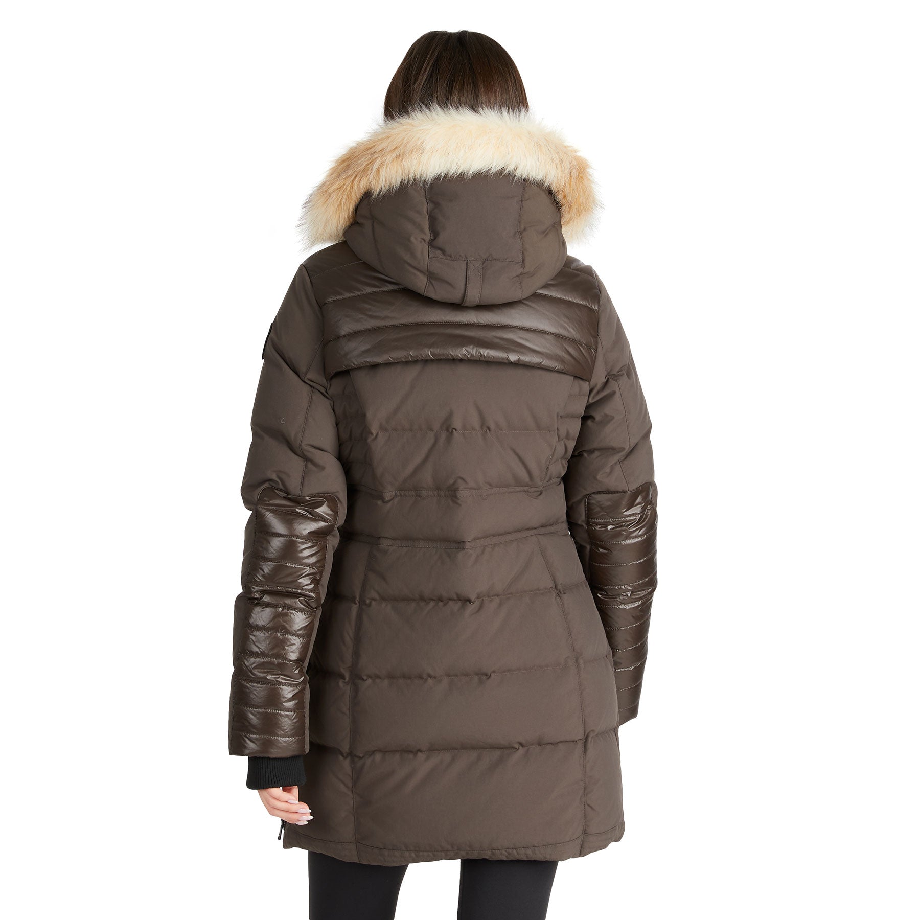 Women’s mix media quilted parka with detachable hood & faux fur trim.