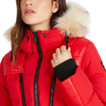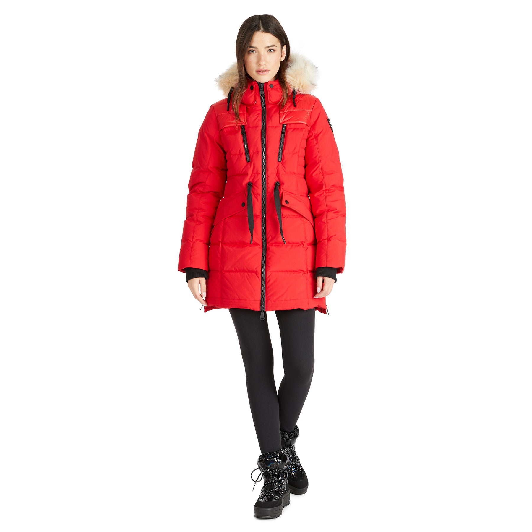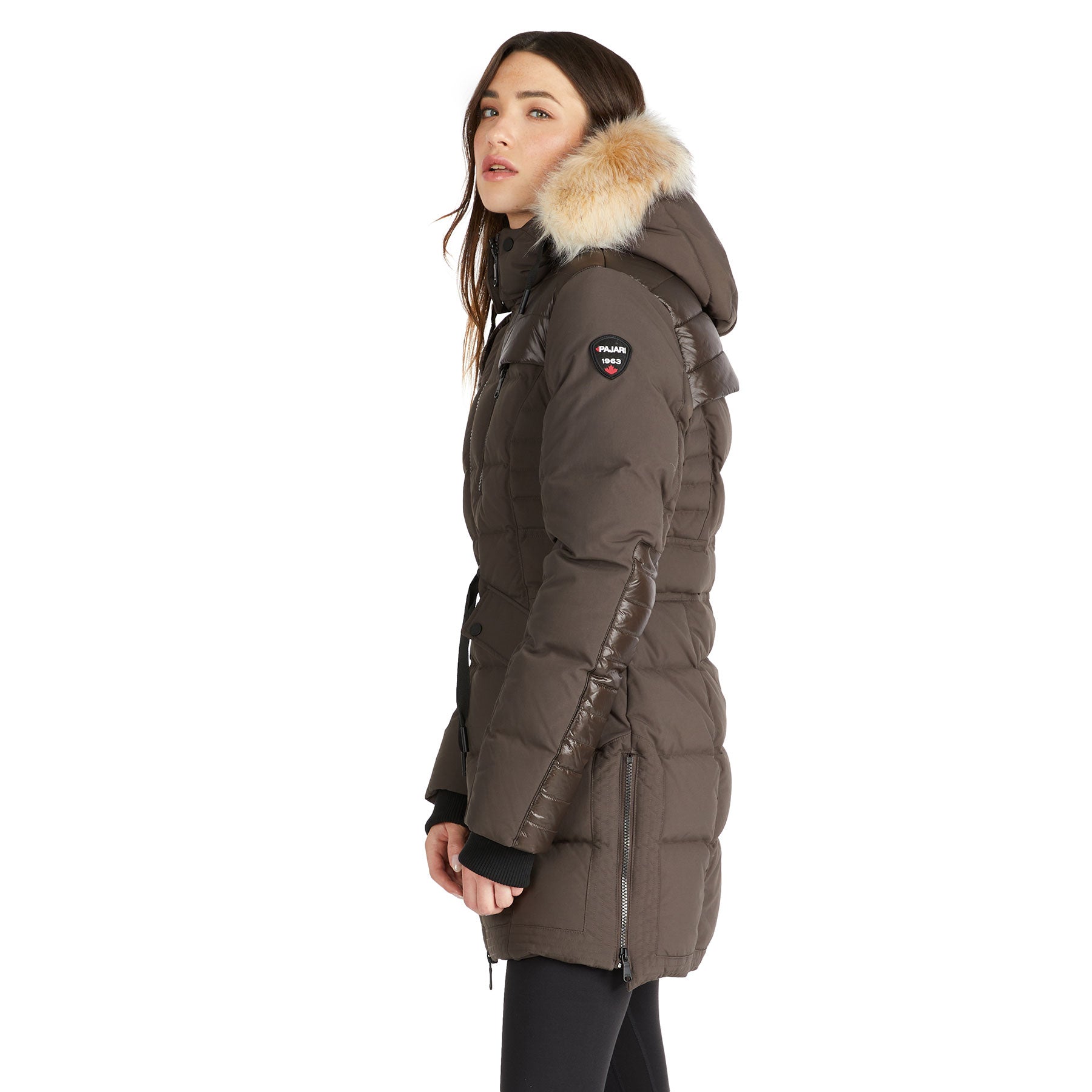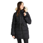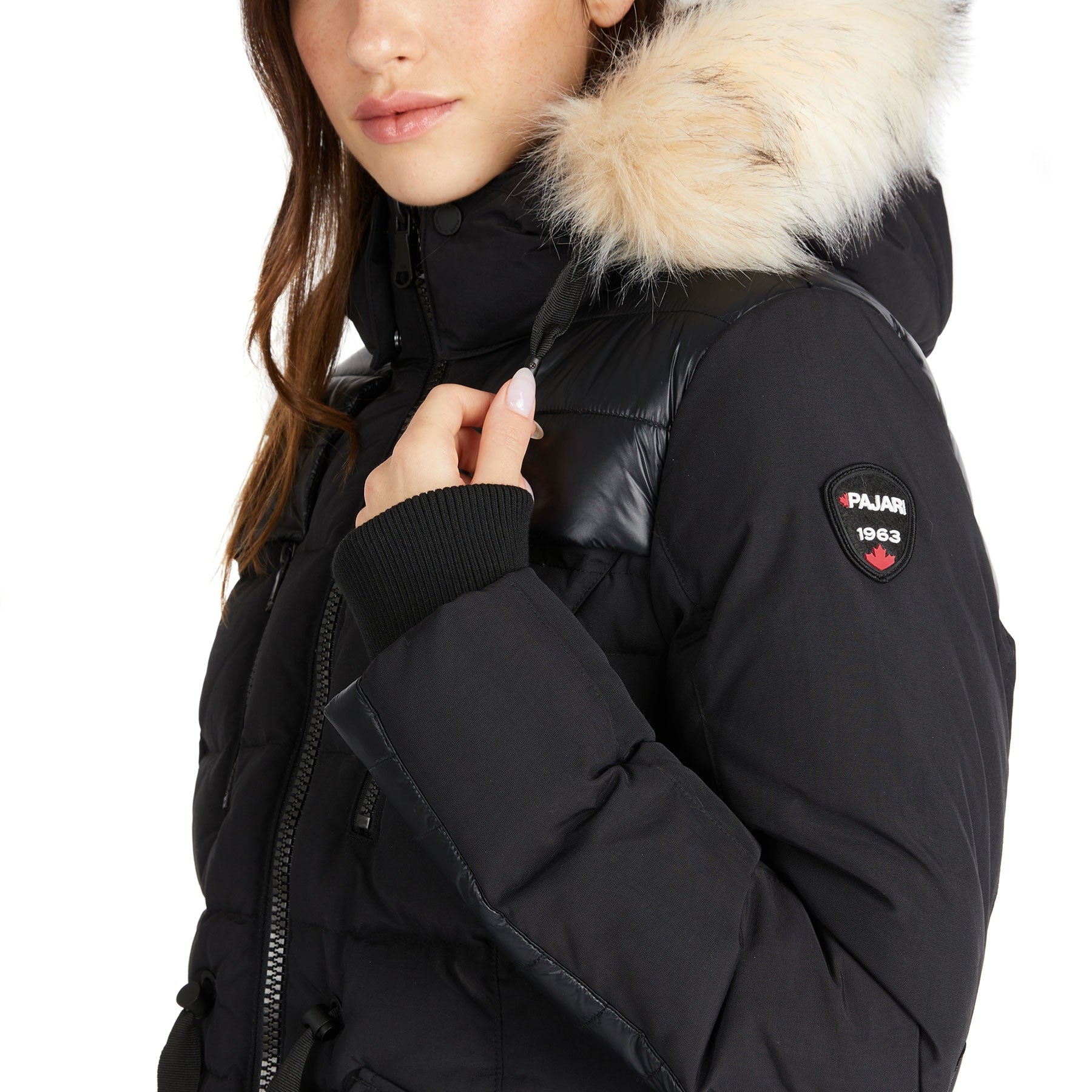Women’s mix media quilted parka with detachable hood & faux fur trim.