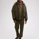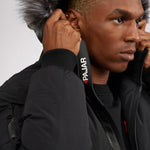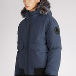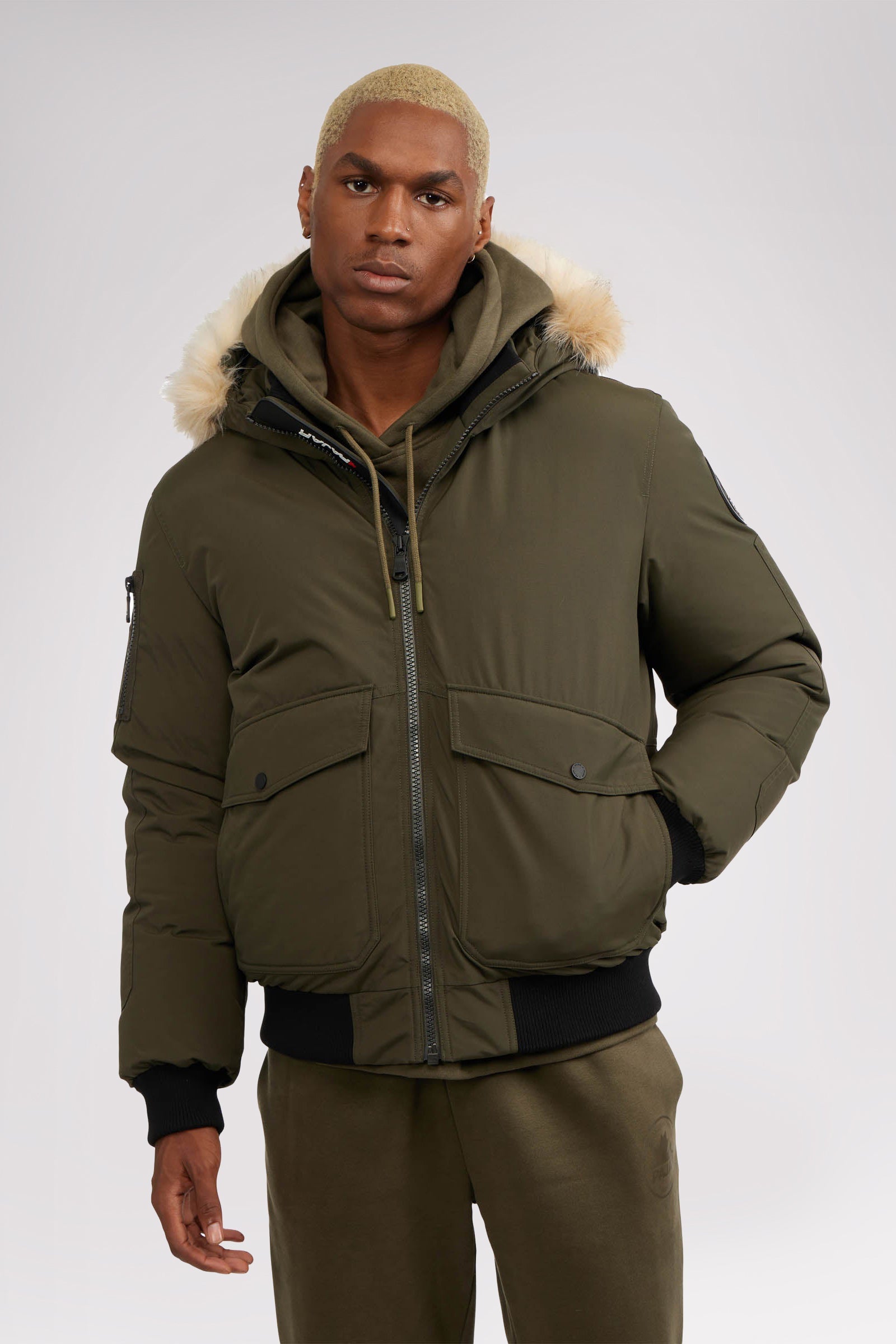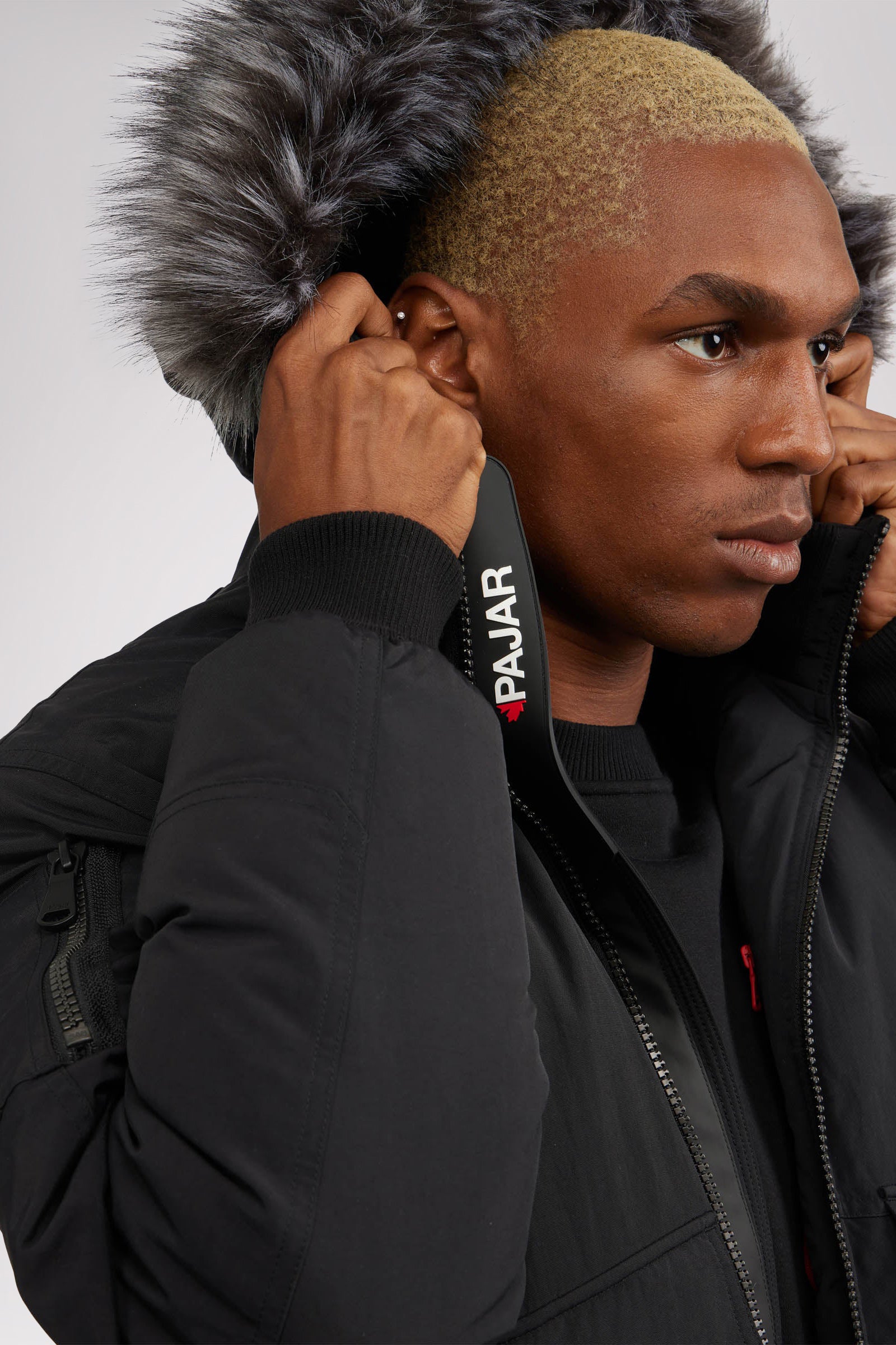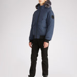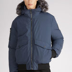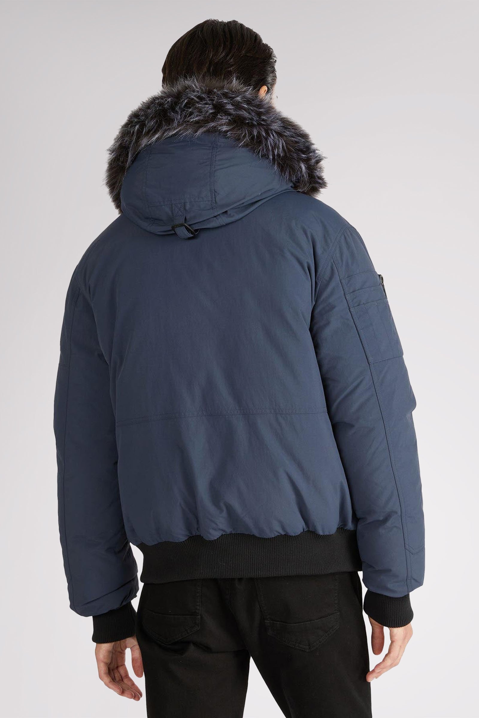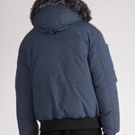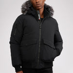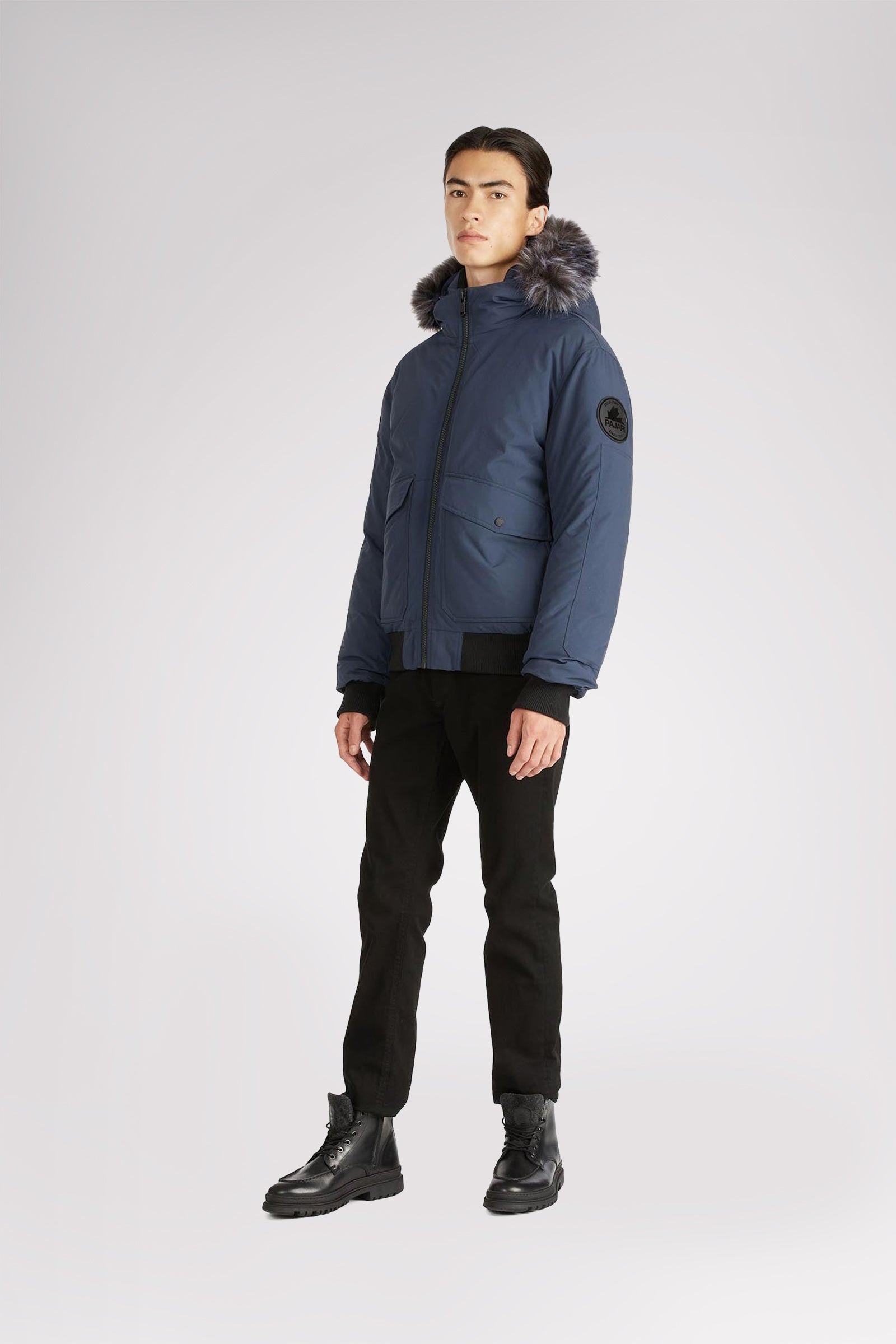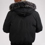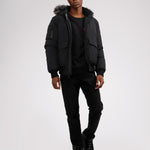 Men’s mixed-media zip front bomber with fixed hood & removable faux fur trim. Equipped with large bottom double-entry patch pockets. Sleeve pocket for extra storage. Cozy rib knit inner collar, cuffs and waistband. Adjustable hood tab.