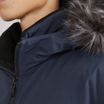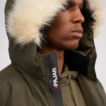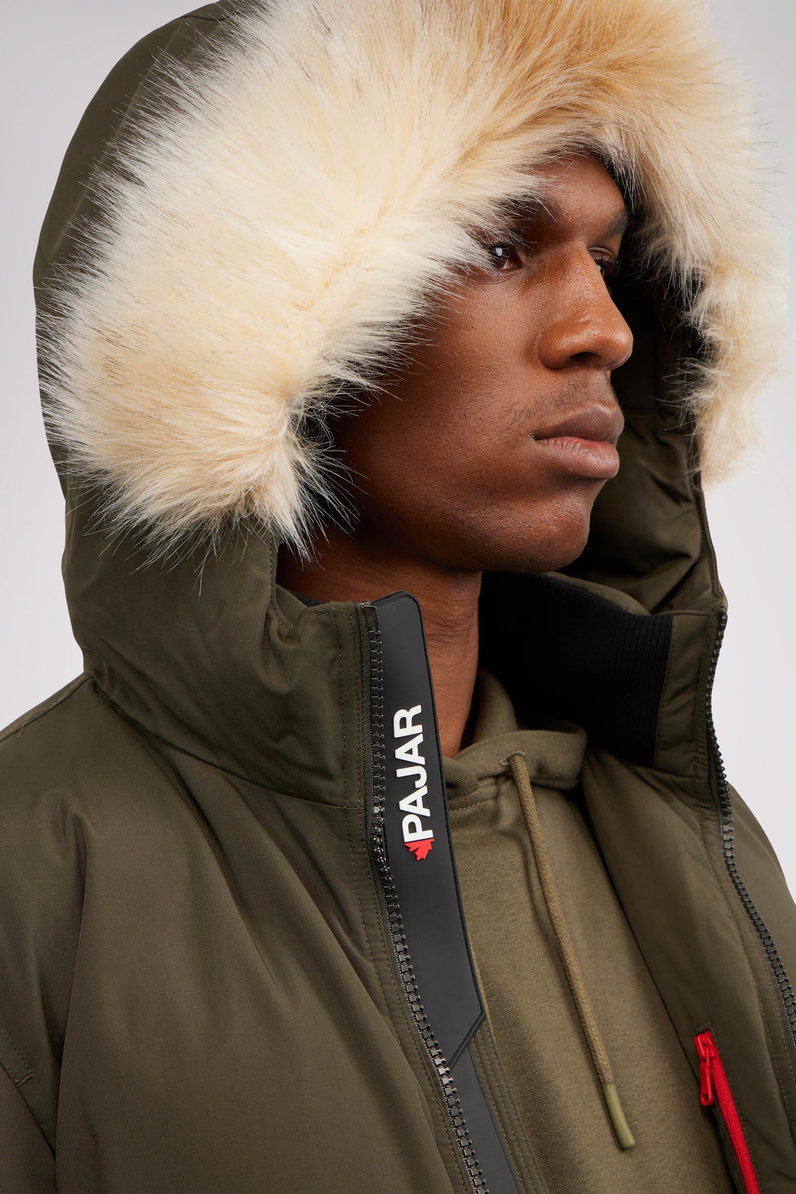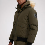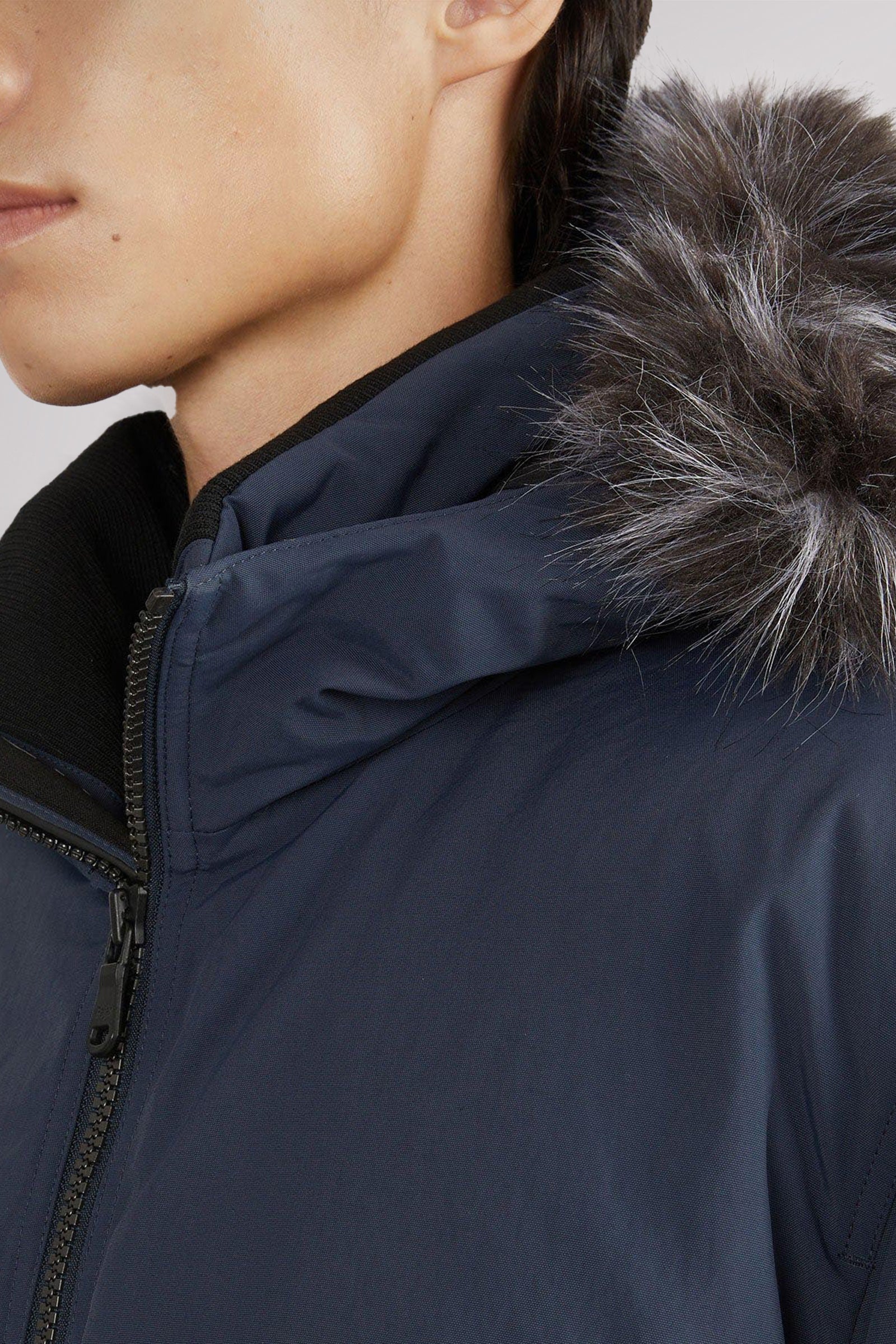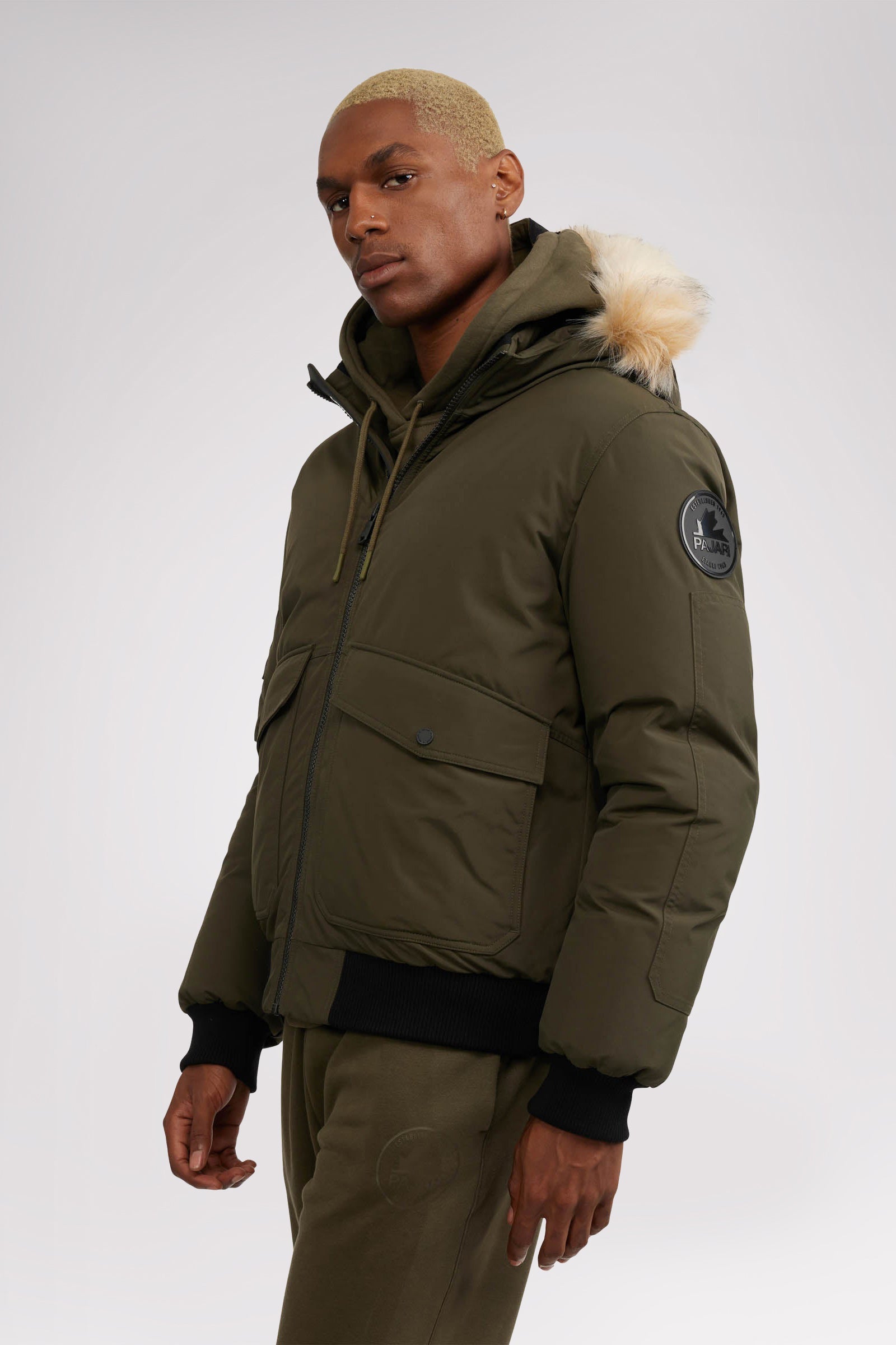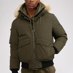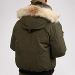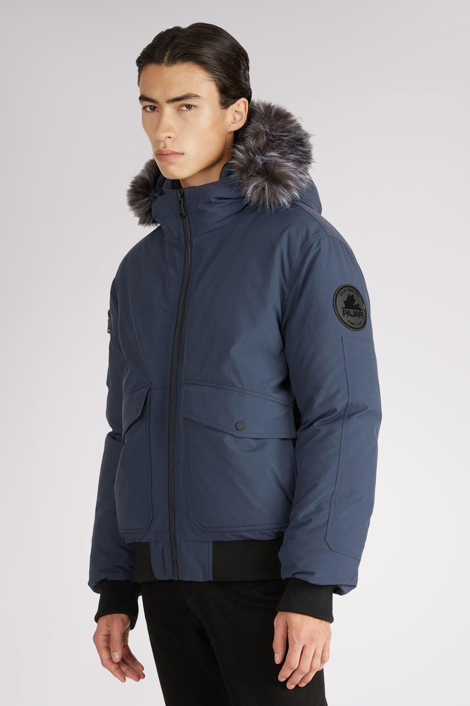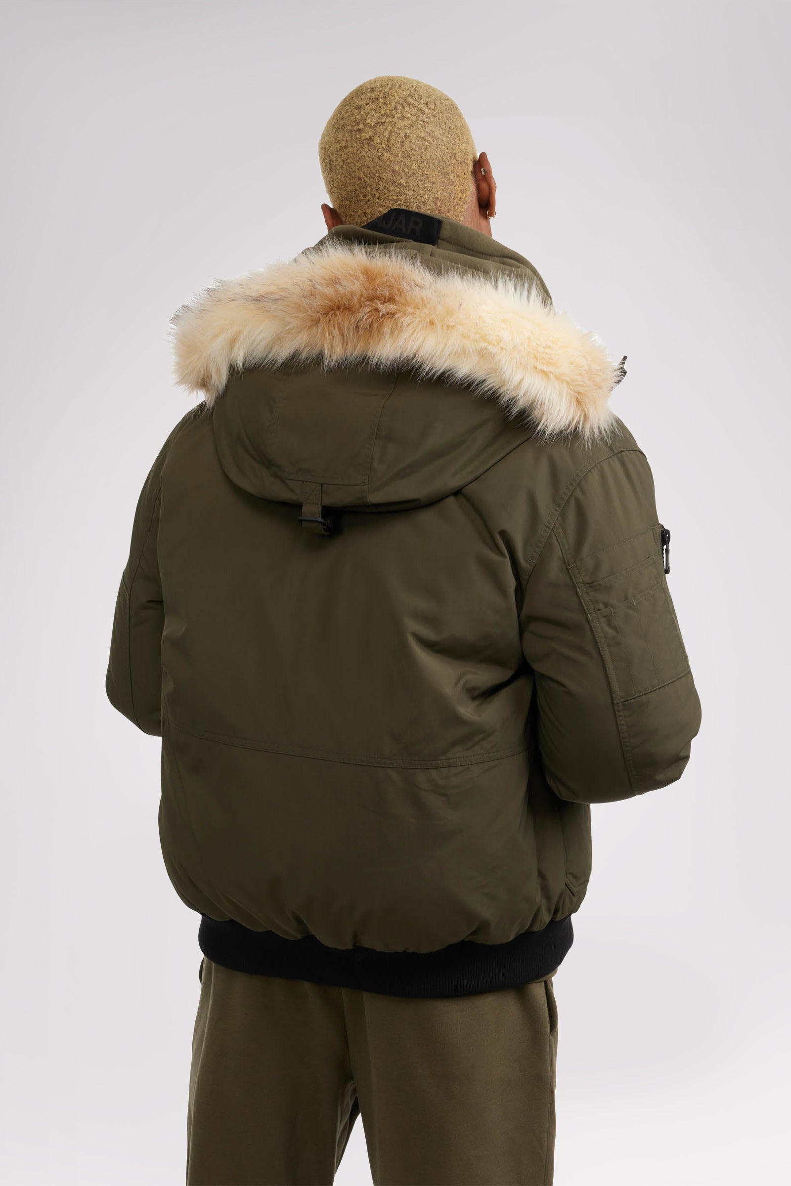 Men’s mixed-media zip front bomber with fixed hood & removable faux fur trim. Equipped with large bottom double-entry patch pockets. Sleeve pocket for extra storage. Cozy rib knit inner collar, cuffs and waistband. Adjustable hood tab.