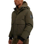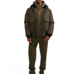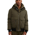 Men’s bomber with fixed hood and visor. Equipped with large double-entry zipper patch pockets. Cozy rib knit cuffs & waistband. Adjustable jacquard logo hood tab.