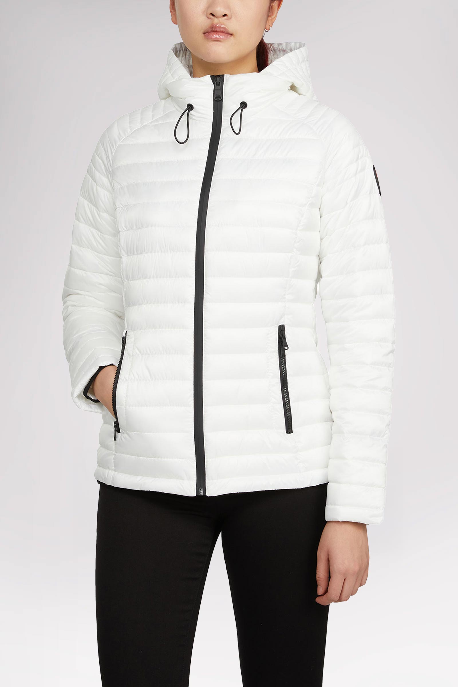 Ladies' channel quilted zip front lightweight puffer with detachable hood.