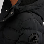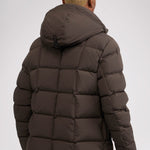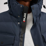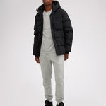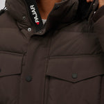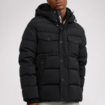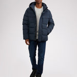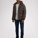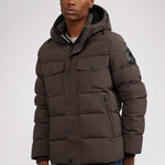 Men’s box quilted puffer with removable hood and detachable sherpa liner. Equipped with zip & snap front placket closure, chest patch pockets and bottom zipper pockets. Cozy rib knit storm cuffs. Adjustable jacquard logo hood tab.