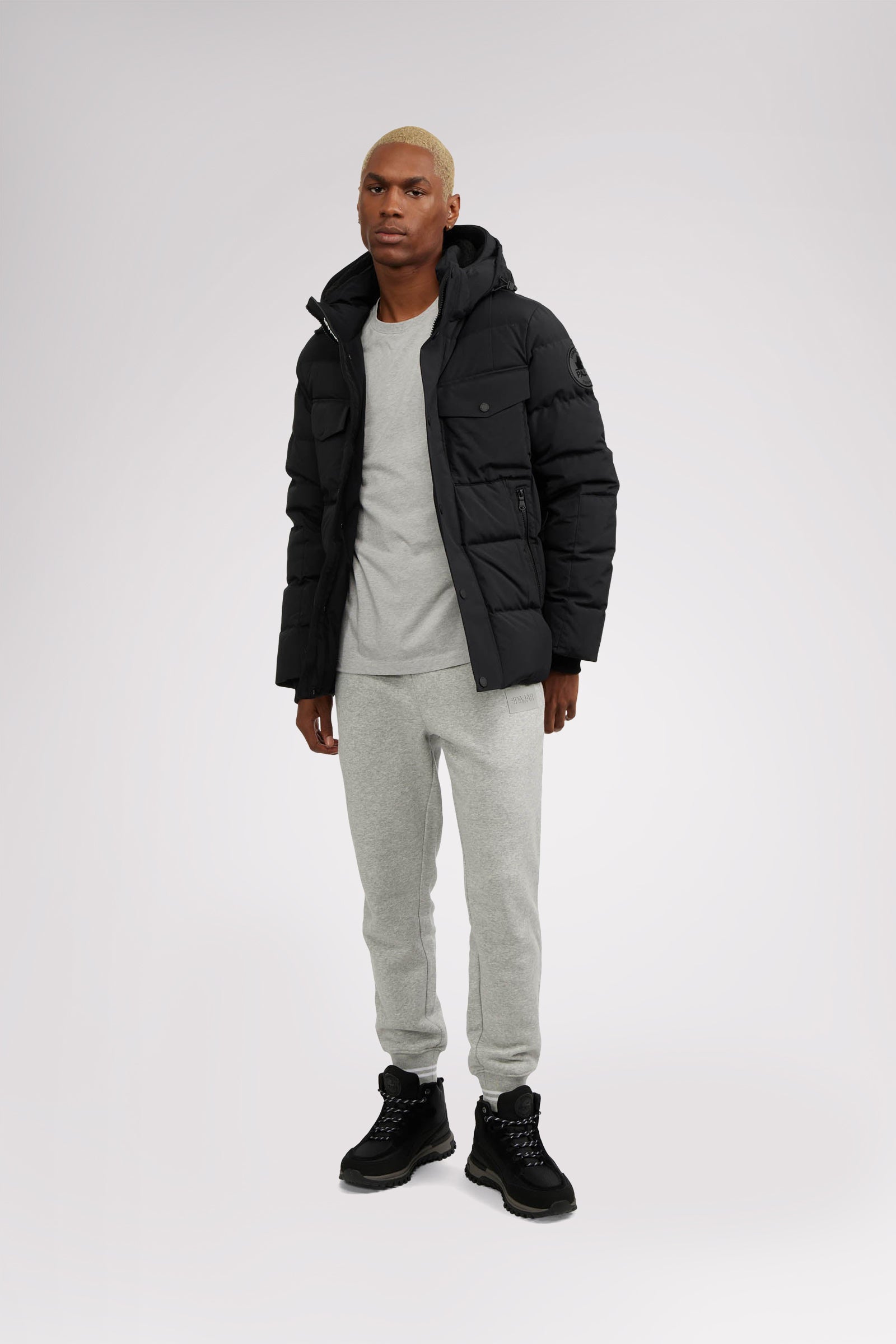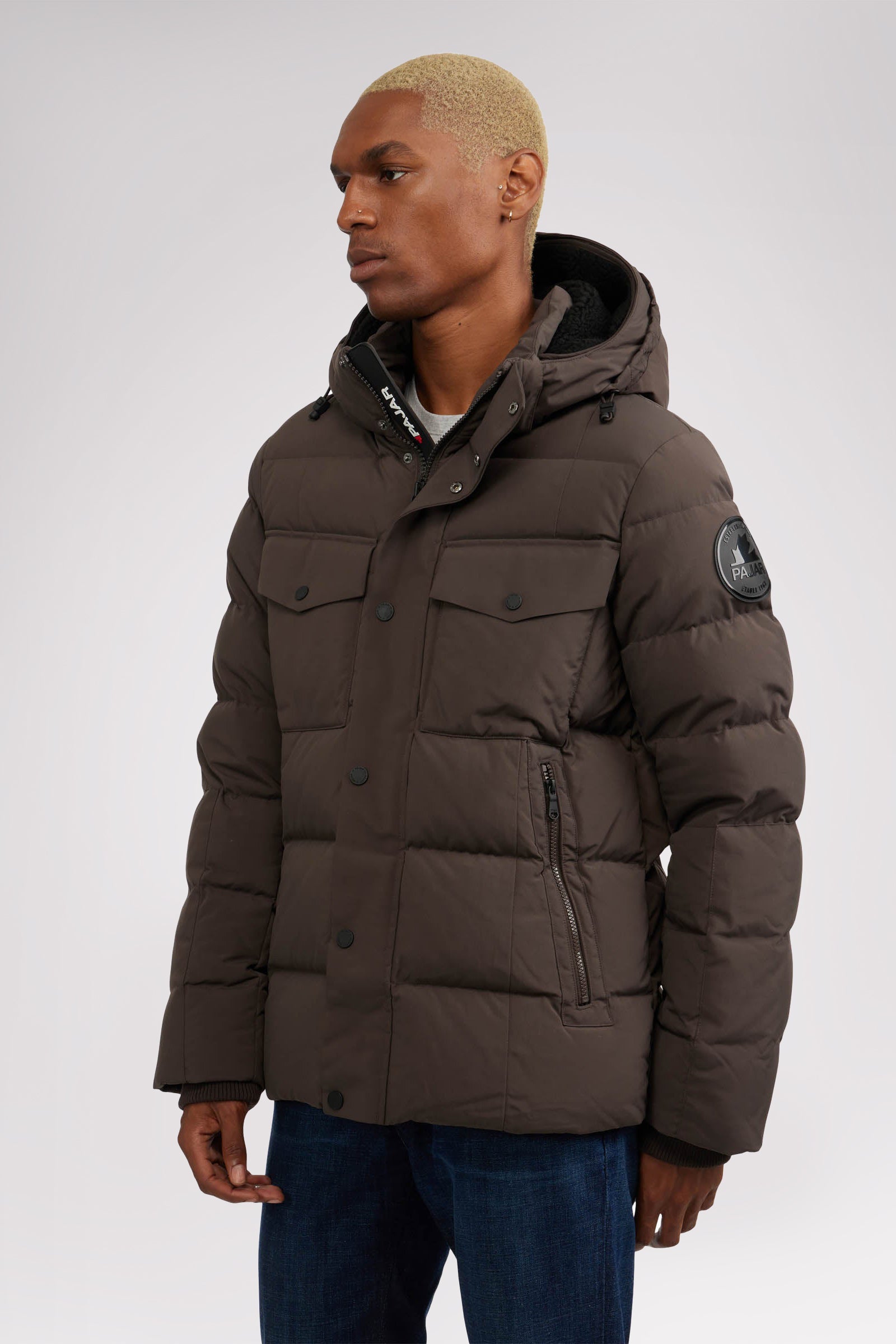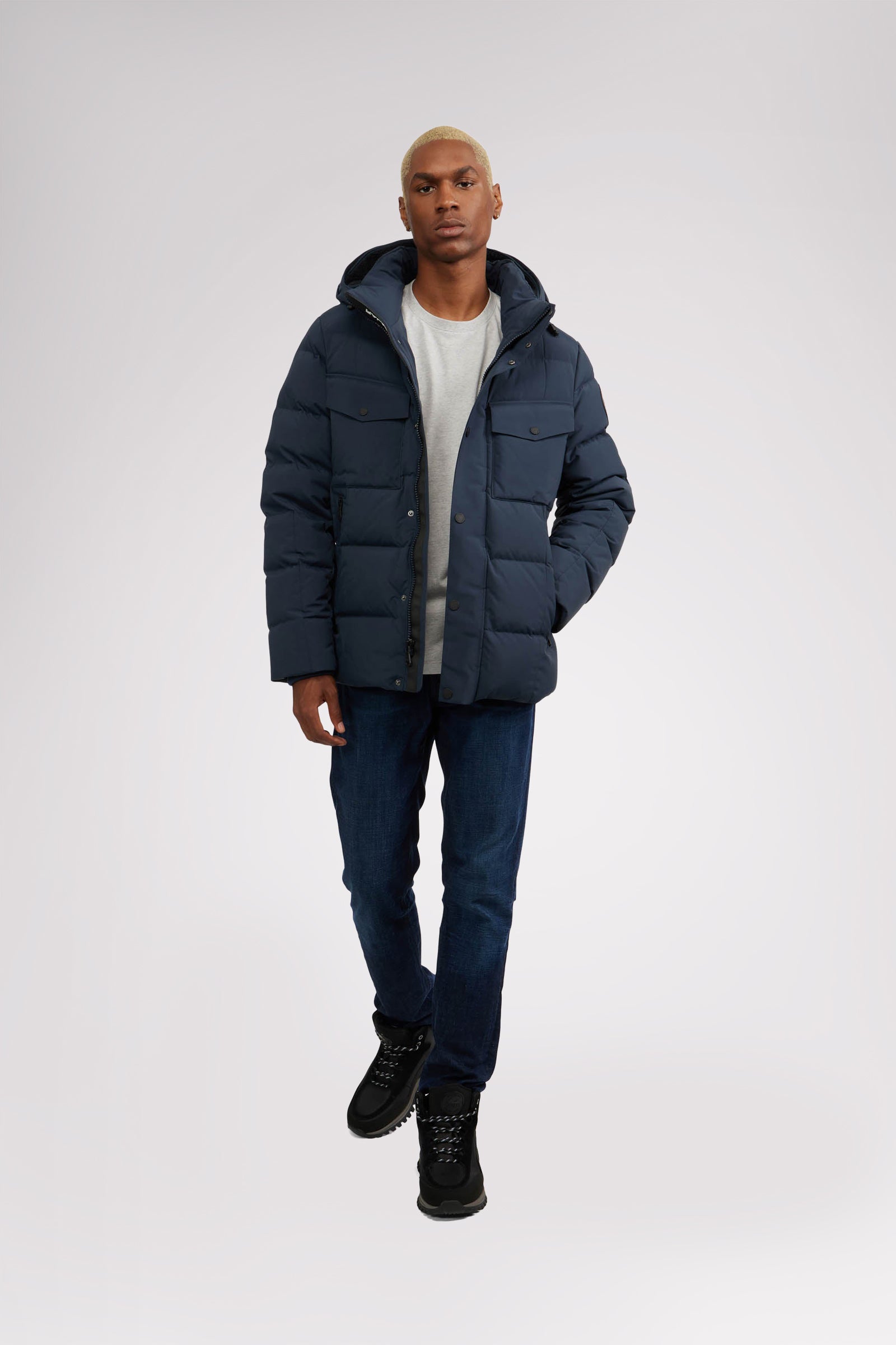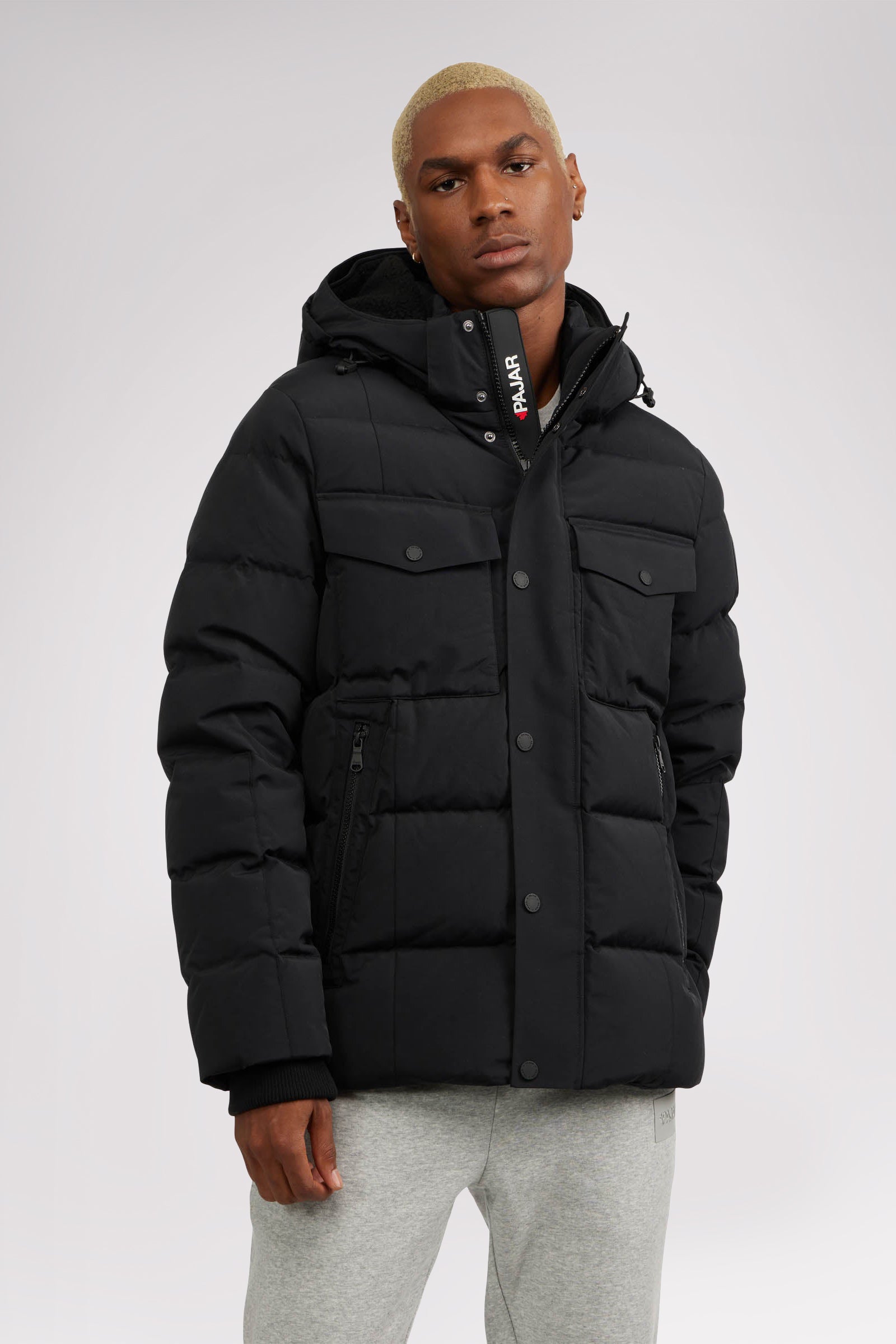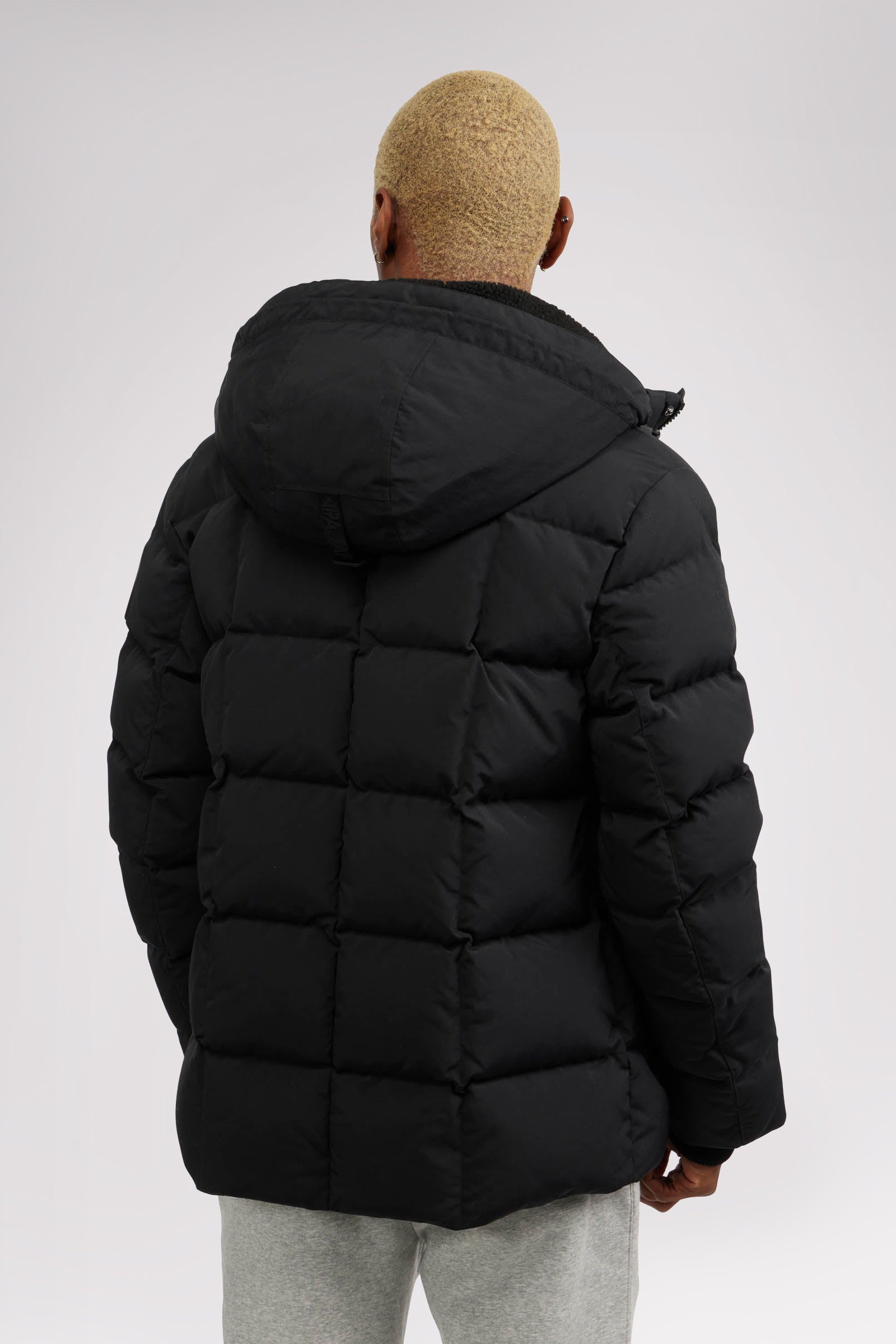 Men’s box quilted puffer with removable hood and detachable sherpa liner. Equipped with zip & snap front placket closure, chest patch pockets and bottom zipper pockets. Cozy rib knit storm cuffs. Adjustable jacquard logo hood tab.