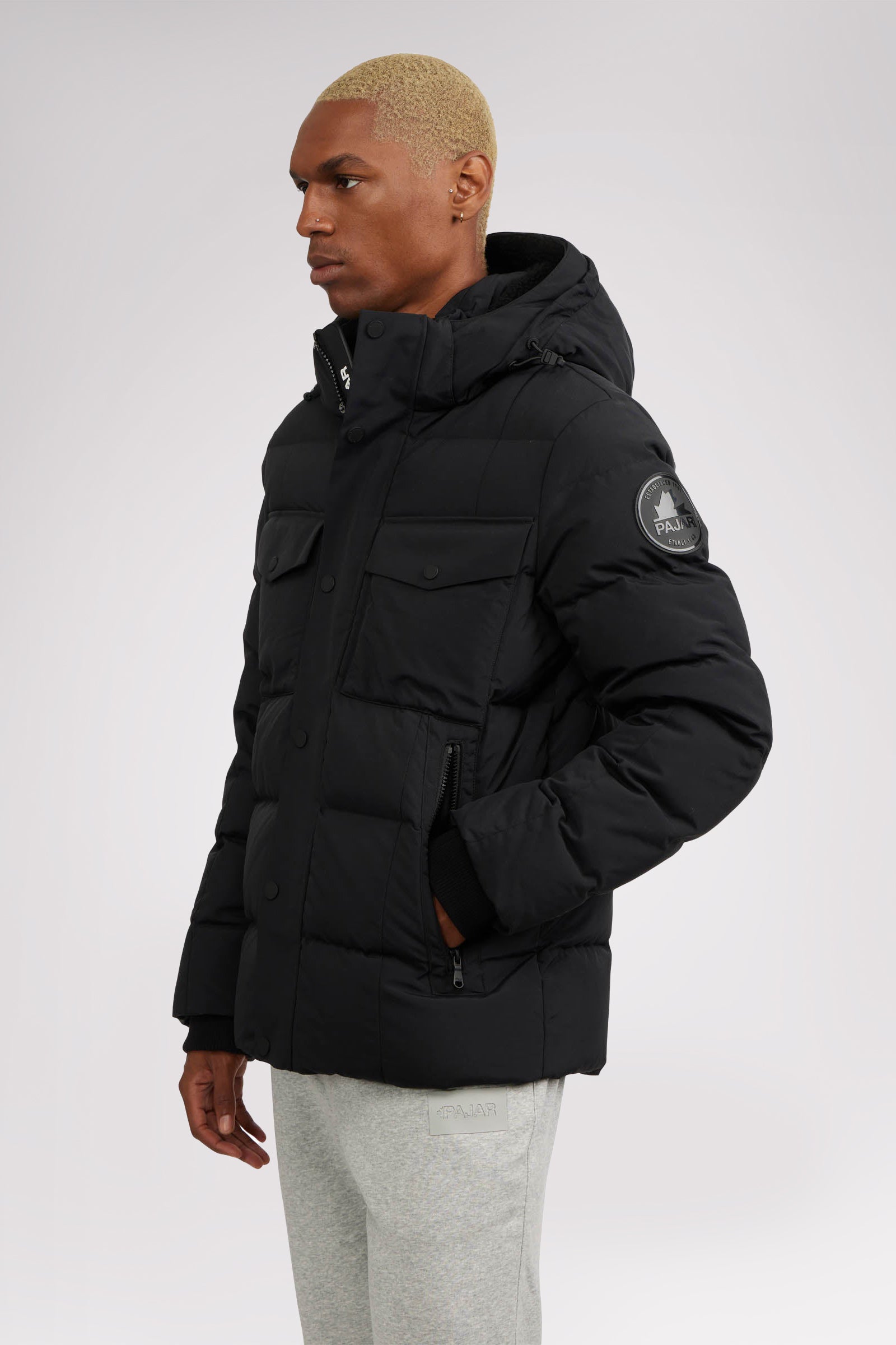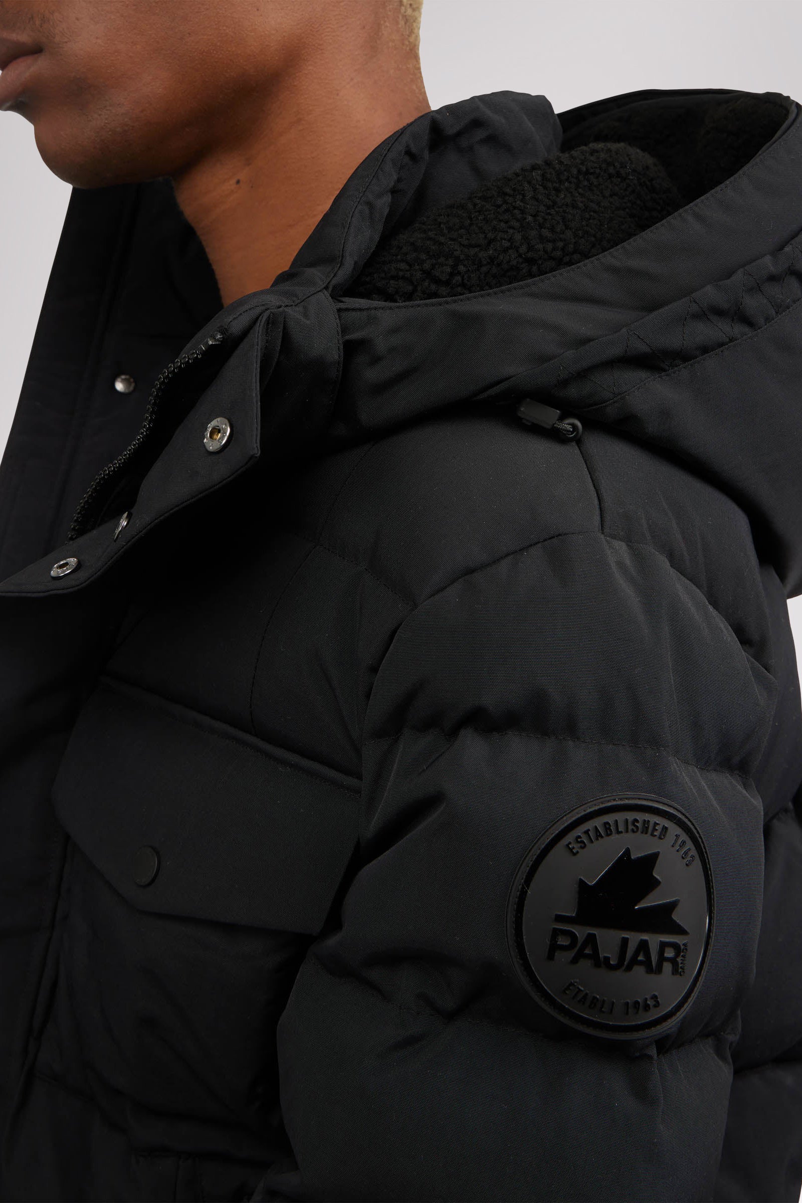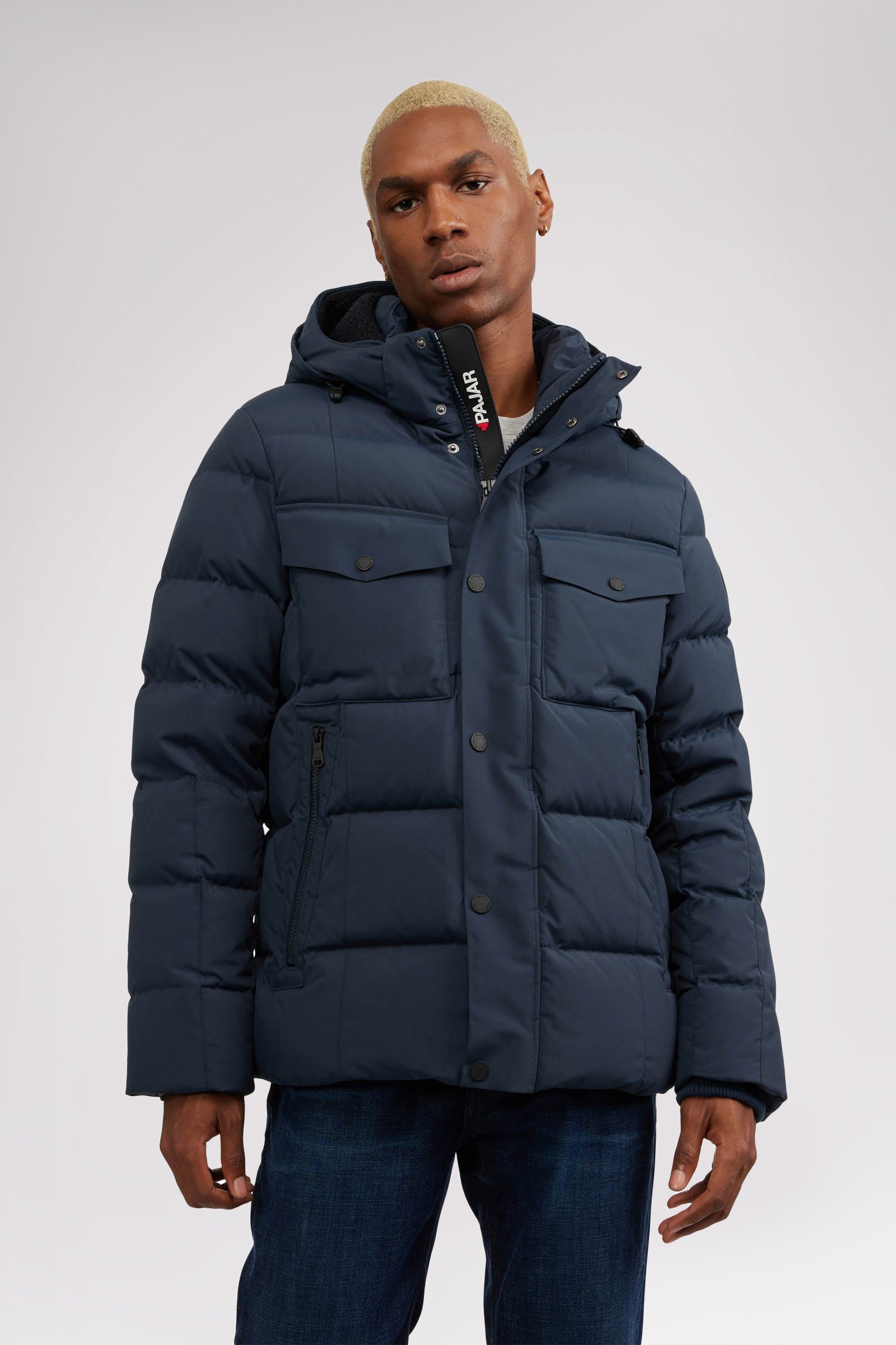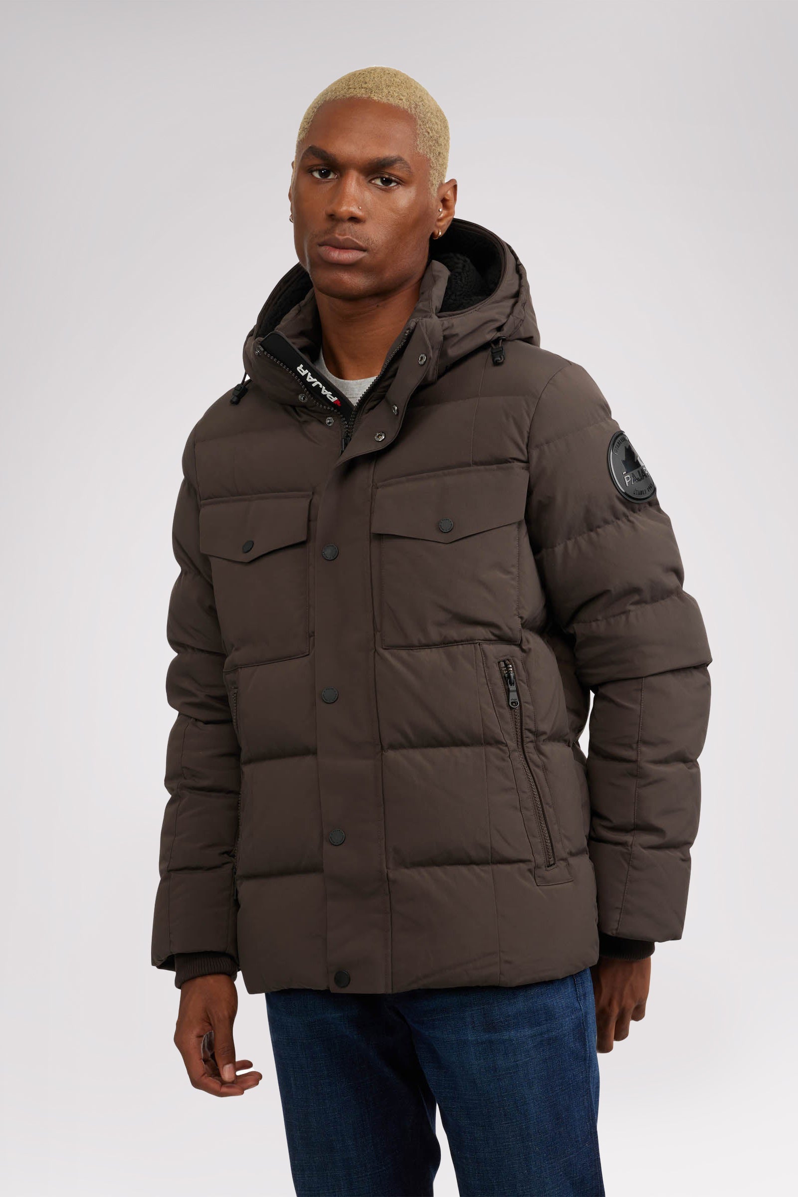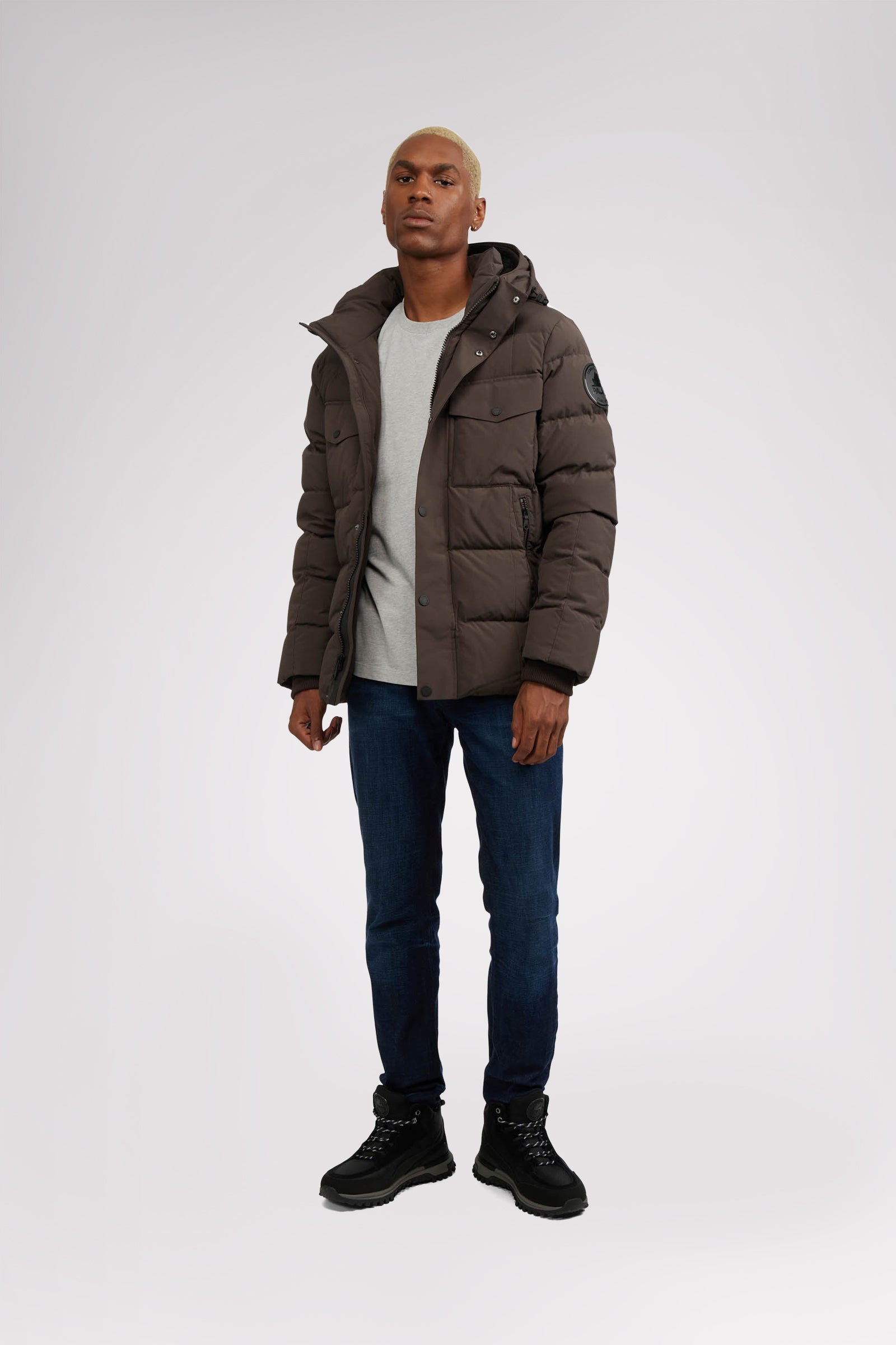 Men’s box quilted puffer with removable hood and detachable sherpa liner. Equipped with zip & snap front placket closure, chest patch pockets and bottom zipper pockets. Cozy rib knit storm cuffs. Adjustable jacquard logo hood tab.