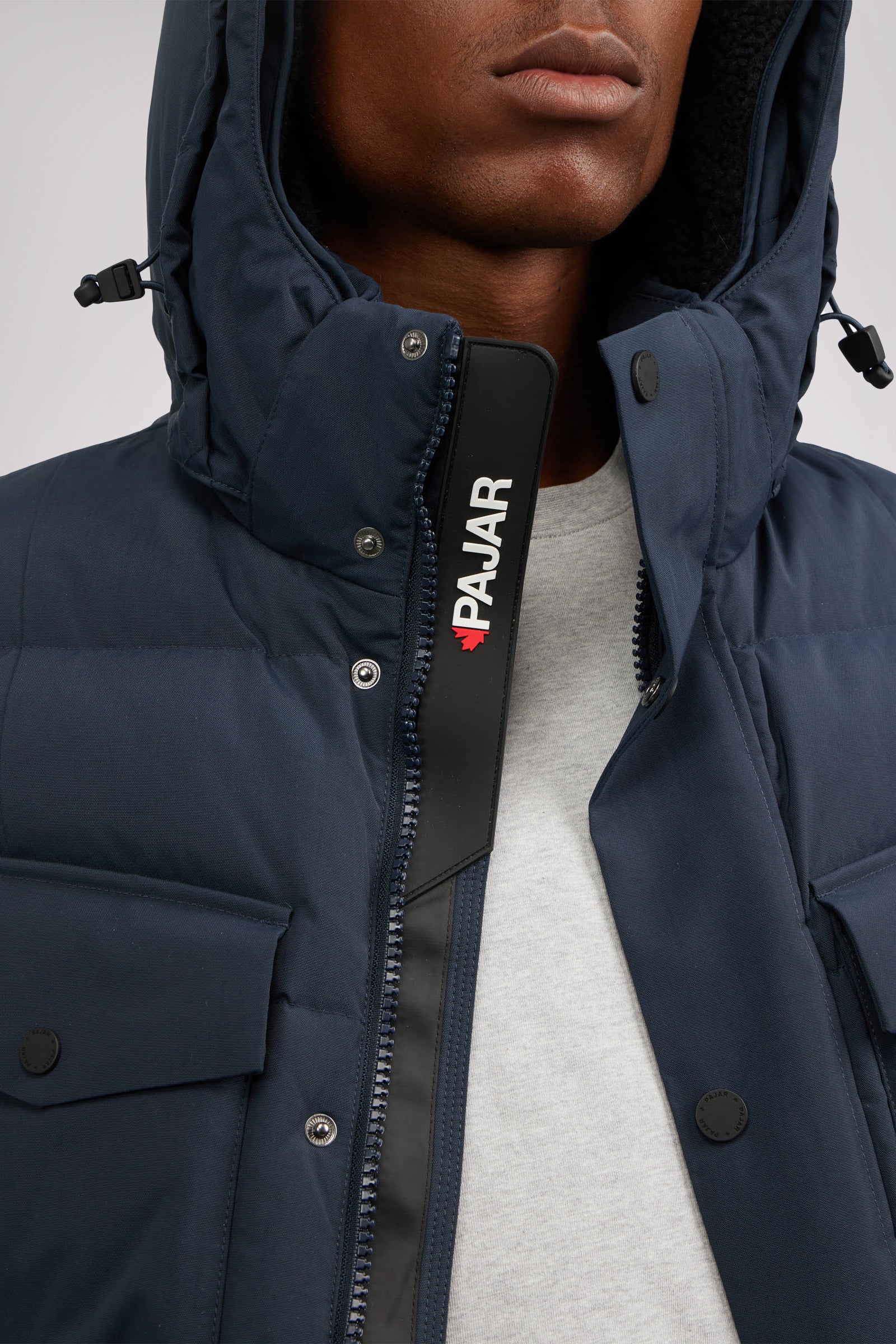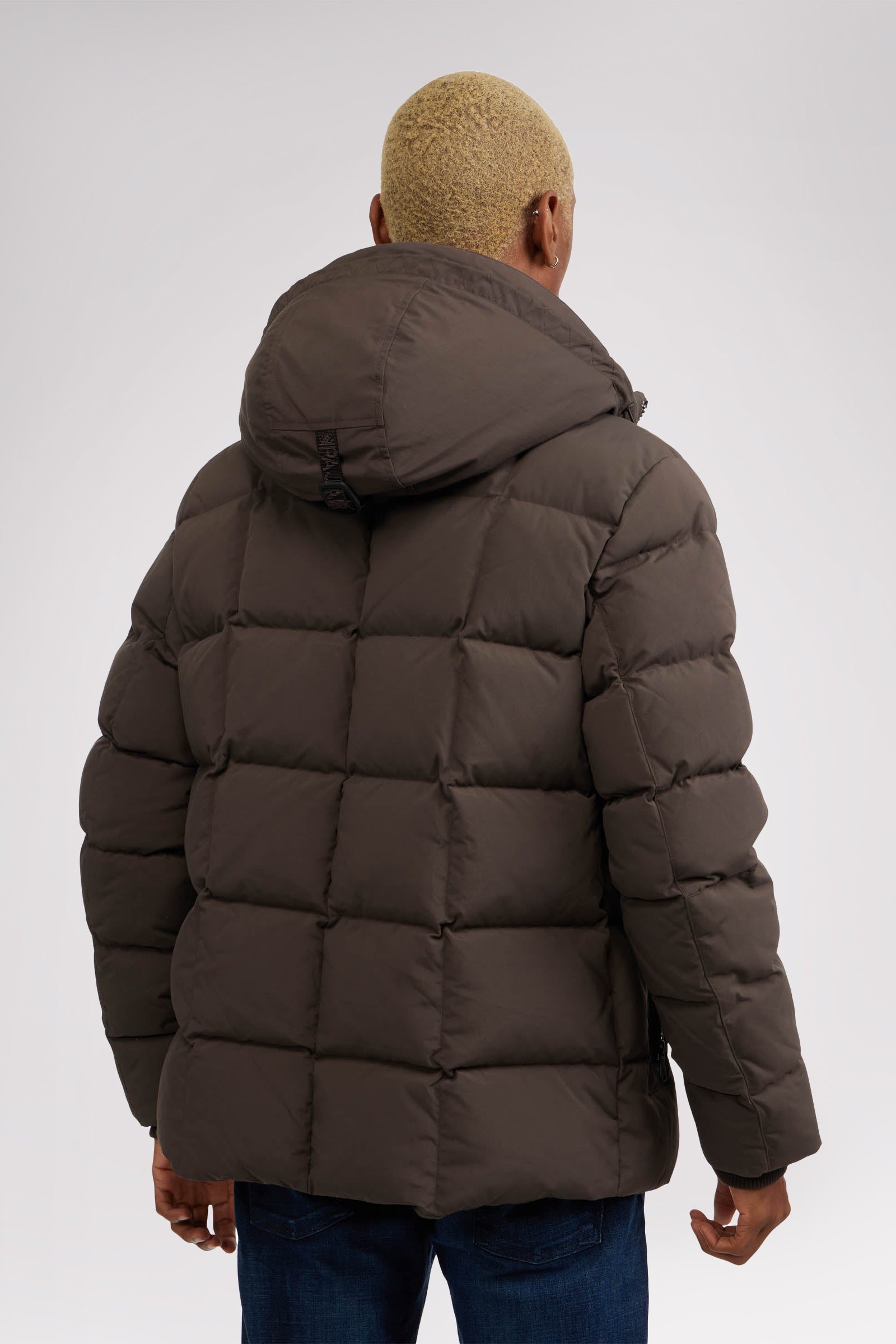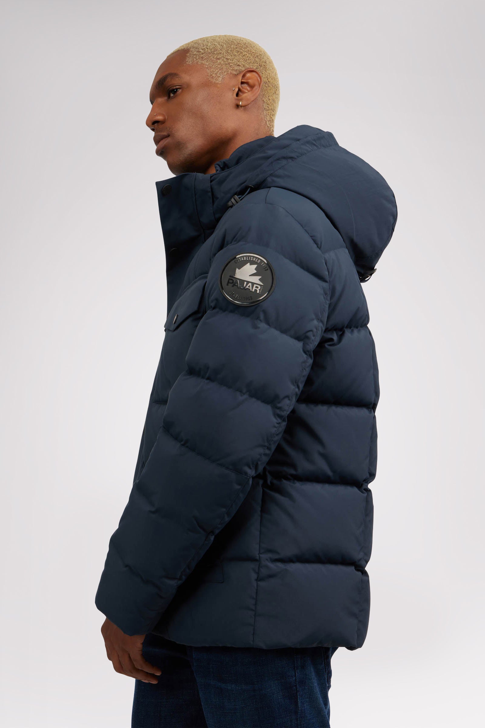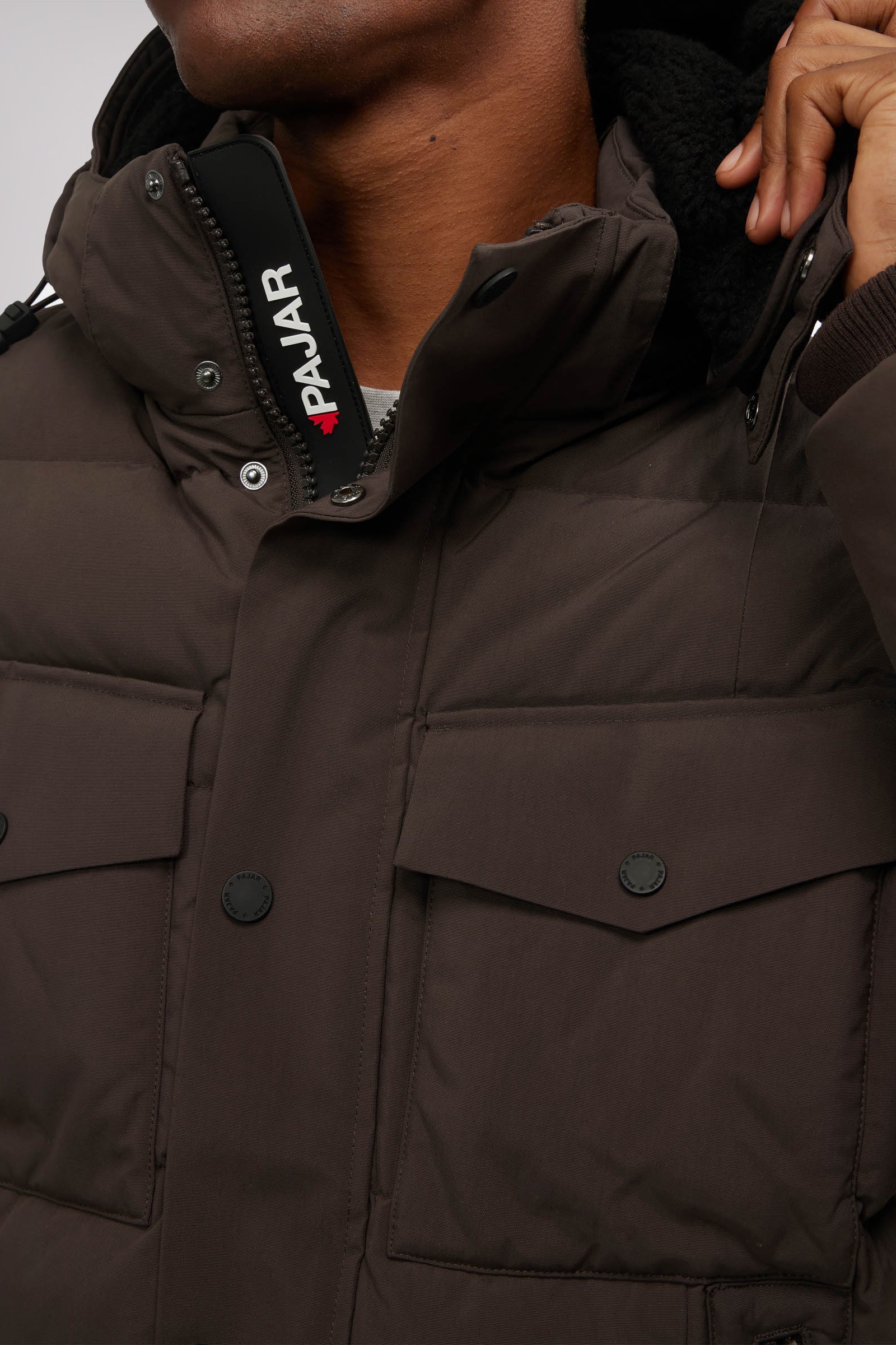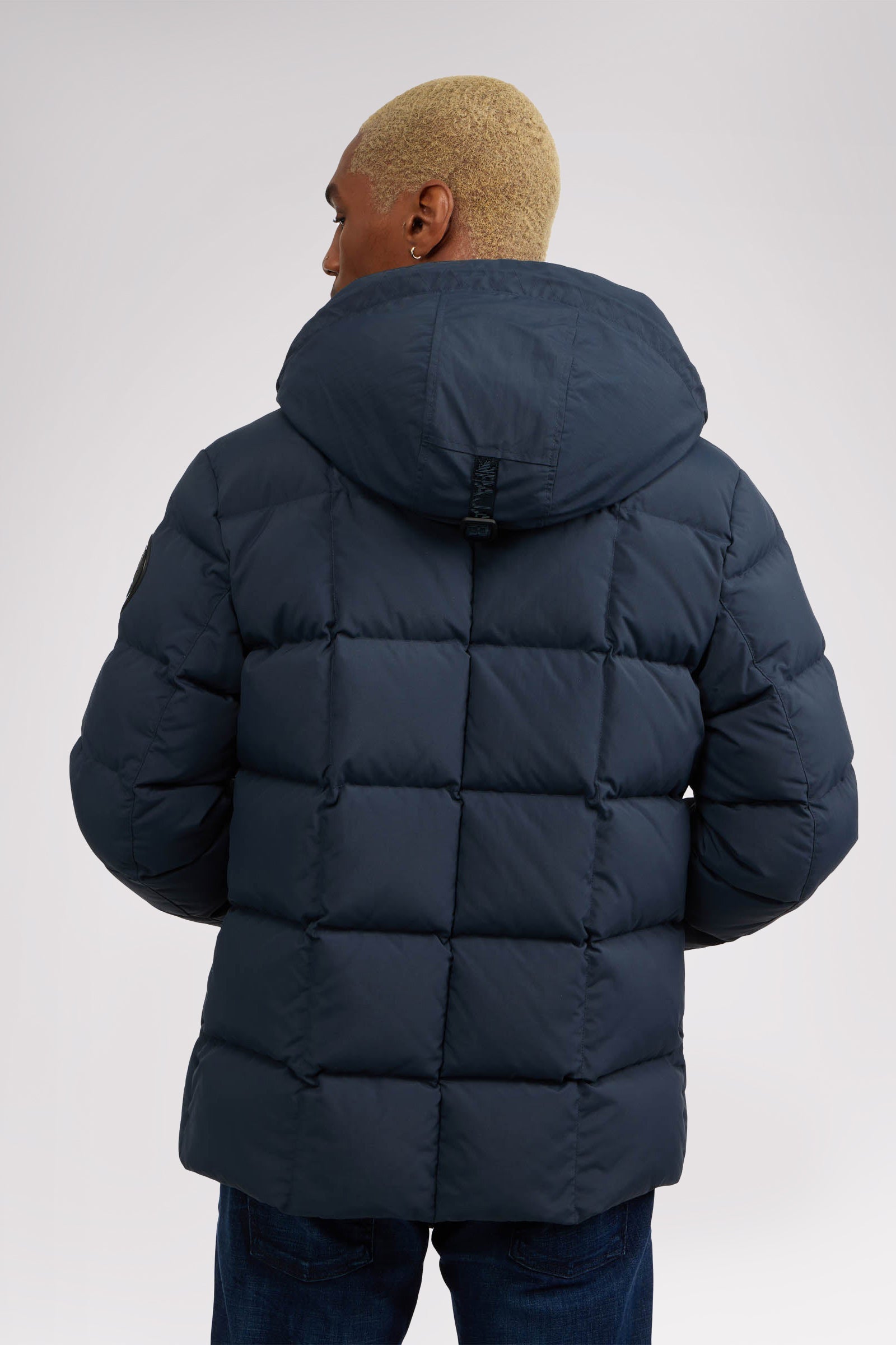 Men’s box quilted puffer with removable hood and detachable sherpa liner. Equipped with zip & snap front placket closure, chest patch pockets and bottom zipper pockets. Cozy rib knit storm cuffs. Adjustable jacquard logo hood tab.