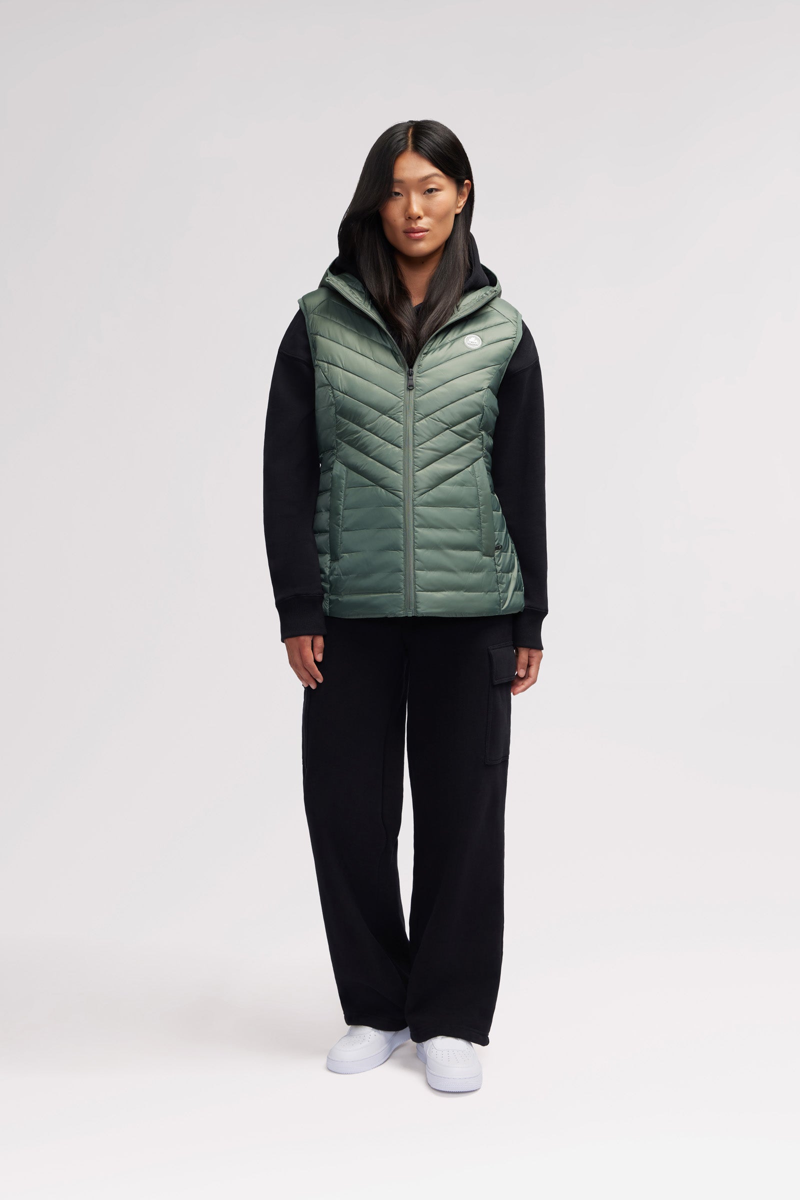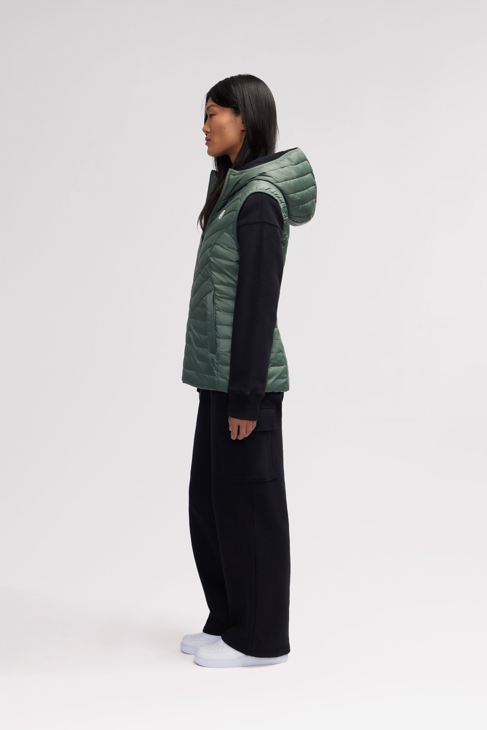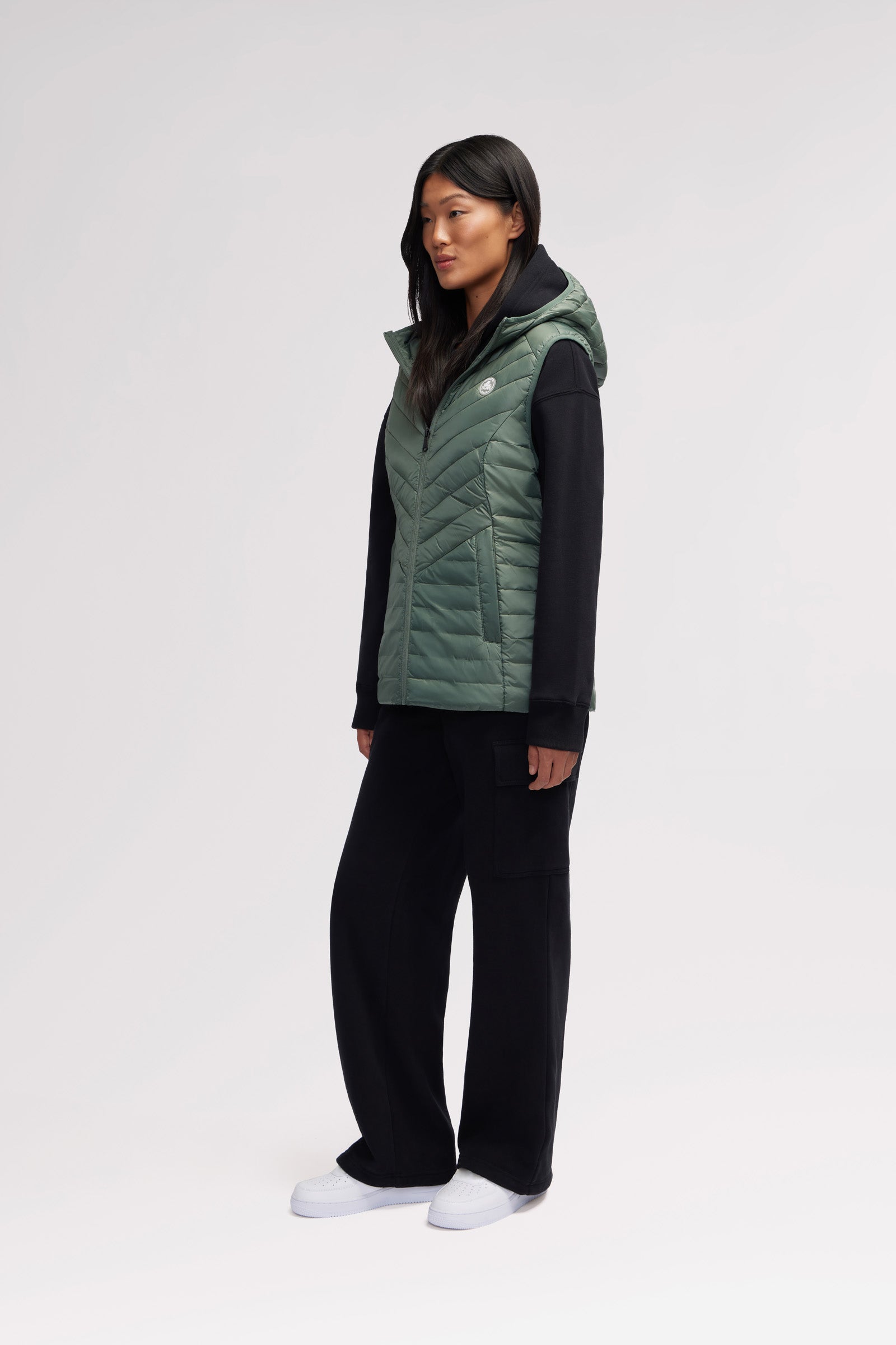 Women’s chevron quilted mixed media lightweight packable 3M Featherless Thinsulate puffer vest. Equipped with an exposed front zipper closure, welt pockets, and fixed hood.