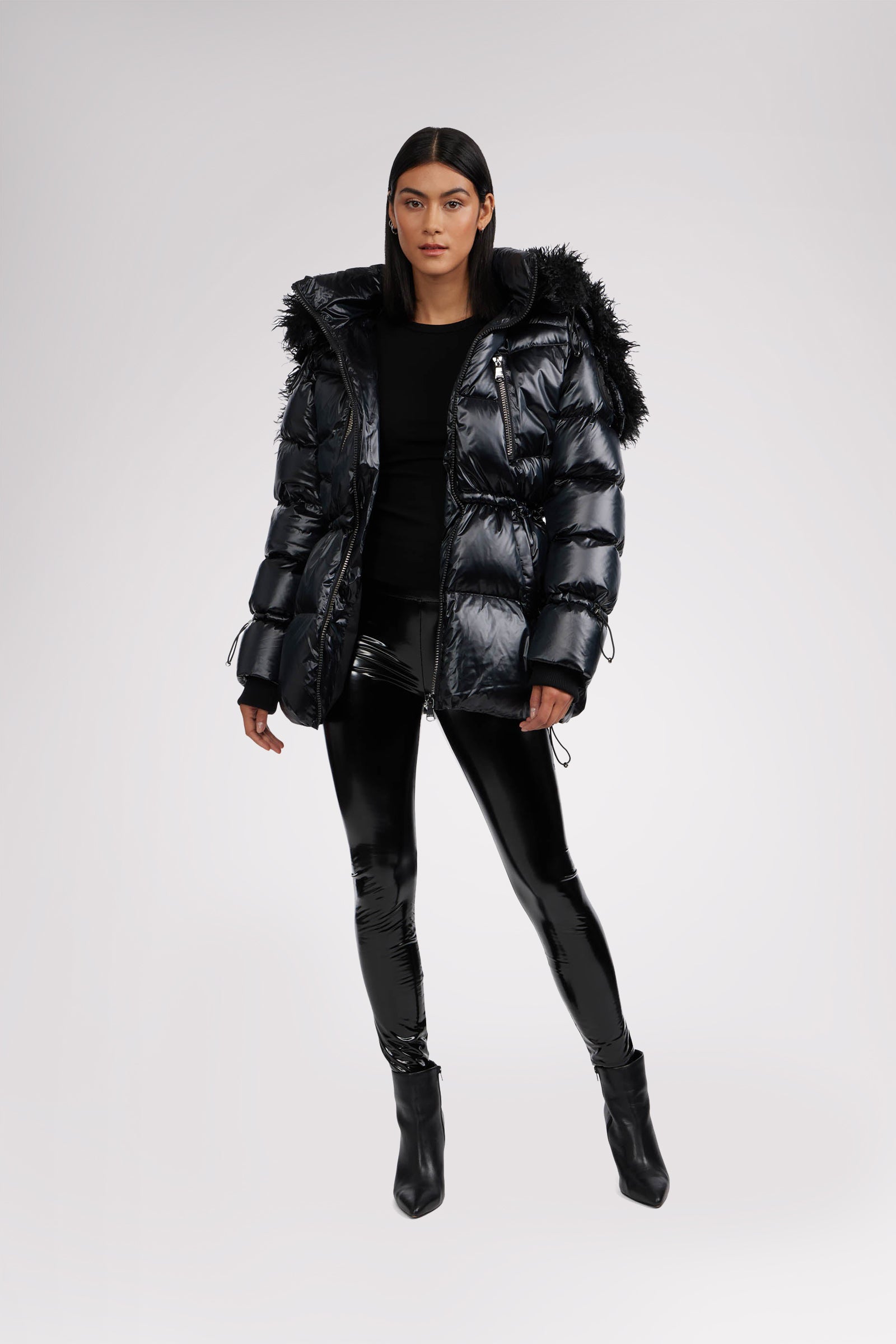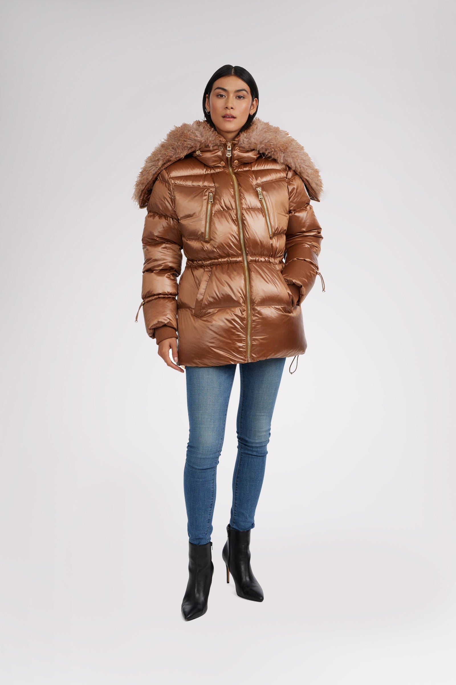 Women’s boxy channel quilted puffer with detachable split zipper hood lined with luxurious Faux Mongolian fur. Equipped with an exposed front zipper closure, angled zippered chest pockets and bottom welt pockets. Adjustable bungee at hood, sleeve cuffs, inside waist & bottom hem. Cozy rib knit storm cuffs.