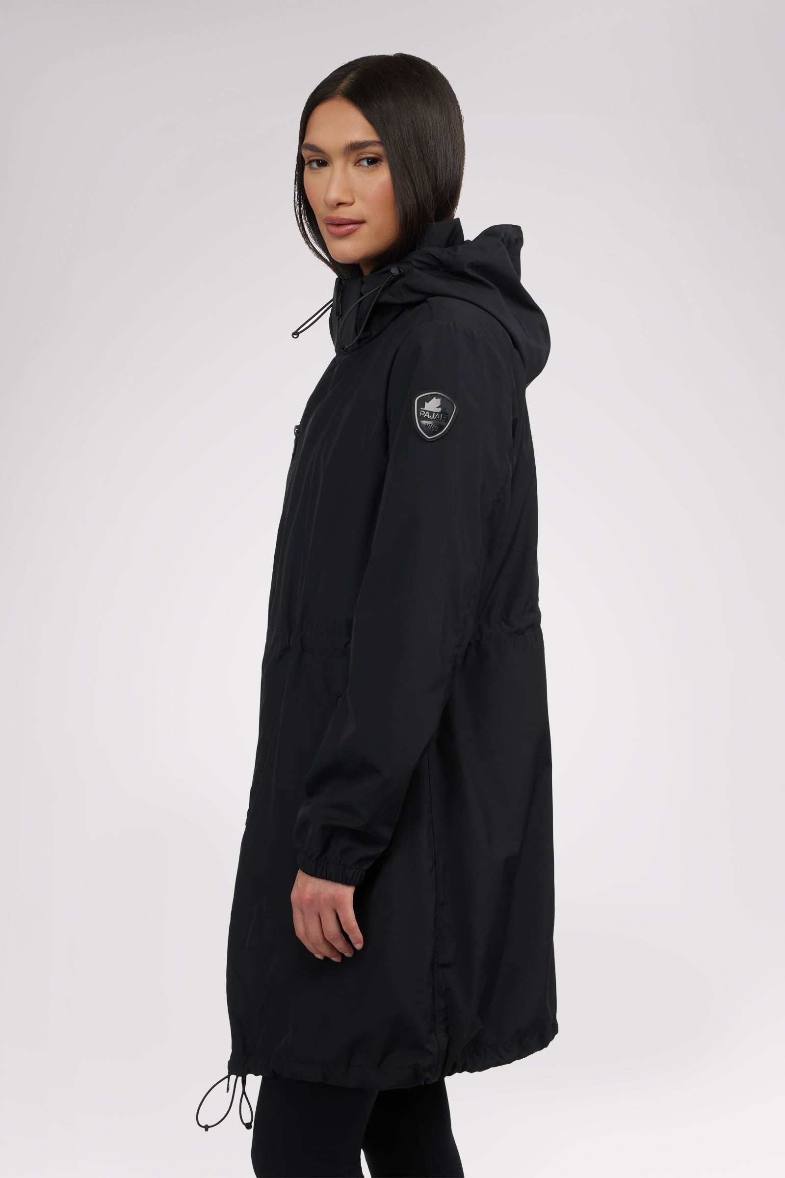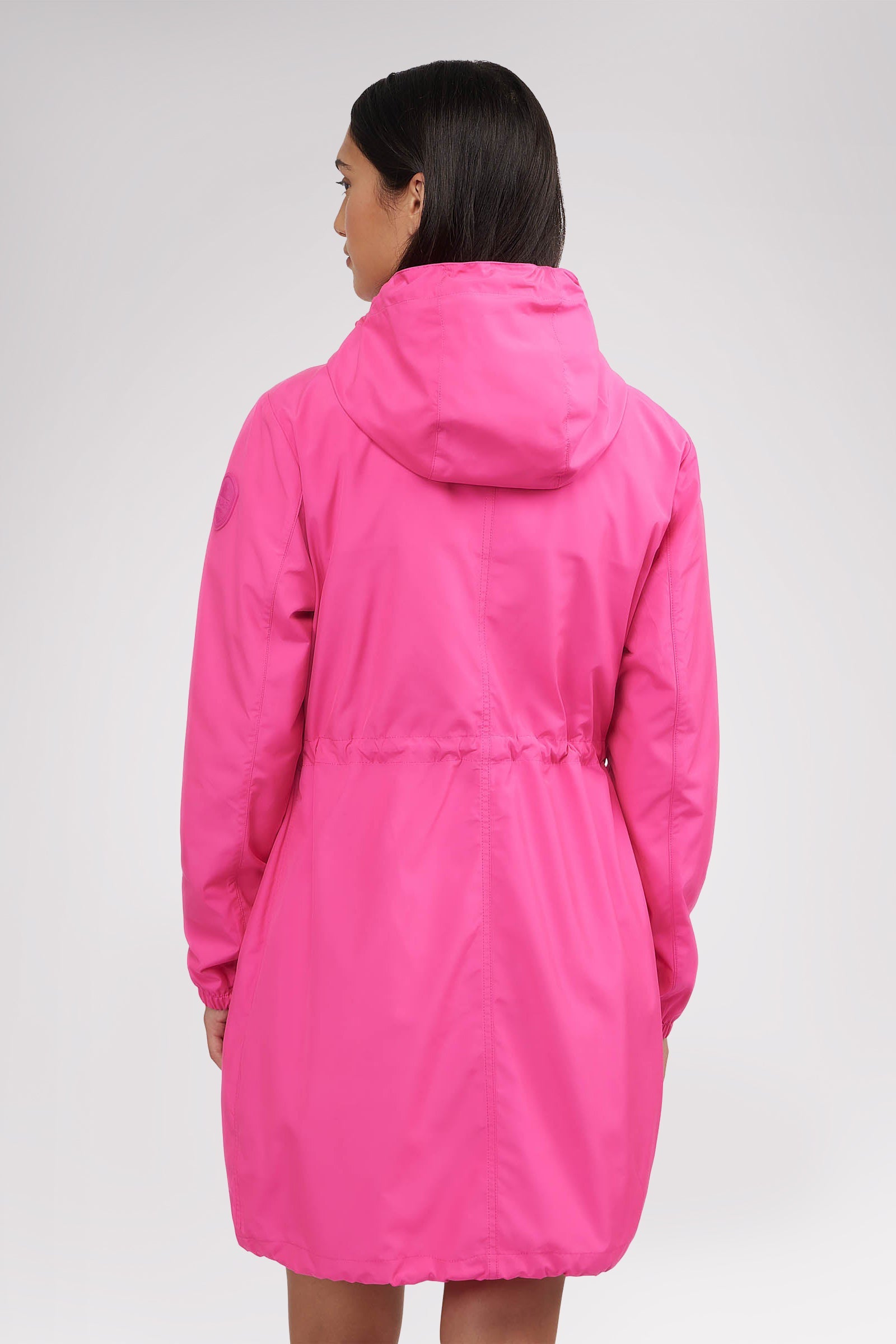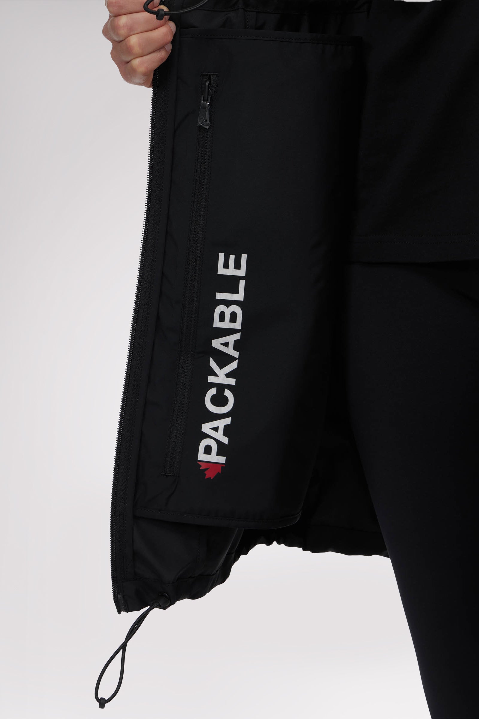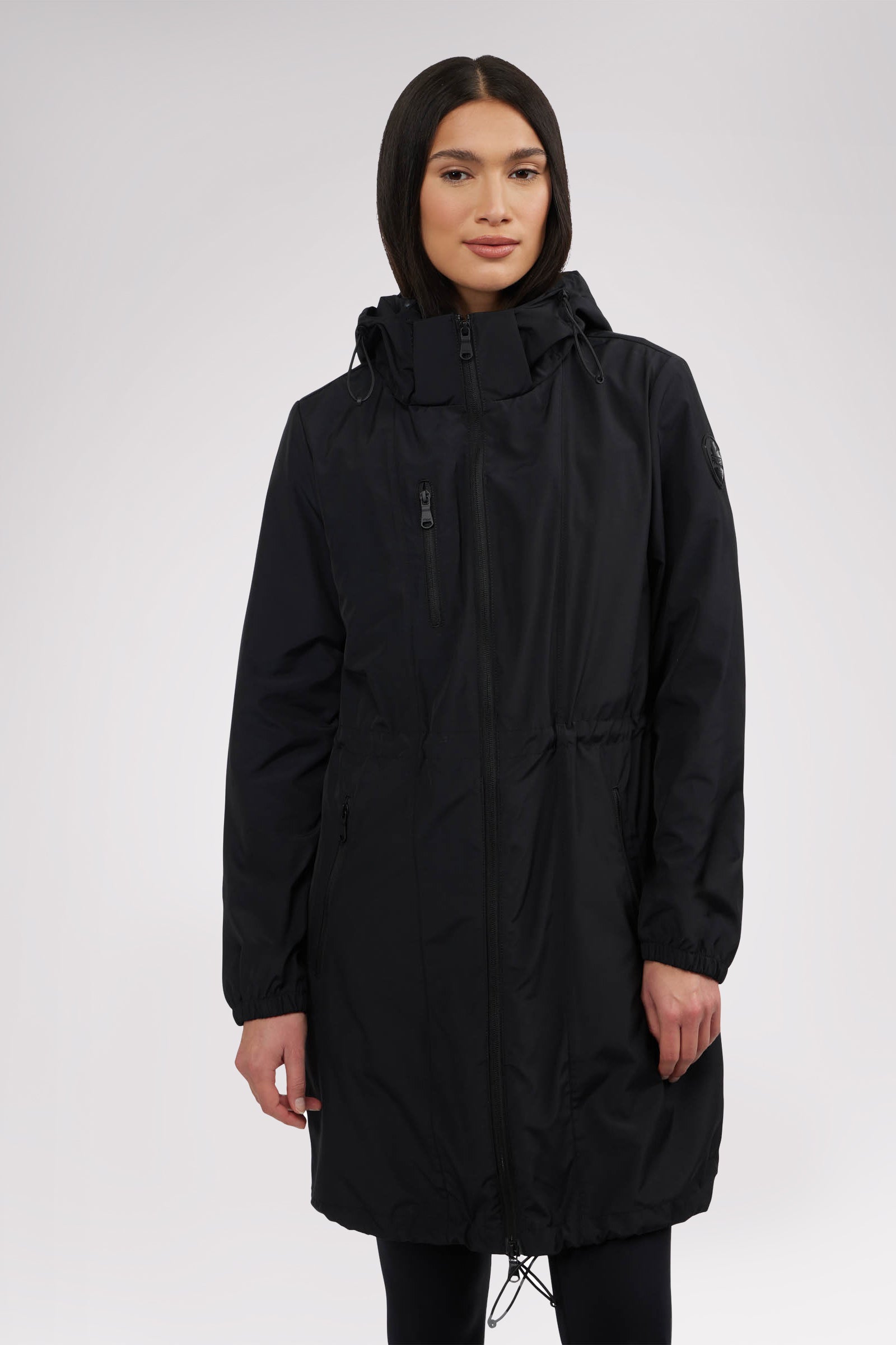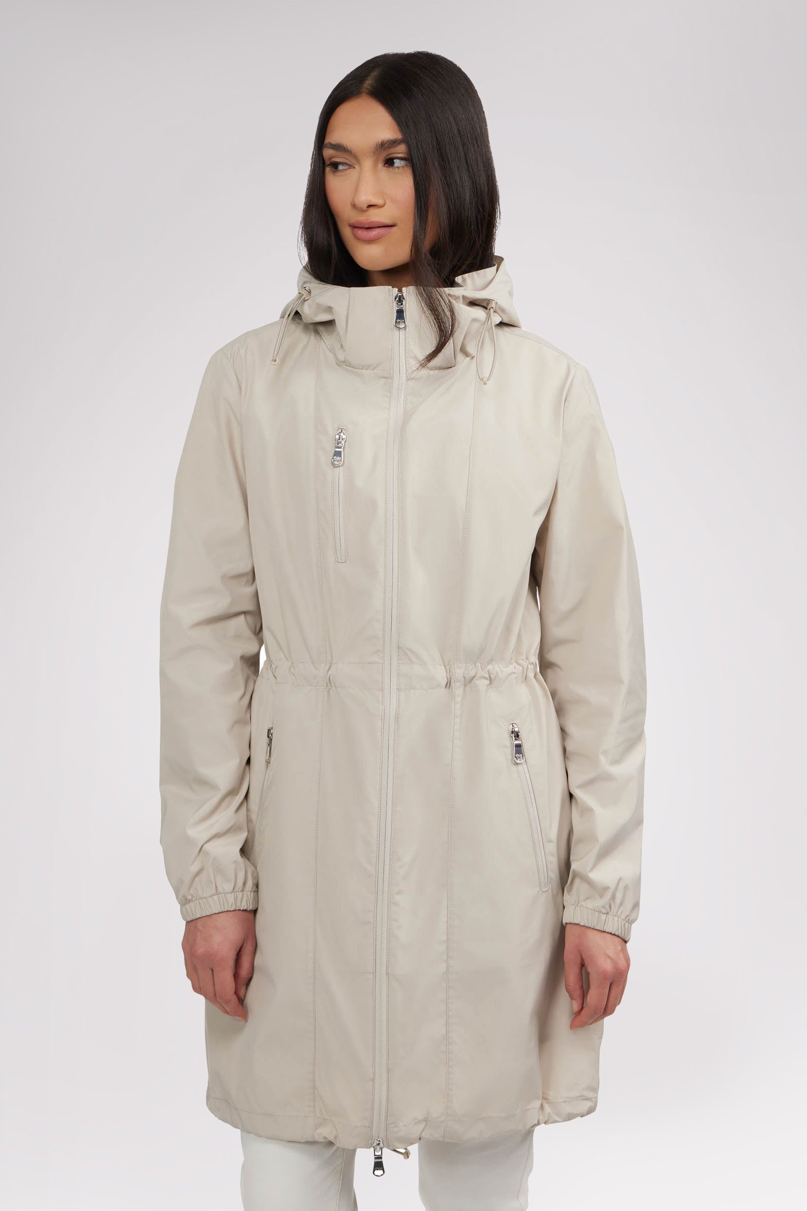 Women’s unlined long packable raincoat. Exposed zip front closure, chest and bottom zipper pockets. Adjustable cords at waist, hood and bottom hem. Interior zipper chest pocket and large packable pocket bag to pack jacket inside.