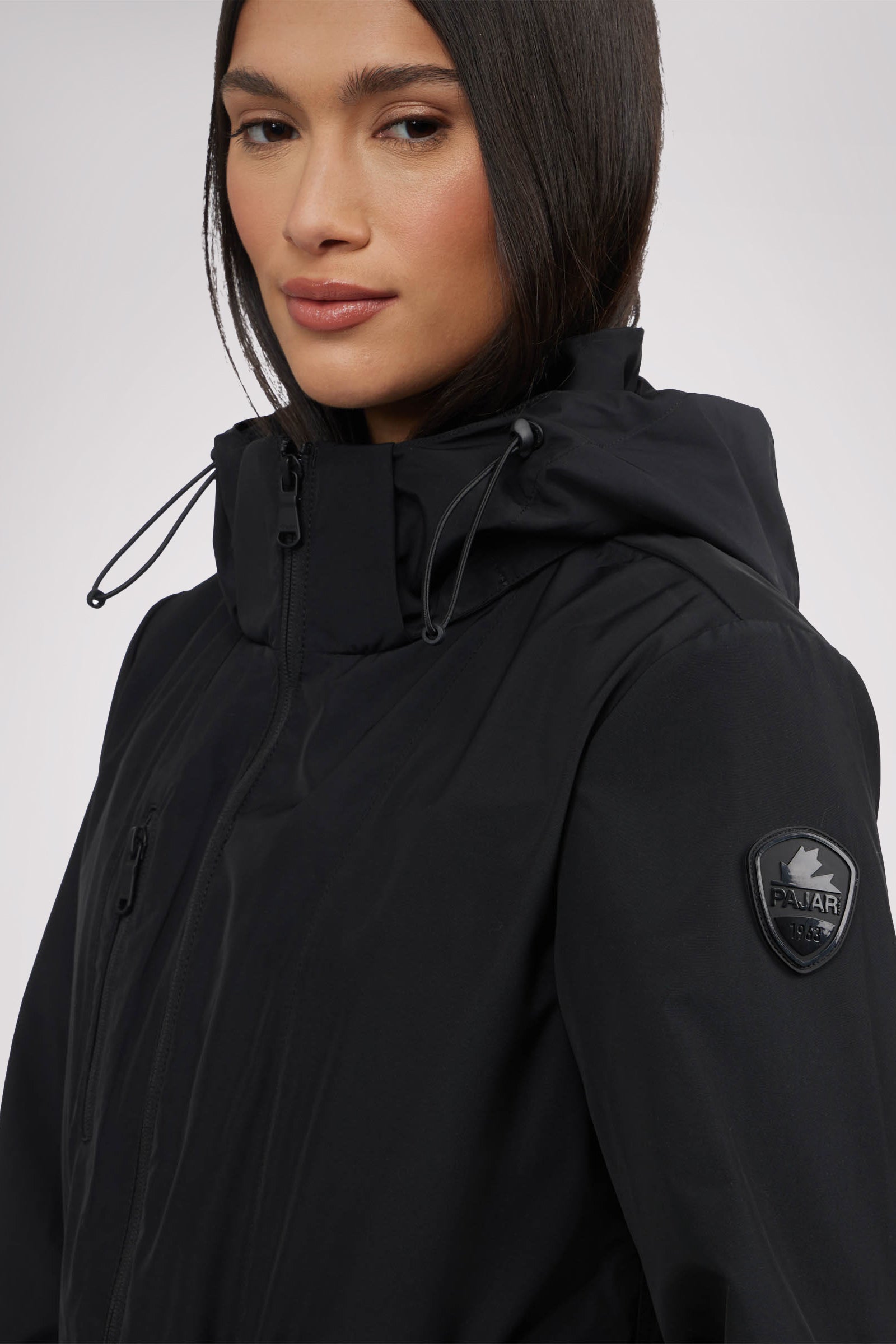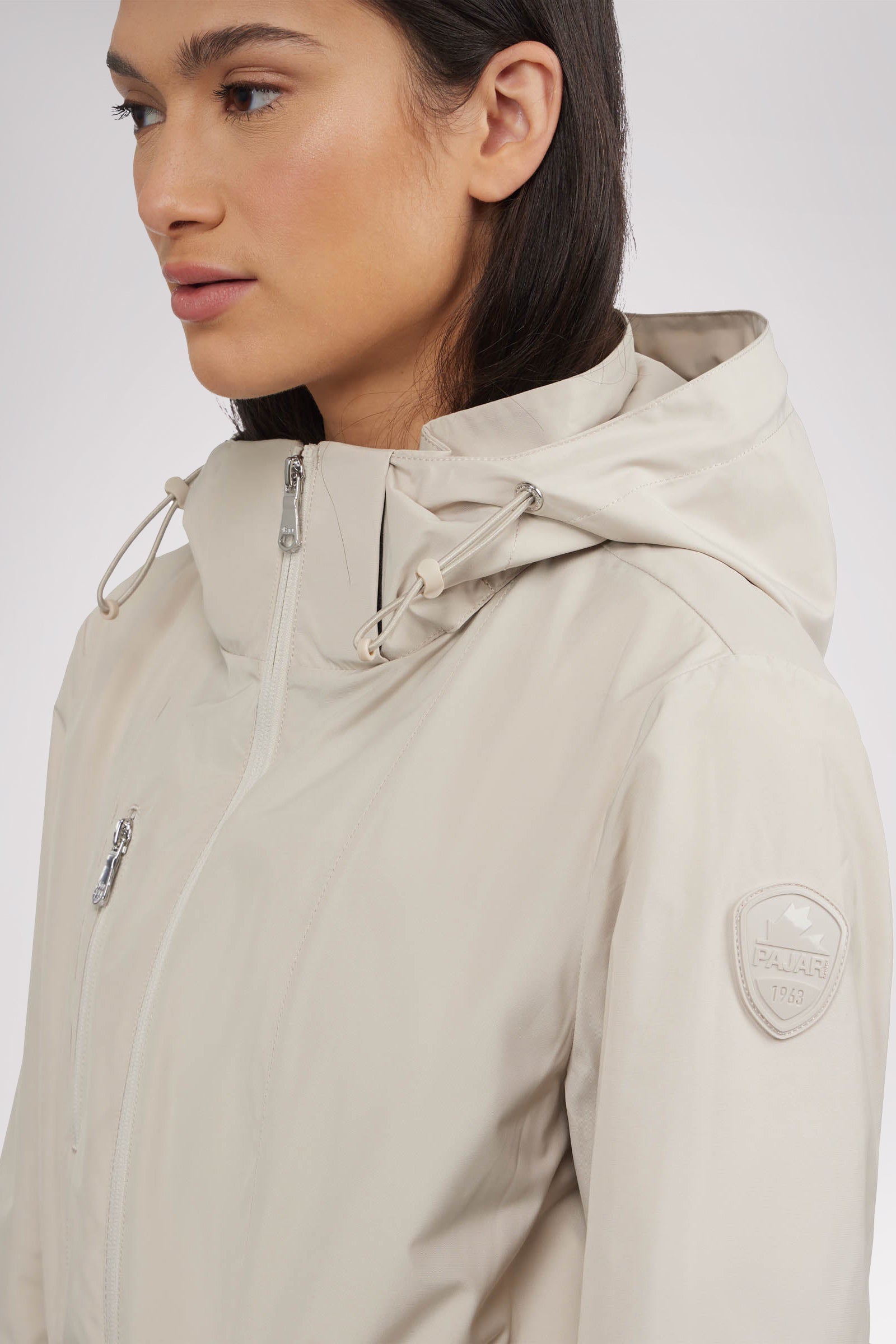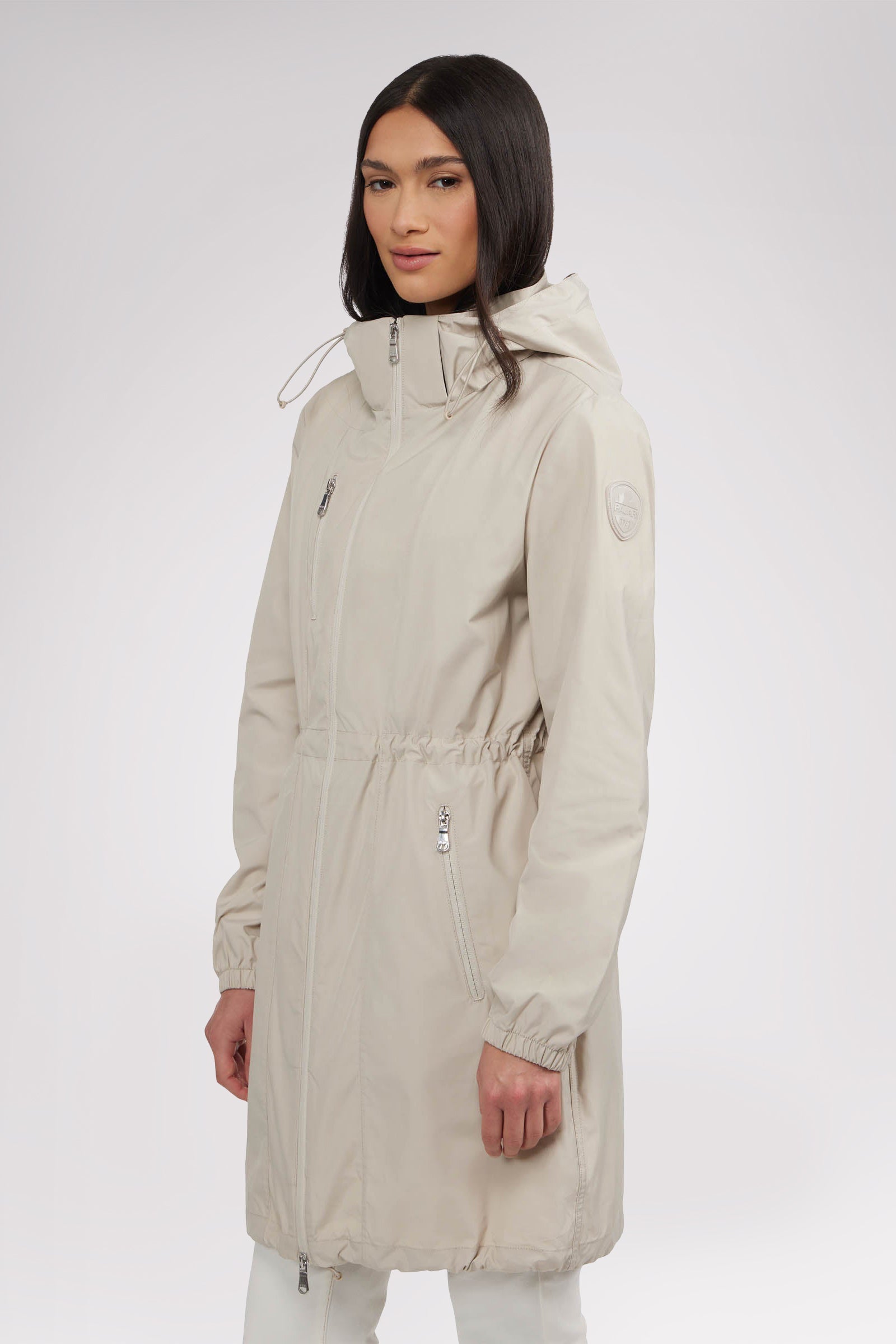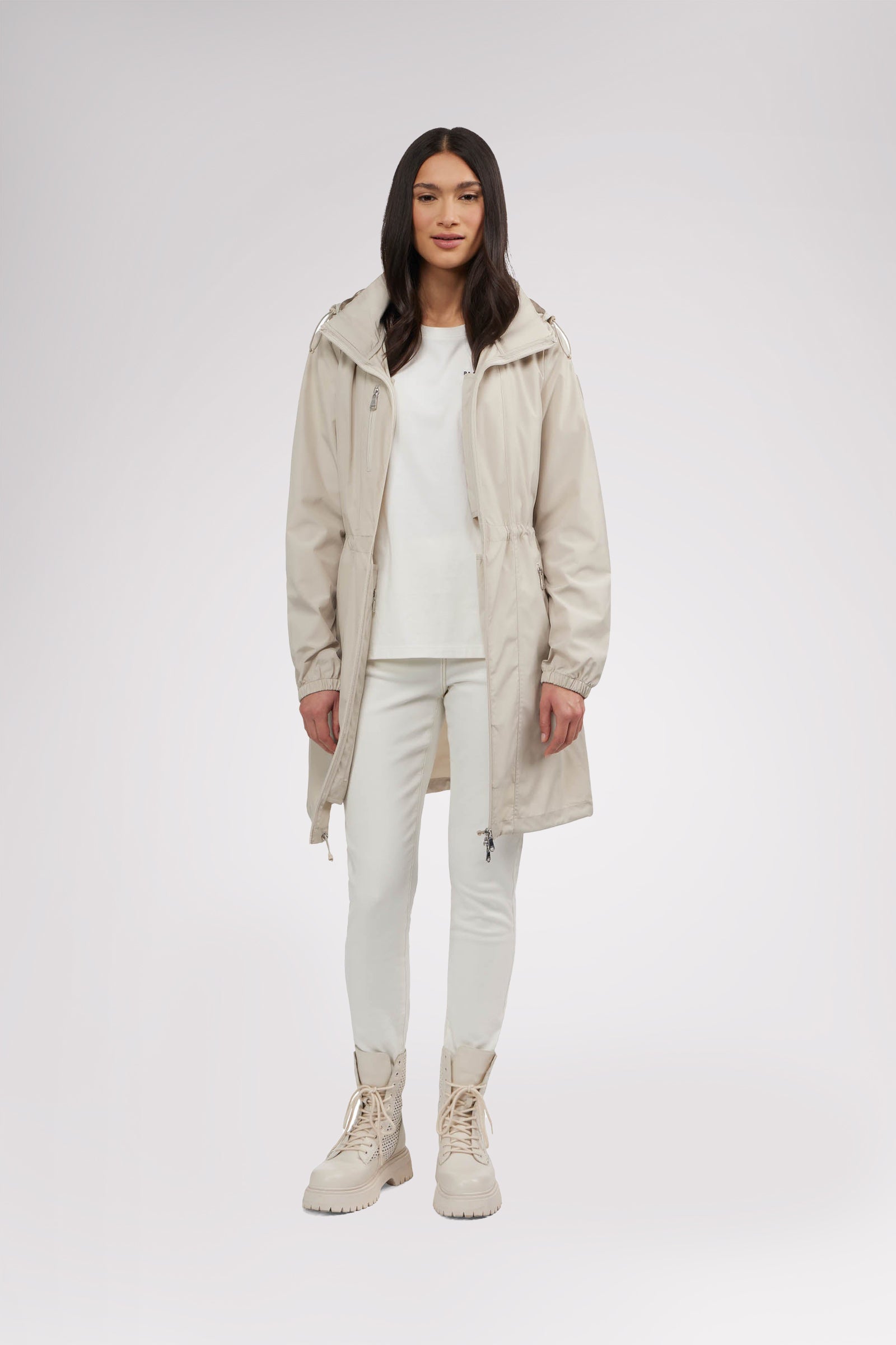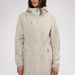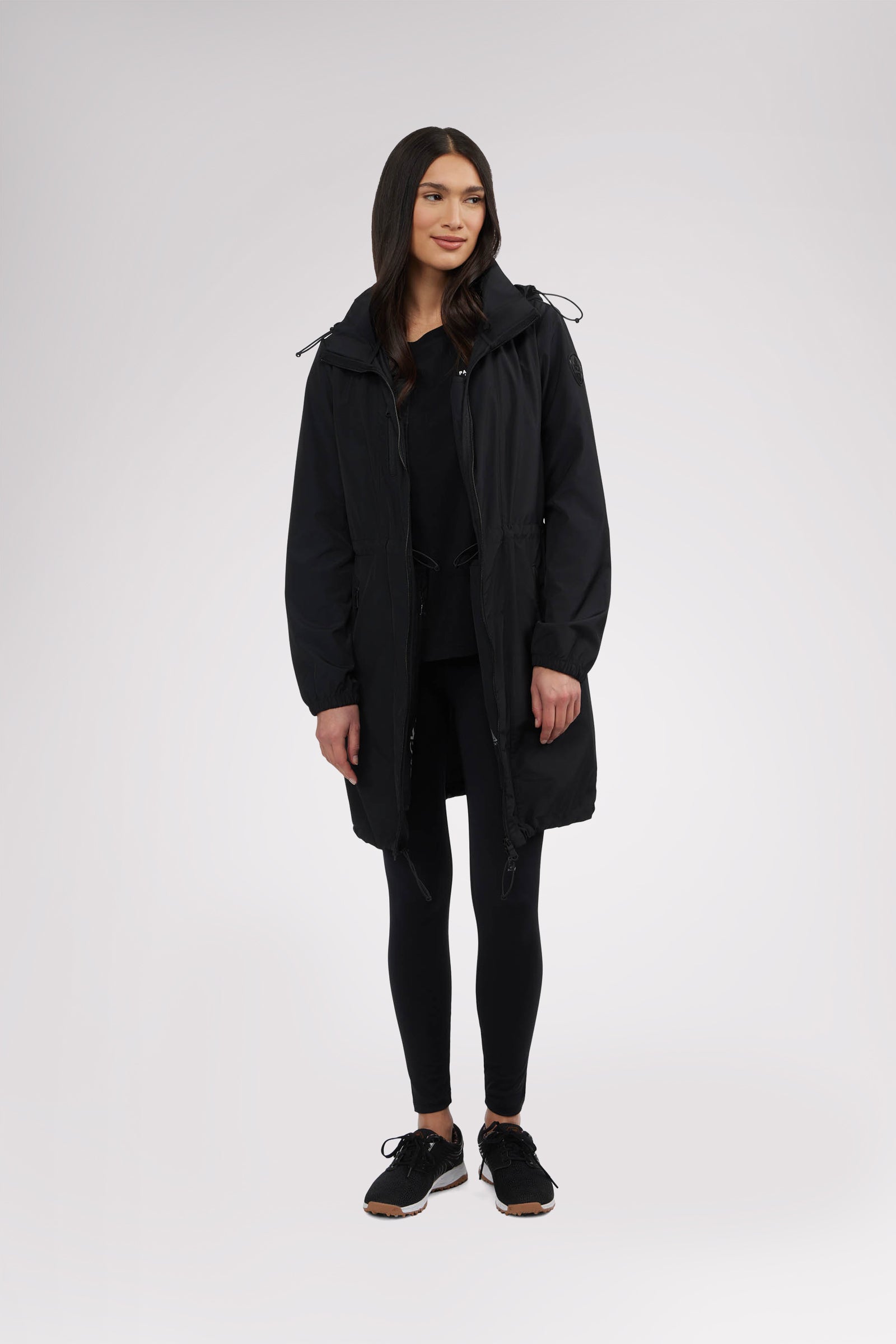 Women’s unlined long packable raincoat. Exposed zip front closure, chest and bottom zipper pockets. Adjustable cords at waist, hood and bottom hem. Interior zipper chest pocket and large packable pocket bag to pack jacket inside.