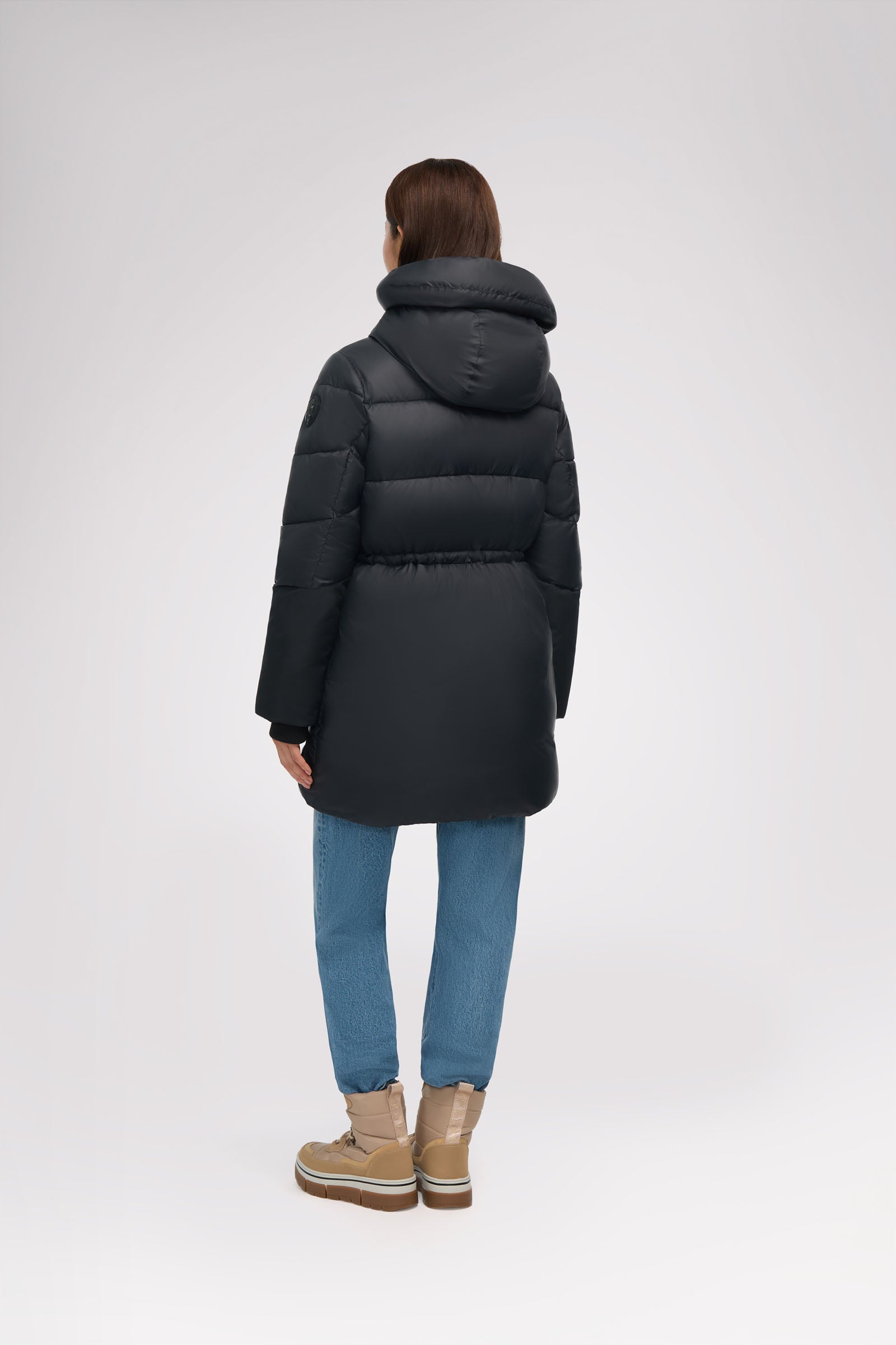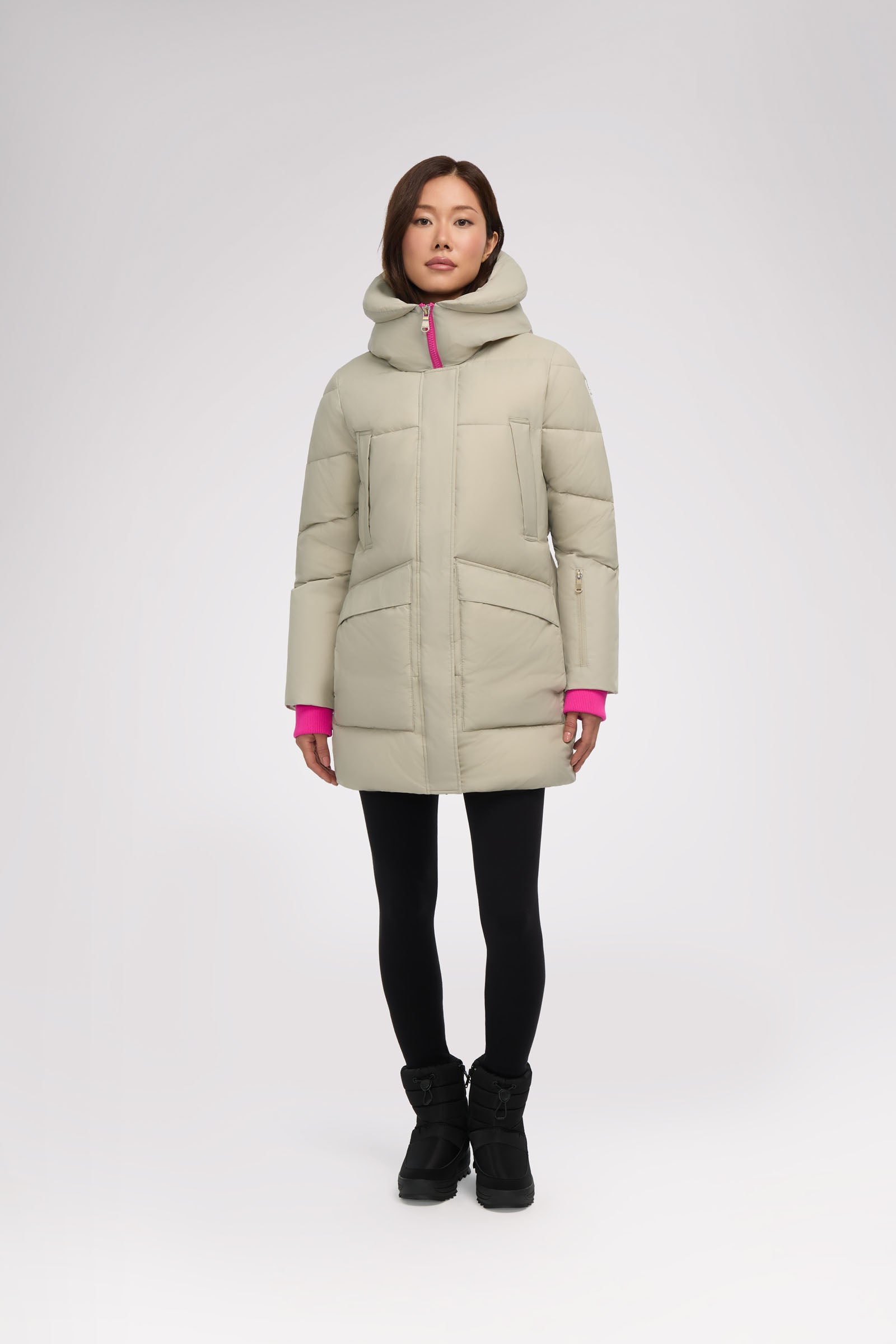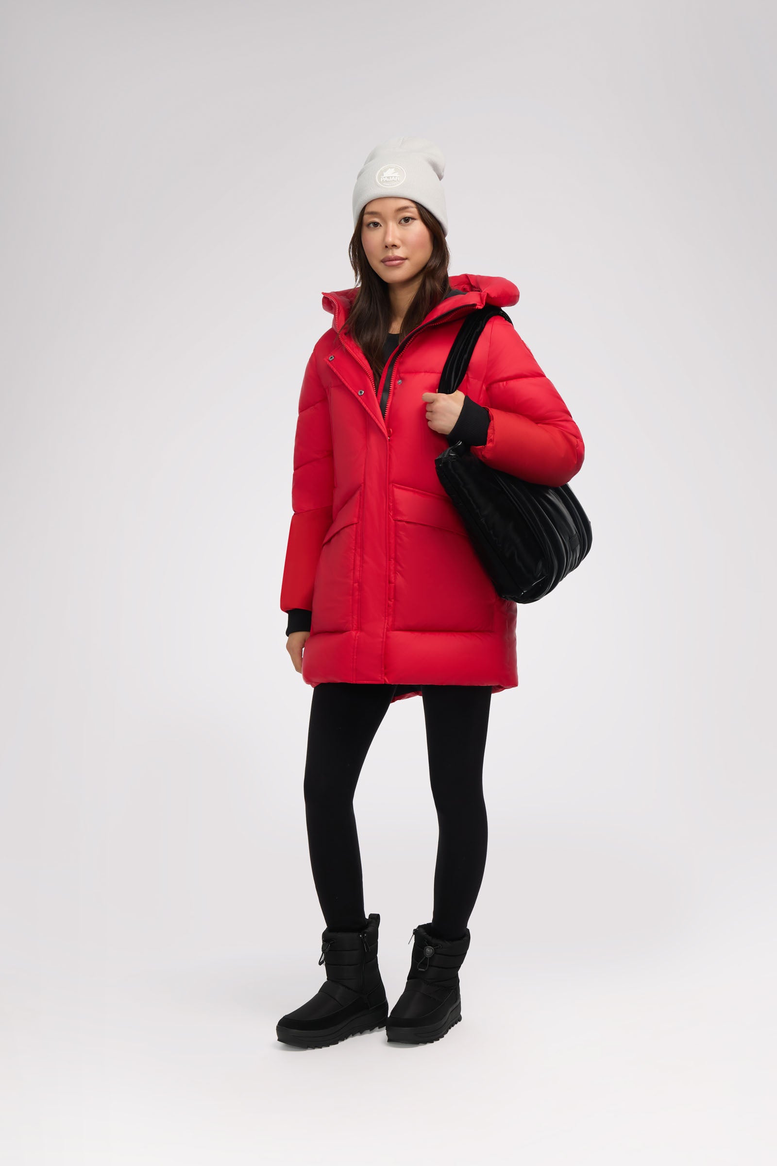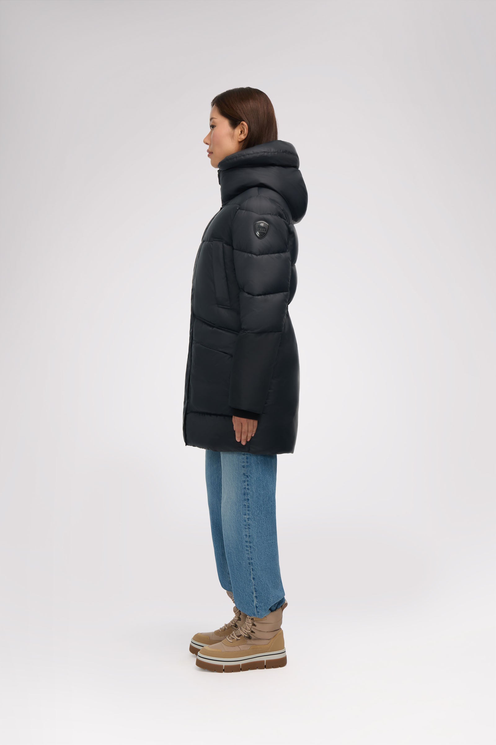 • Women’s mid-length quilted parka puffer with oversized fixed hood