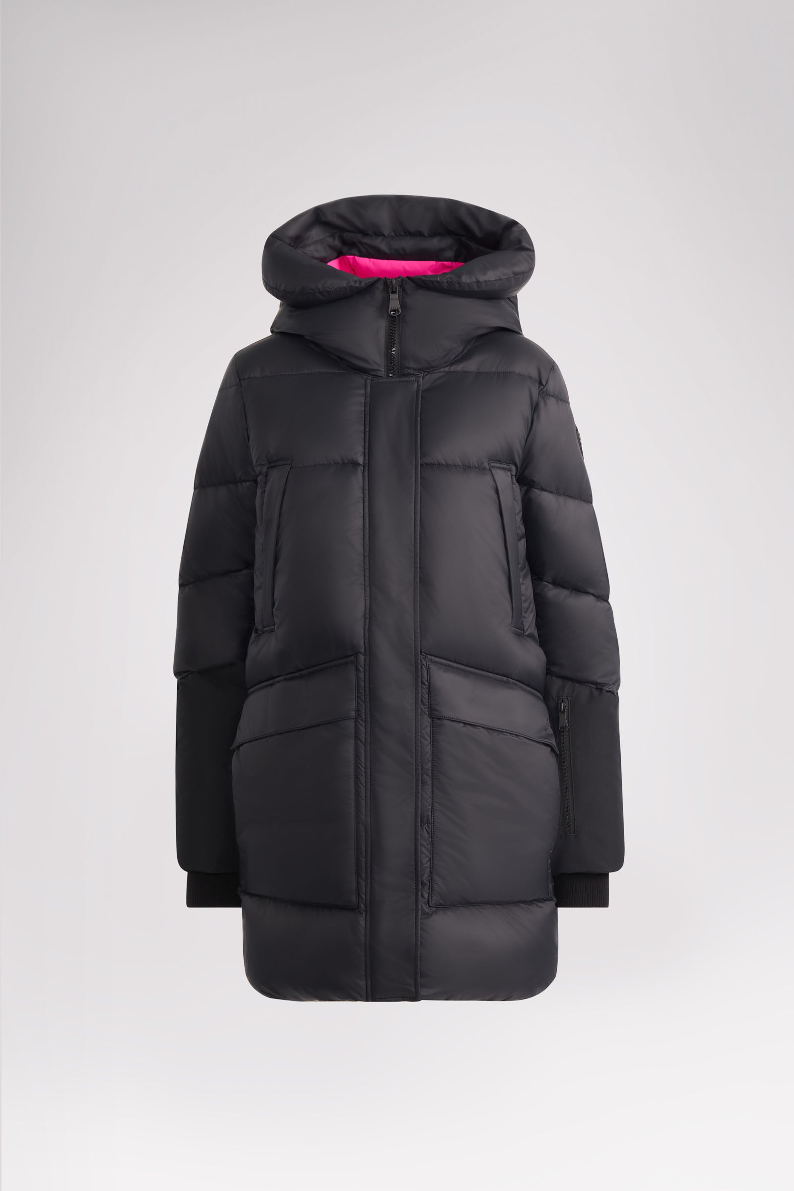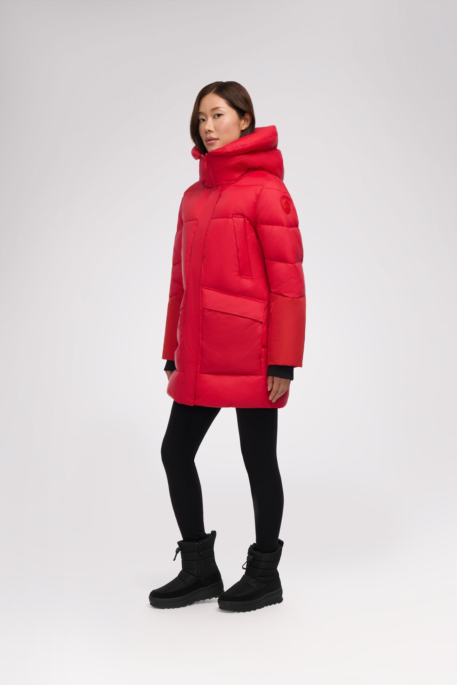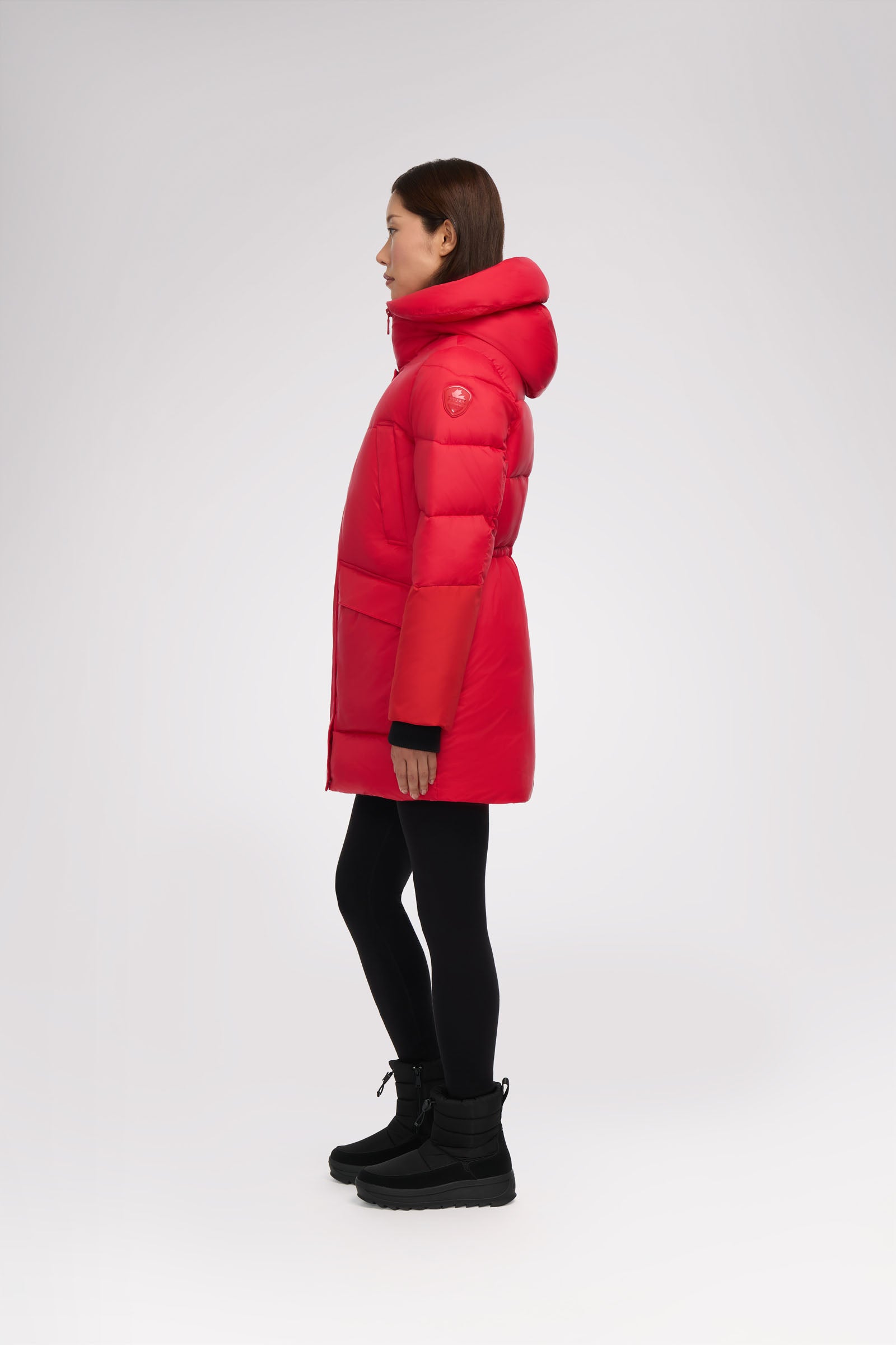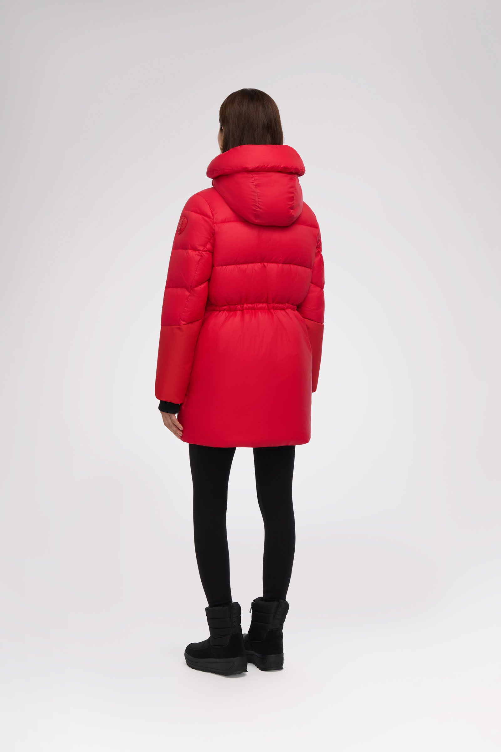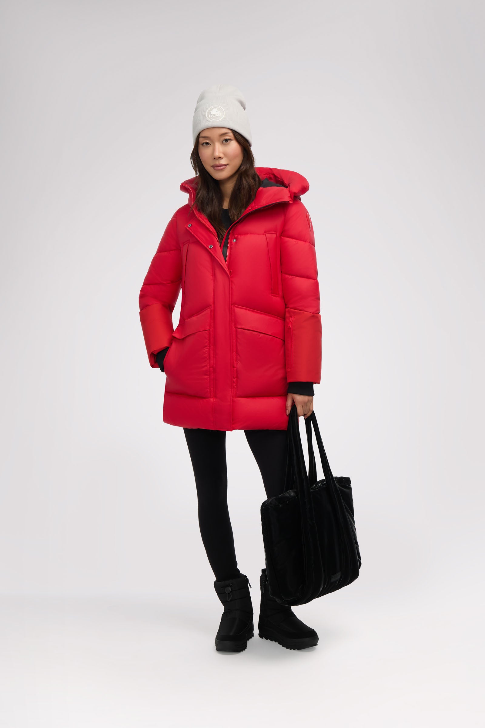 • Women’s mid-length quilted parka puffer with oversized fixed hood
