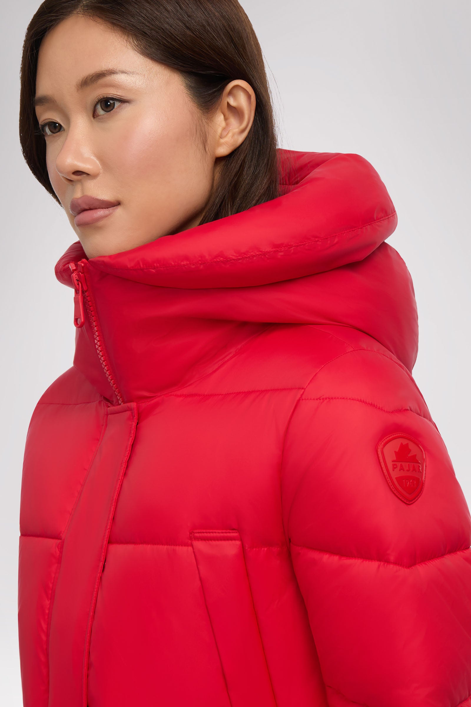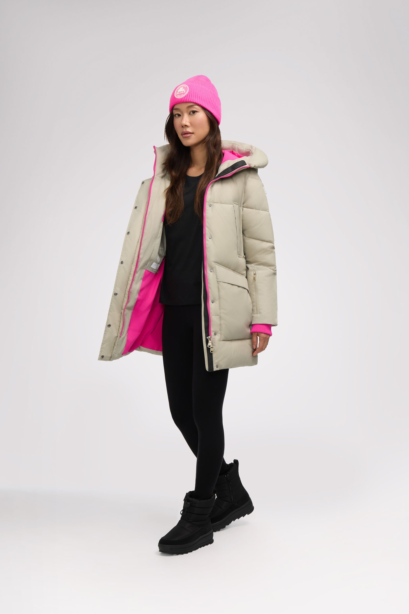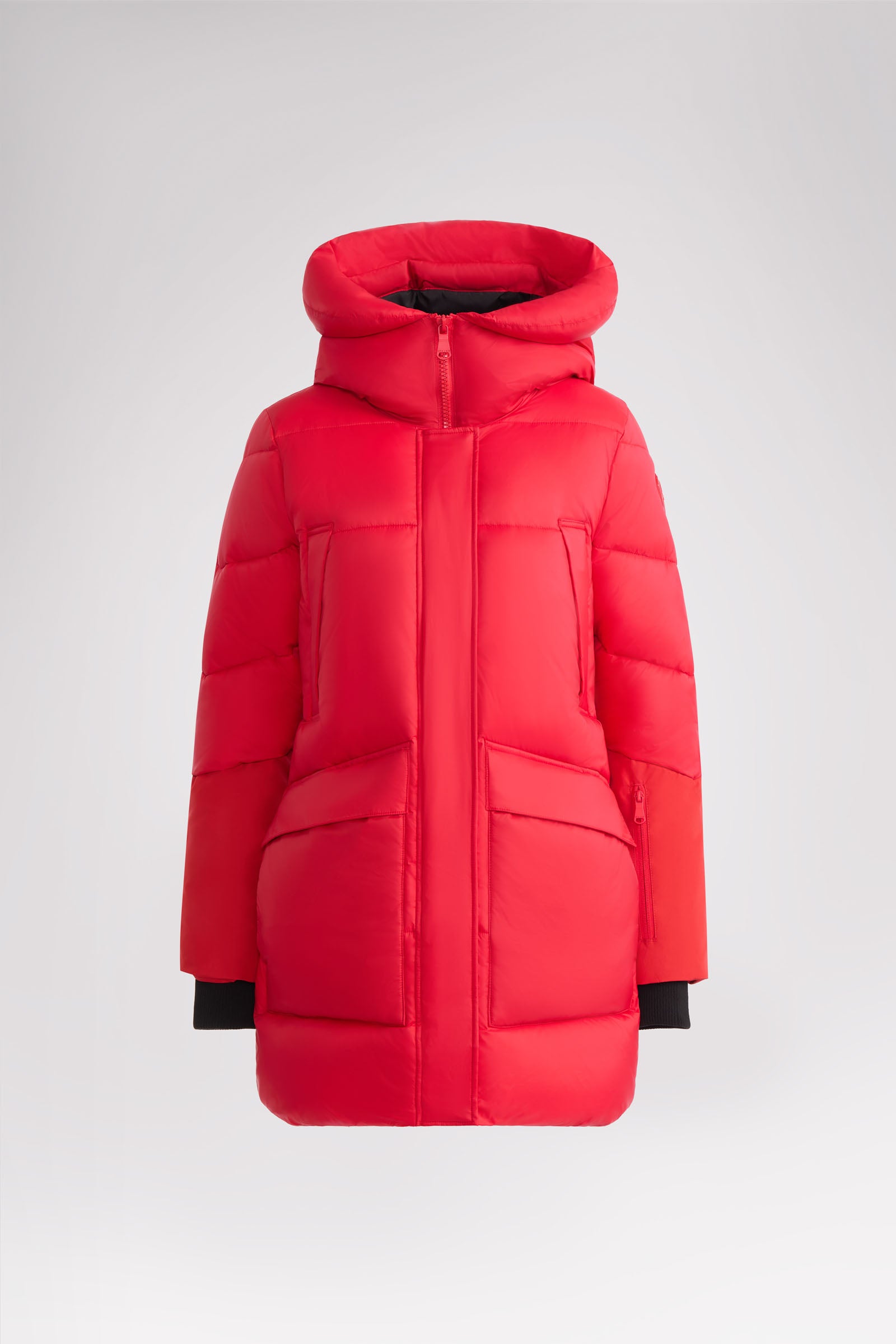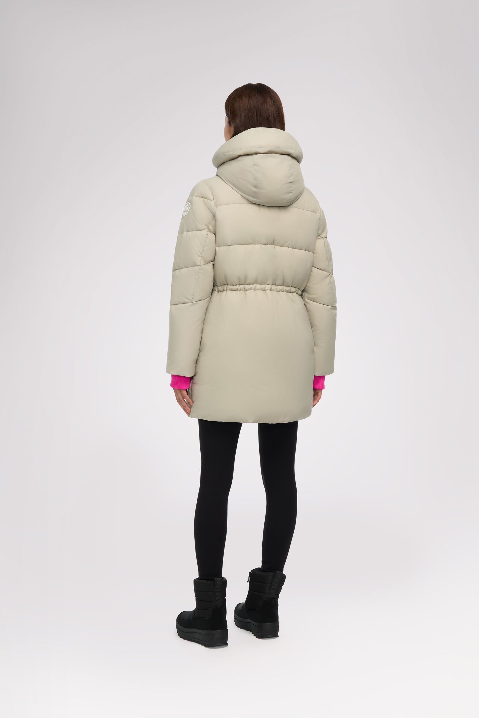 • Women’s mid-length quilted parka puffer with oversized fixed hood