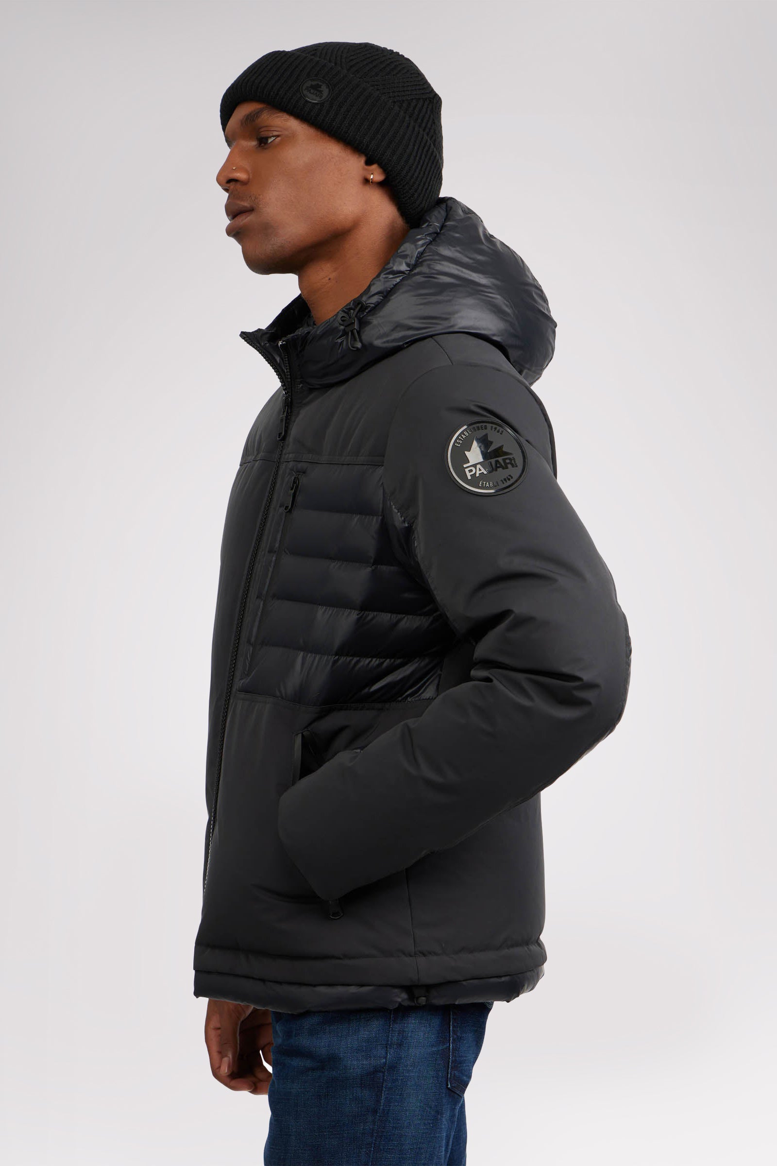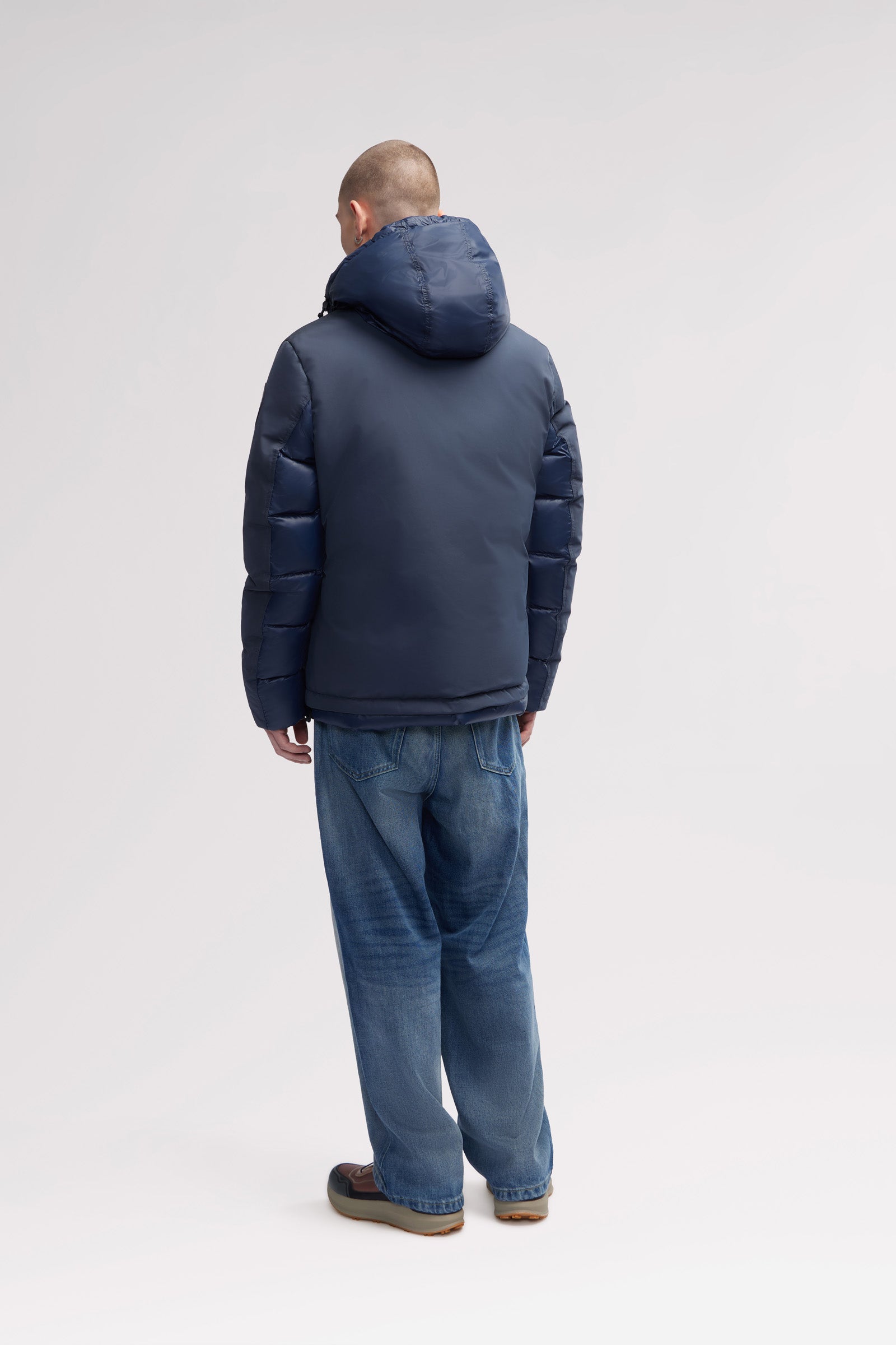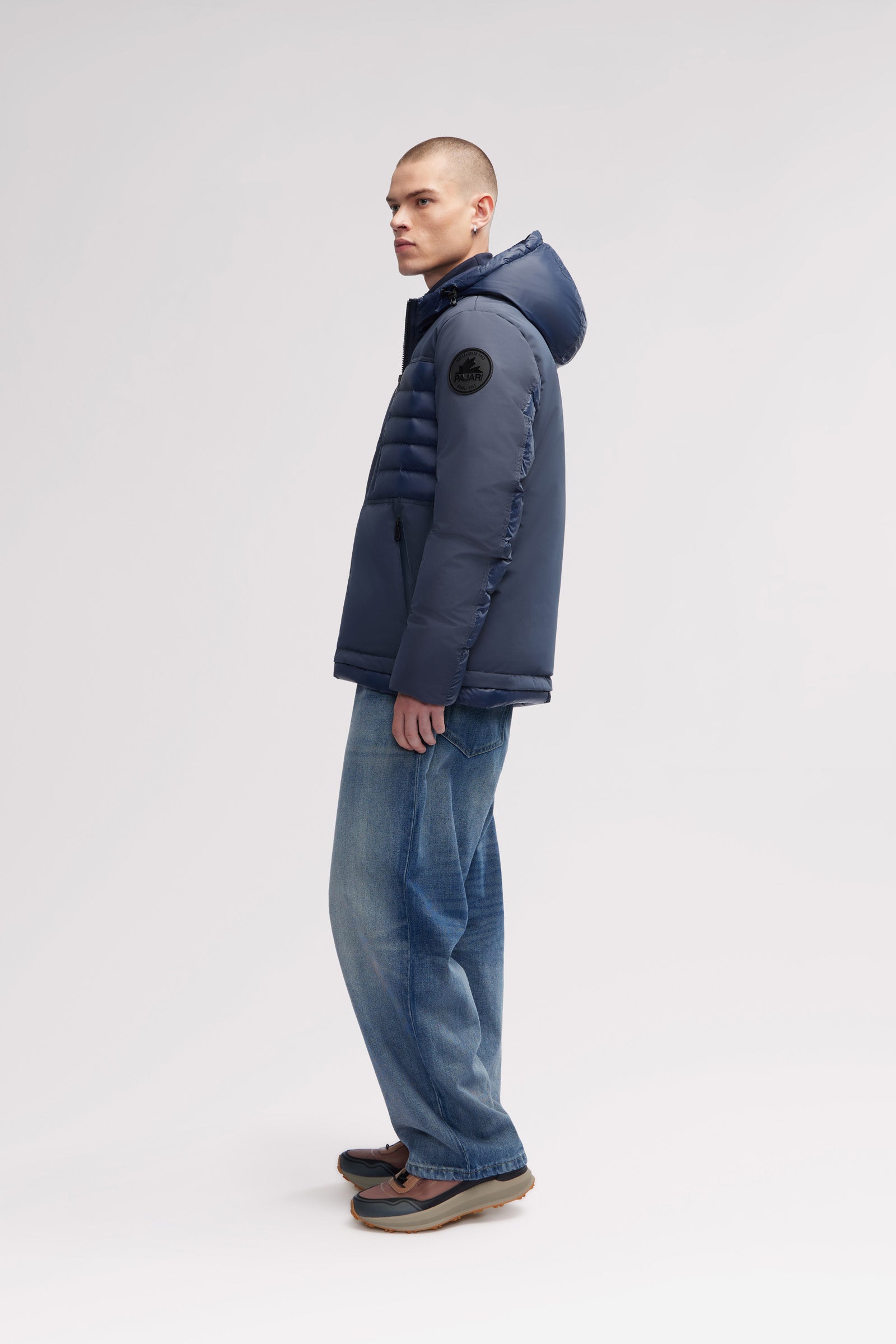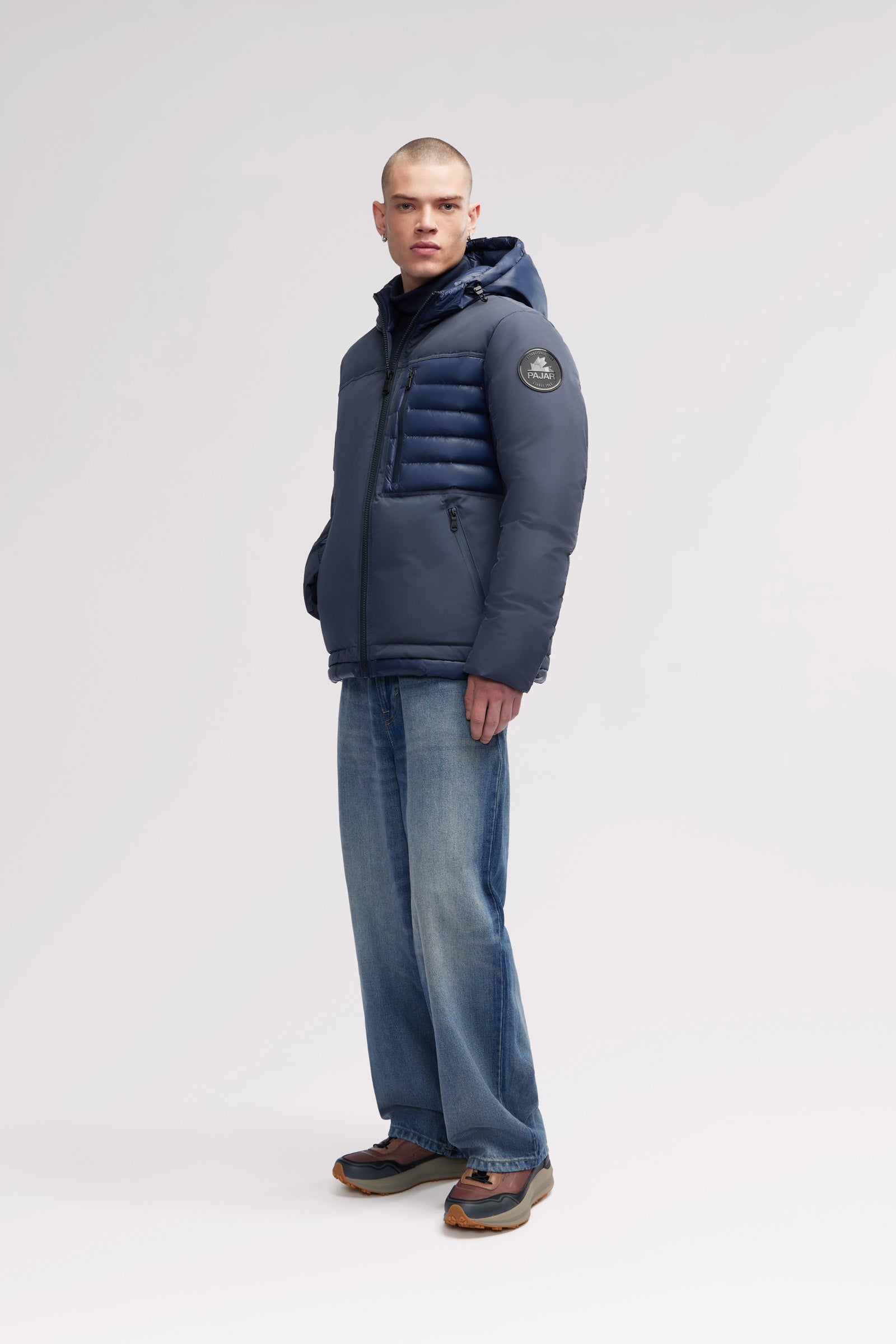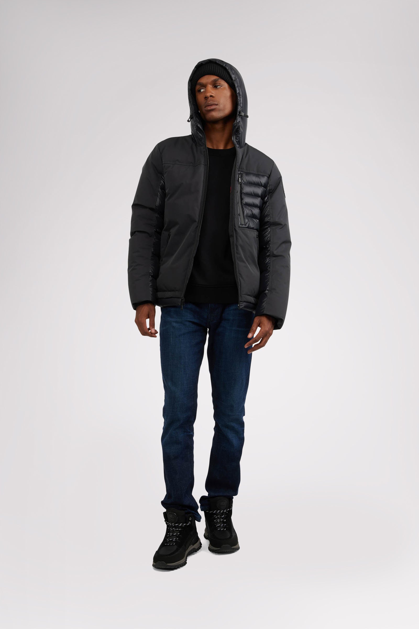 Men’s mixed-media channel quilted lightweight downfill jacket. Equipped with fixed hood, exposed zip front closure, zipper chest pocket & bottom zipper angled pockets. Adjustable bungee cords at hood & bottom hem. Sleek jersey knit storm cuffs.