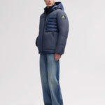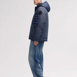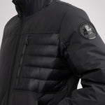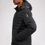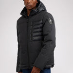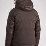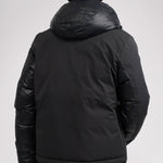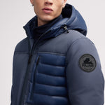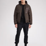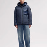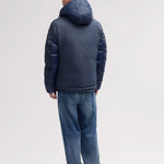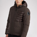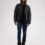 Men’s mixed-media channel quilted lightweight downfill jacket. Equipped with fixed hood, exposed zip front closure, zipper chest pocket & bottom zipper angled pockets. Adjustable bungee cords at hood & bottom hem. Sleek jersey knit storm cuffs.