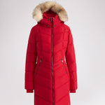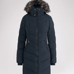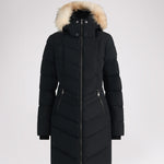 Chevron quilted puffer with detachable hood & faux fur trim. Combo nylon cire side panels. Equipped with exposed bottom zipper pockets and zip front closure & cozy rib knit storm cuffs.