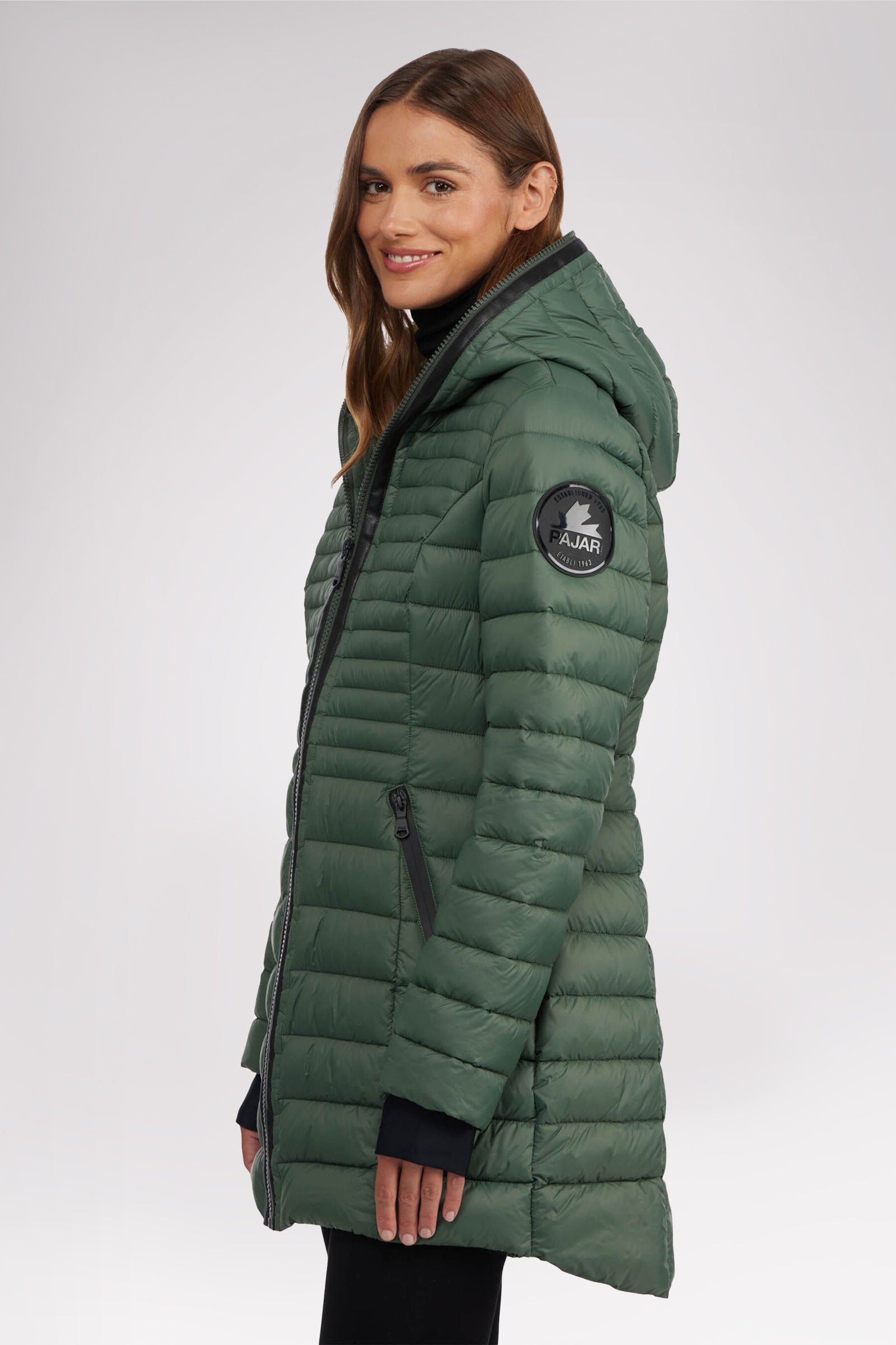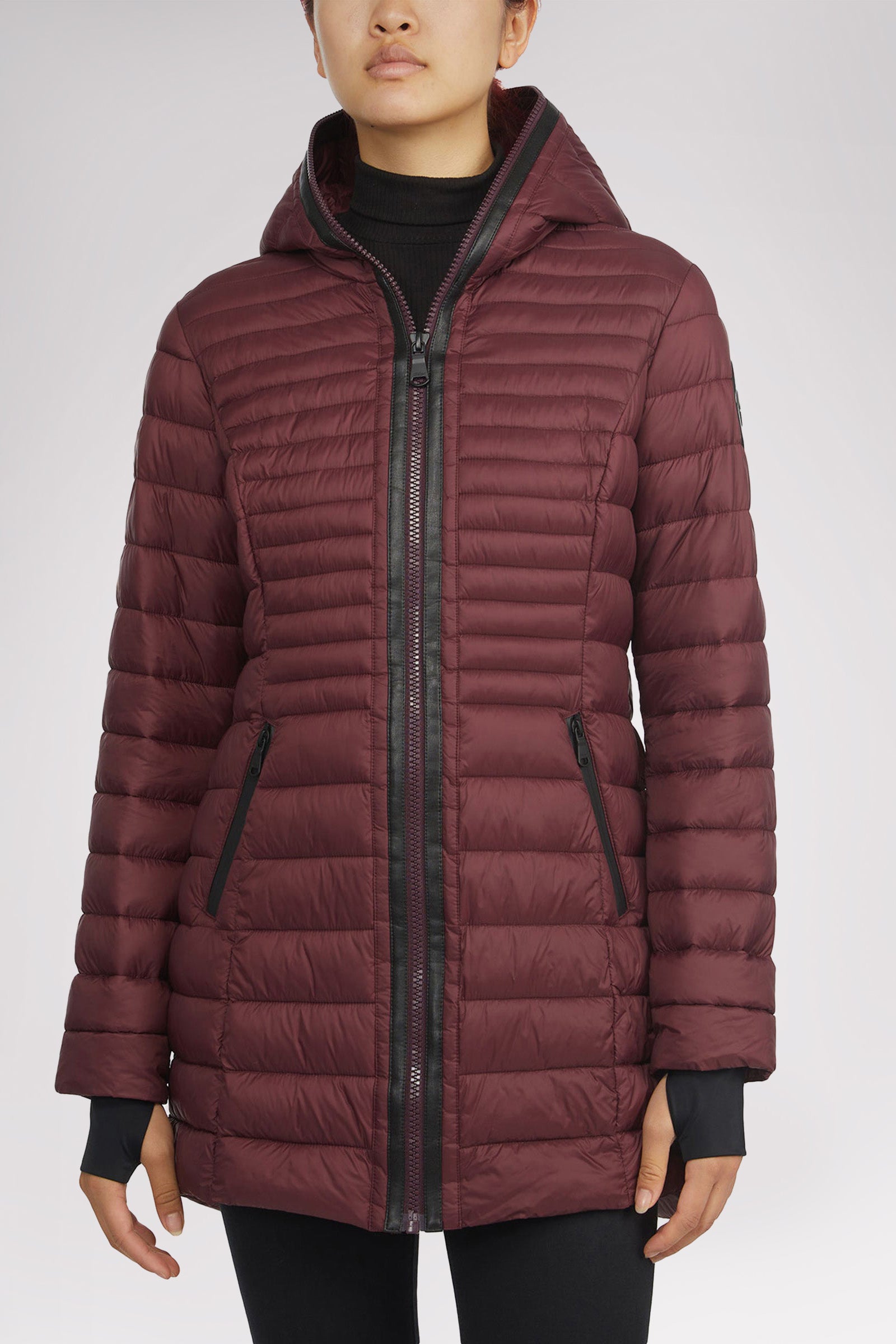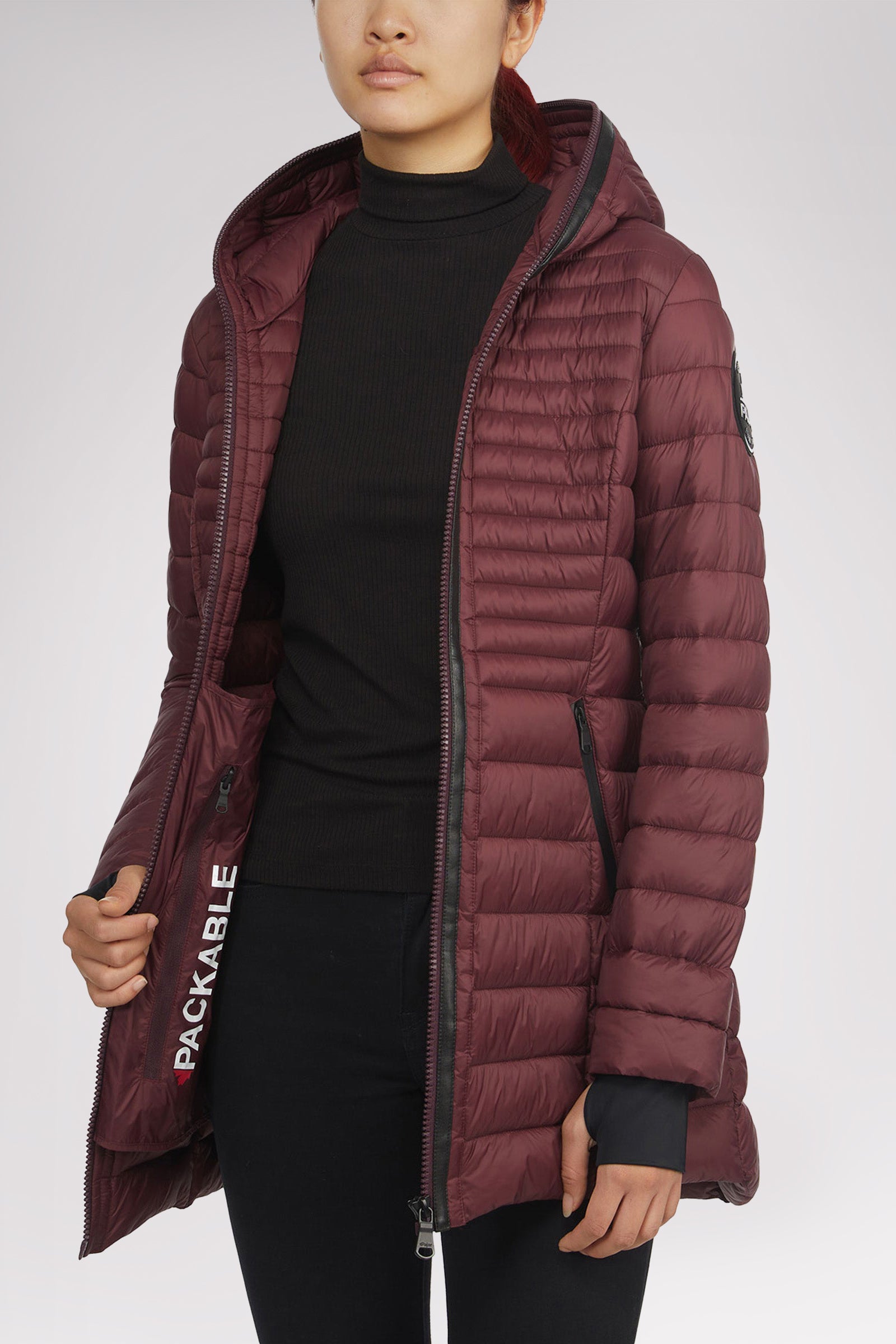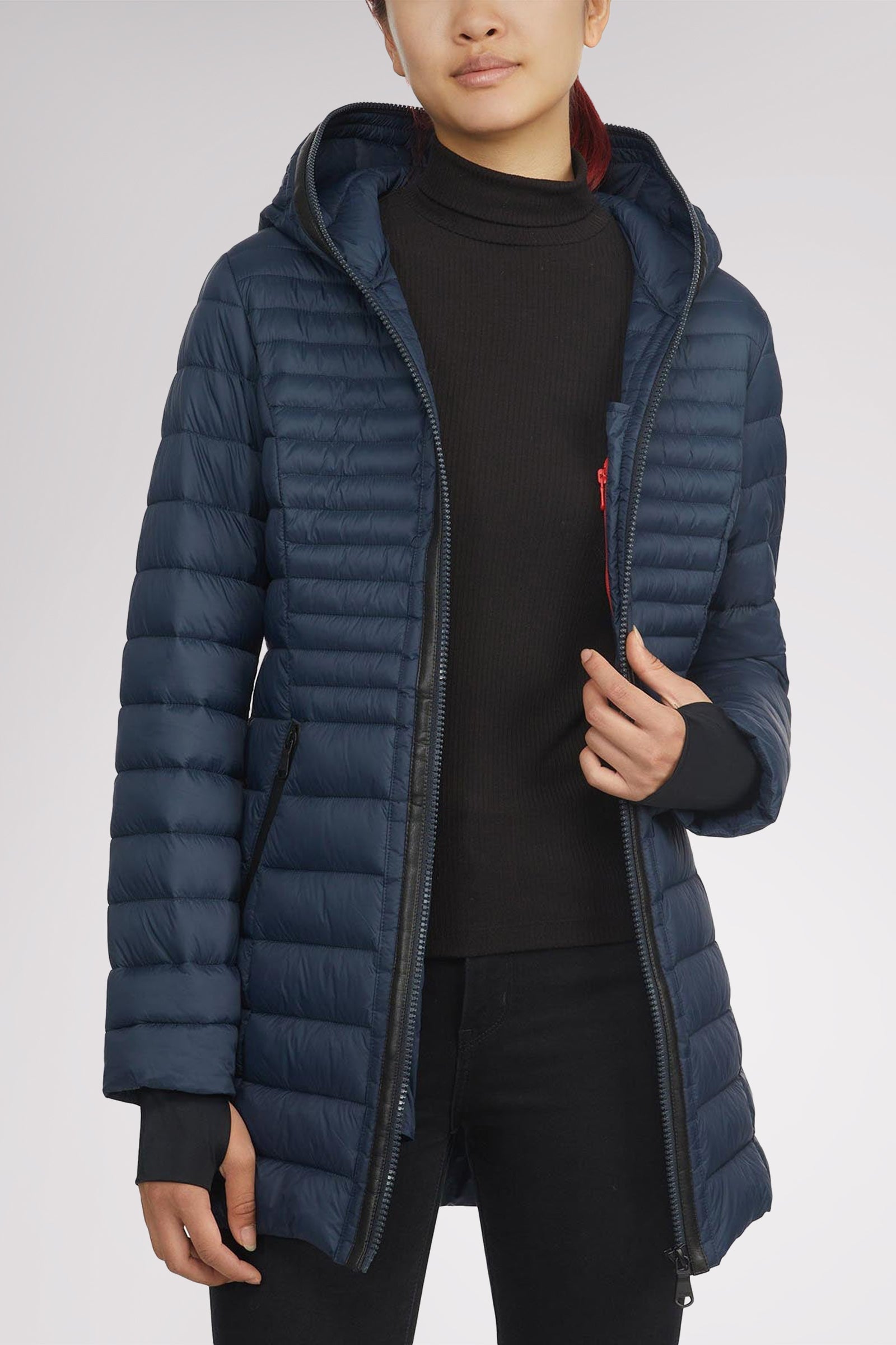 Women's channel quilted lightweight packable 3M Featherless Thinsulate puffer. PU trim zipper frame. Equipped with an exposed zip-to-top closure, zipper pockets with hi-lo hem and fixed hood. Jersey knit storm cuffs with thumbhole.
