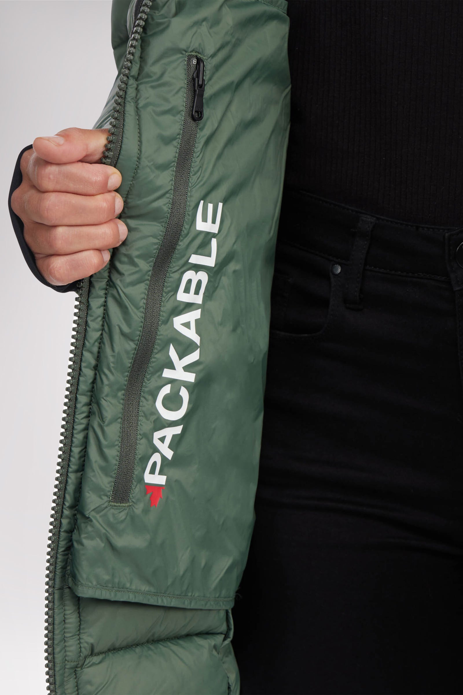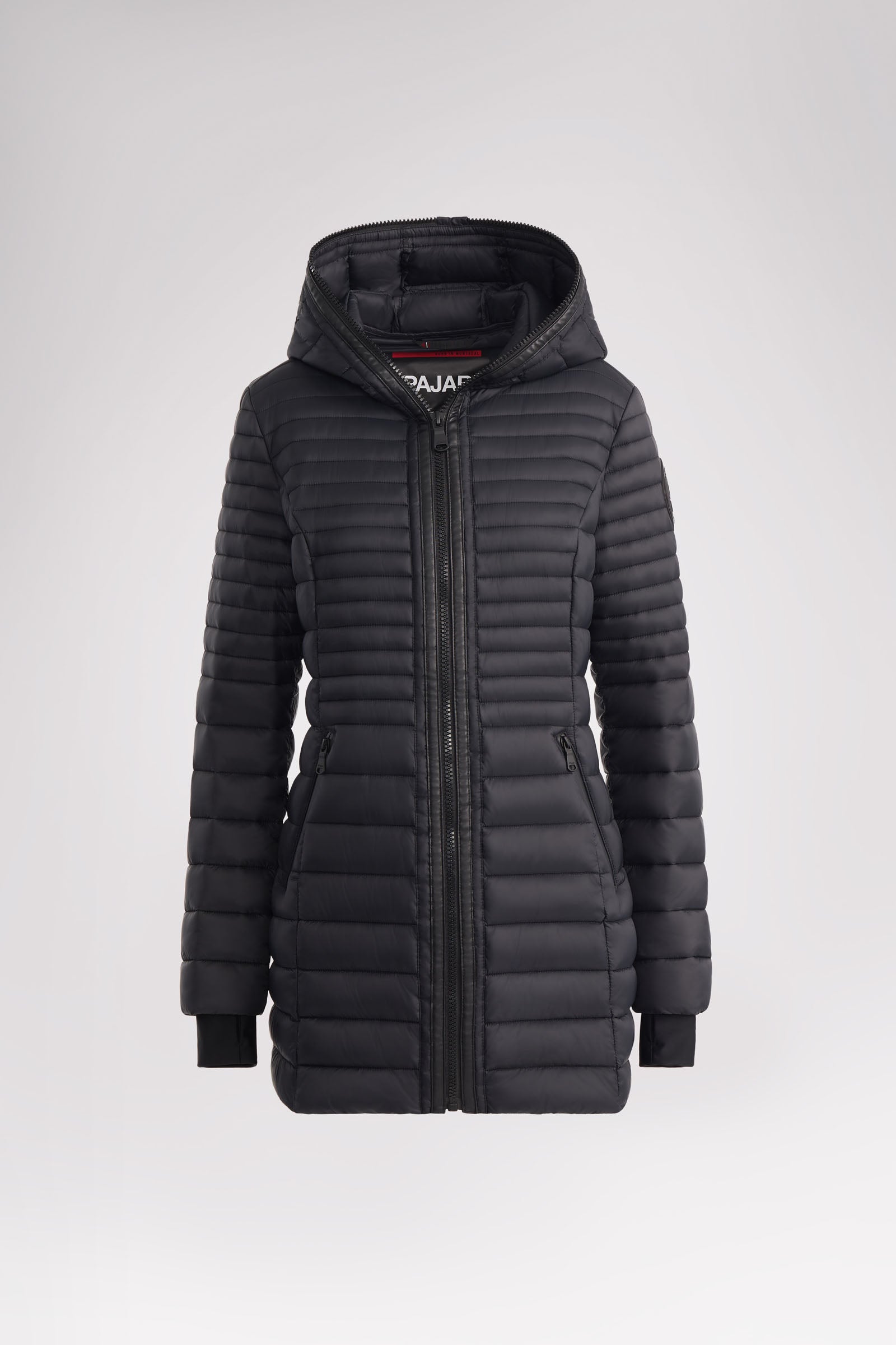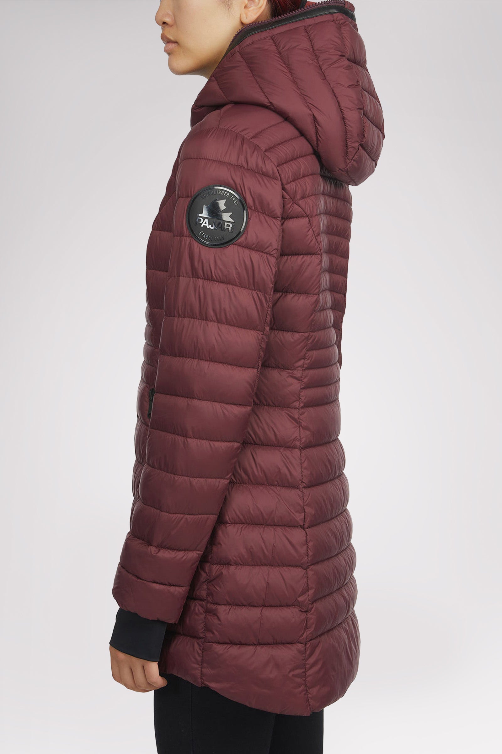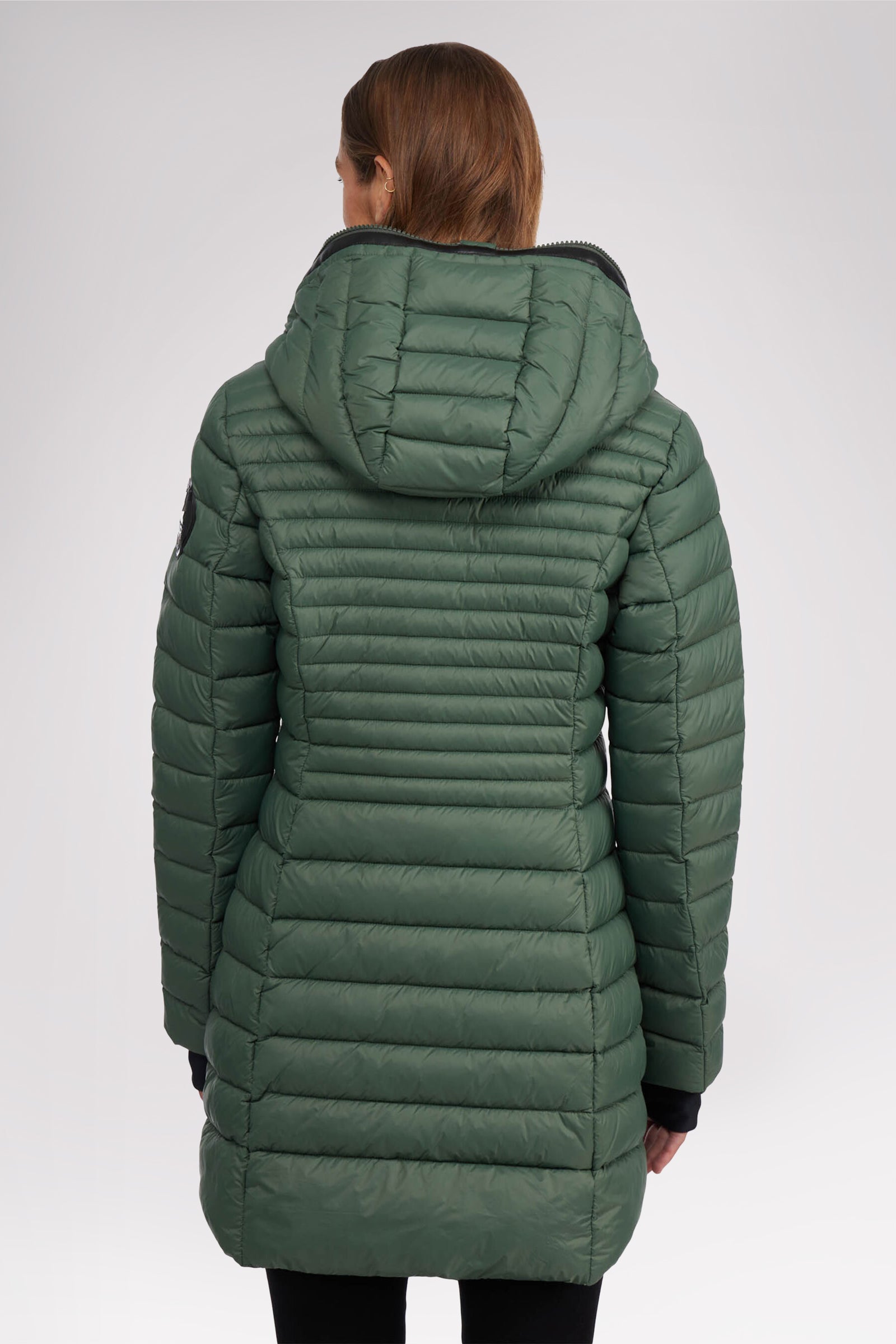 Women's channel quilted lightweight packable 3M Featherless Thinsulate puffer. PU trim zipper frame. Equipped with an exposed zip-to-top closure, zipper pockets with hi-lo hem and fixed hood. Jersey knit storm cuffs with thumbhole.