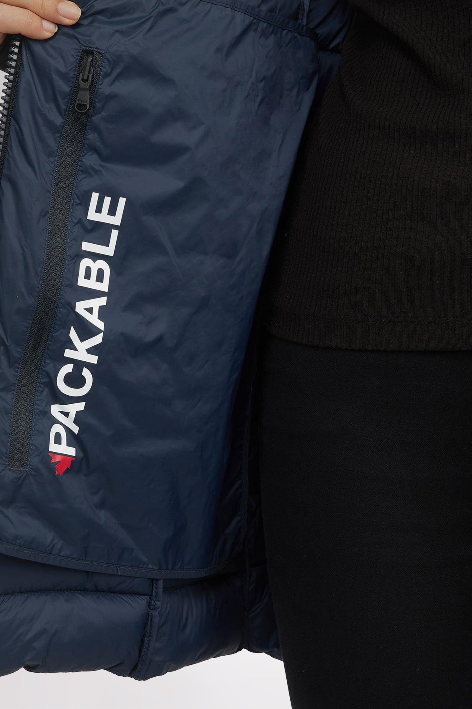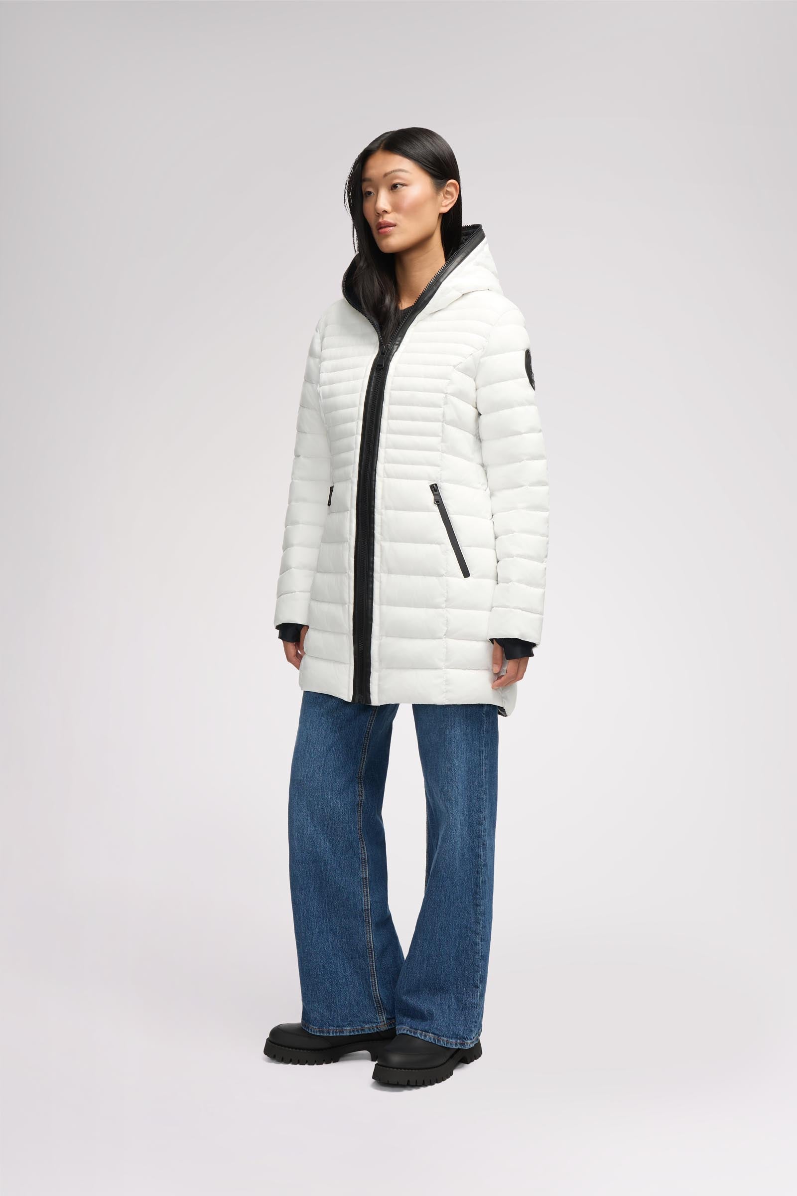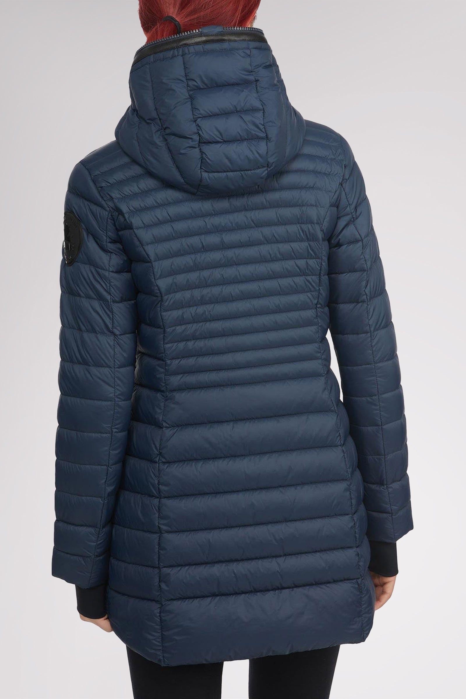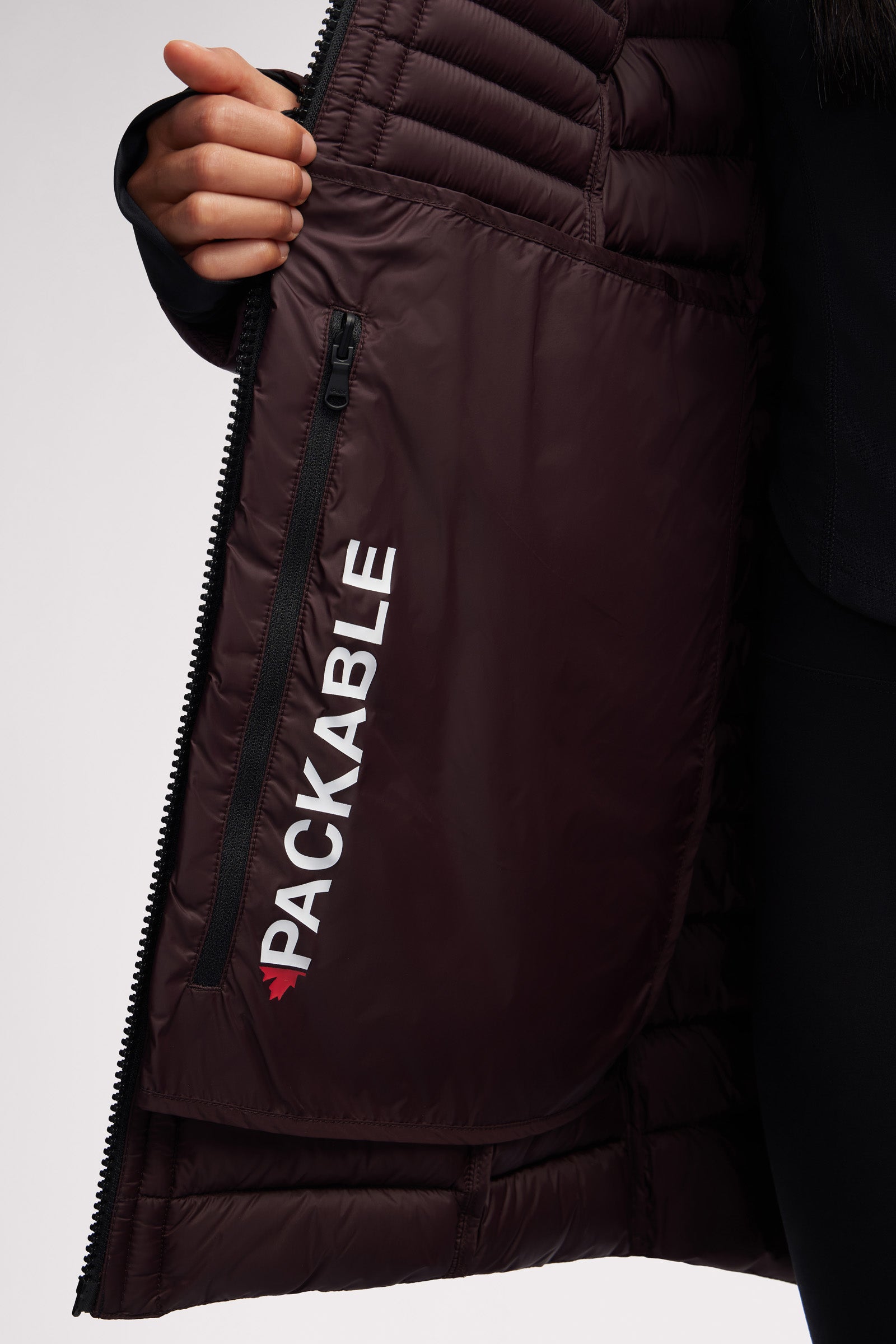 Women's channel quilted lightweight packable 3M Featherless Thinsulate puffer. PU trim zipper frame. Equipped with an exposed zip-to-top closure, zipper pockets with hi-lo hem and fixed hood. Jersey knit storm cuffs with thumbhole.