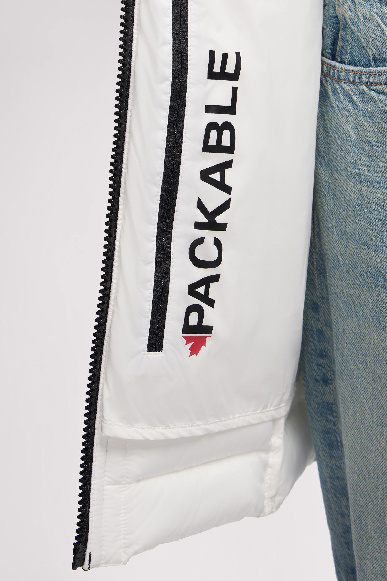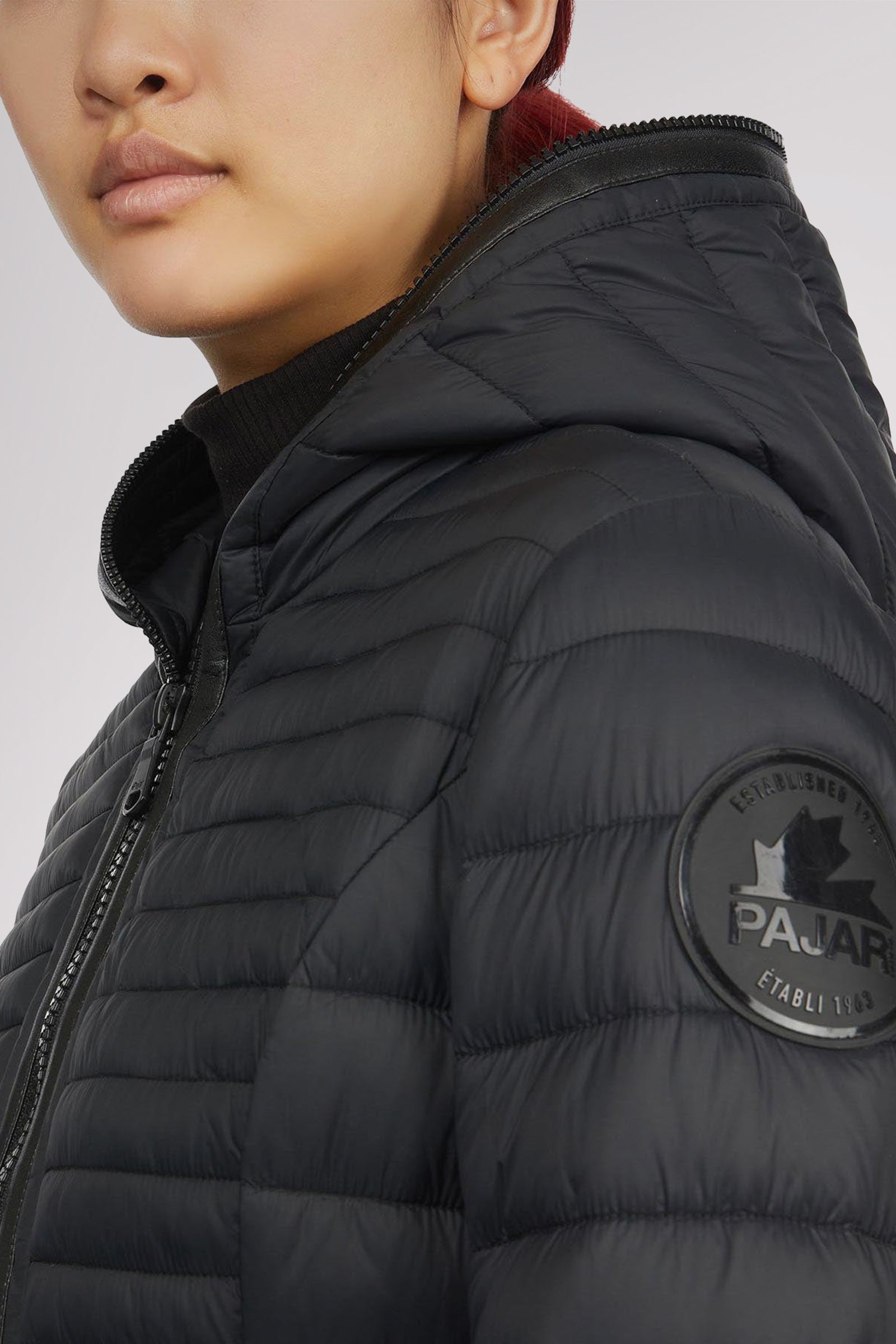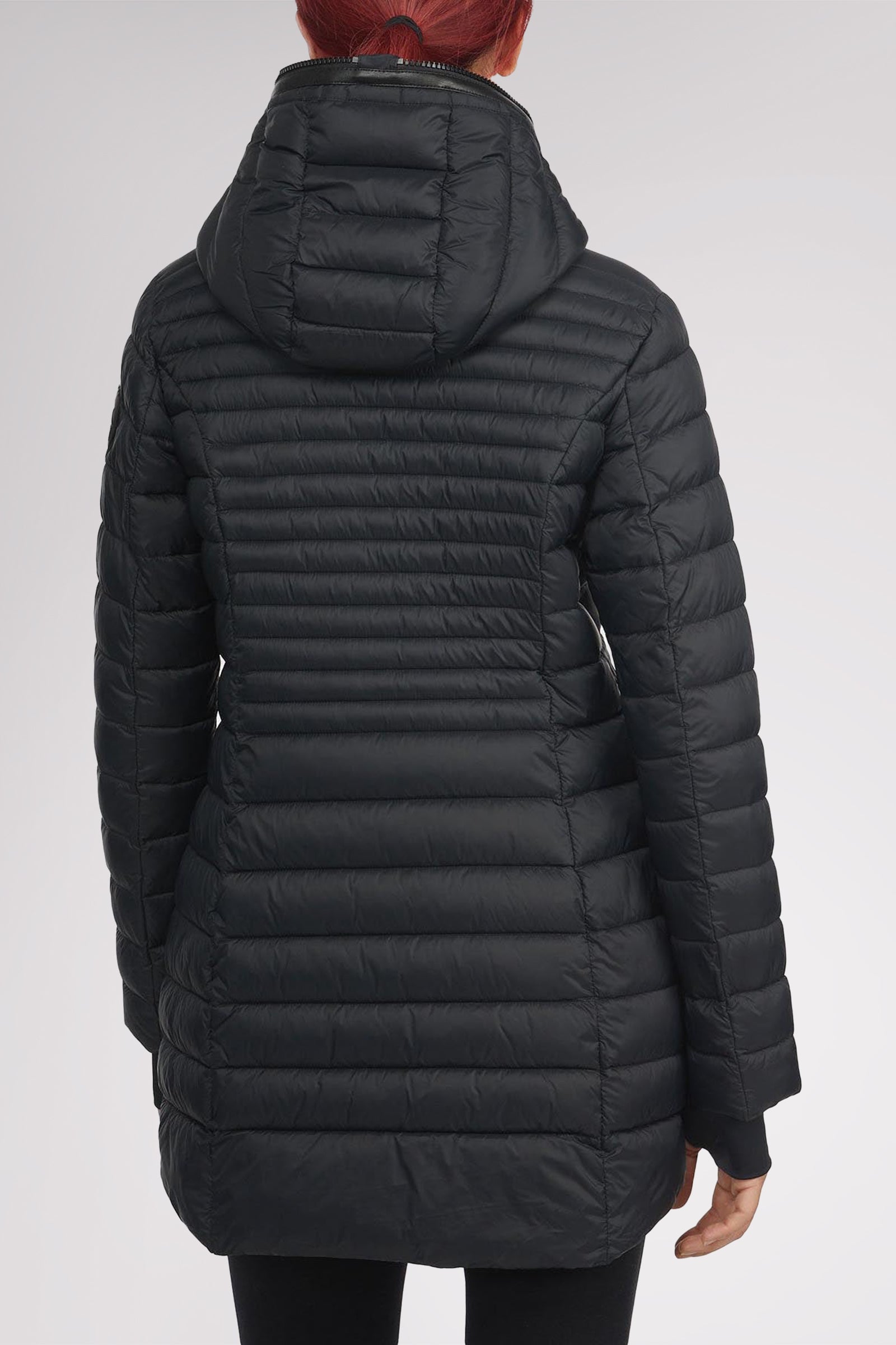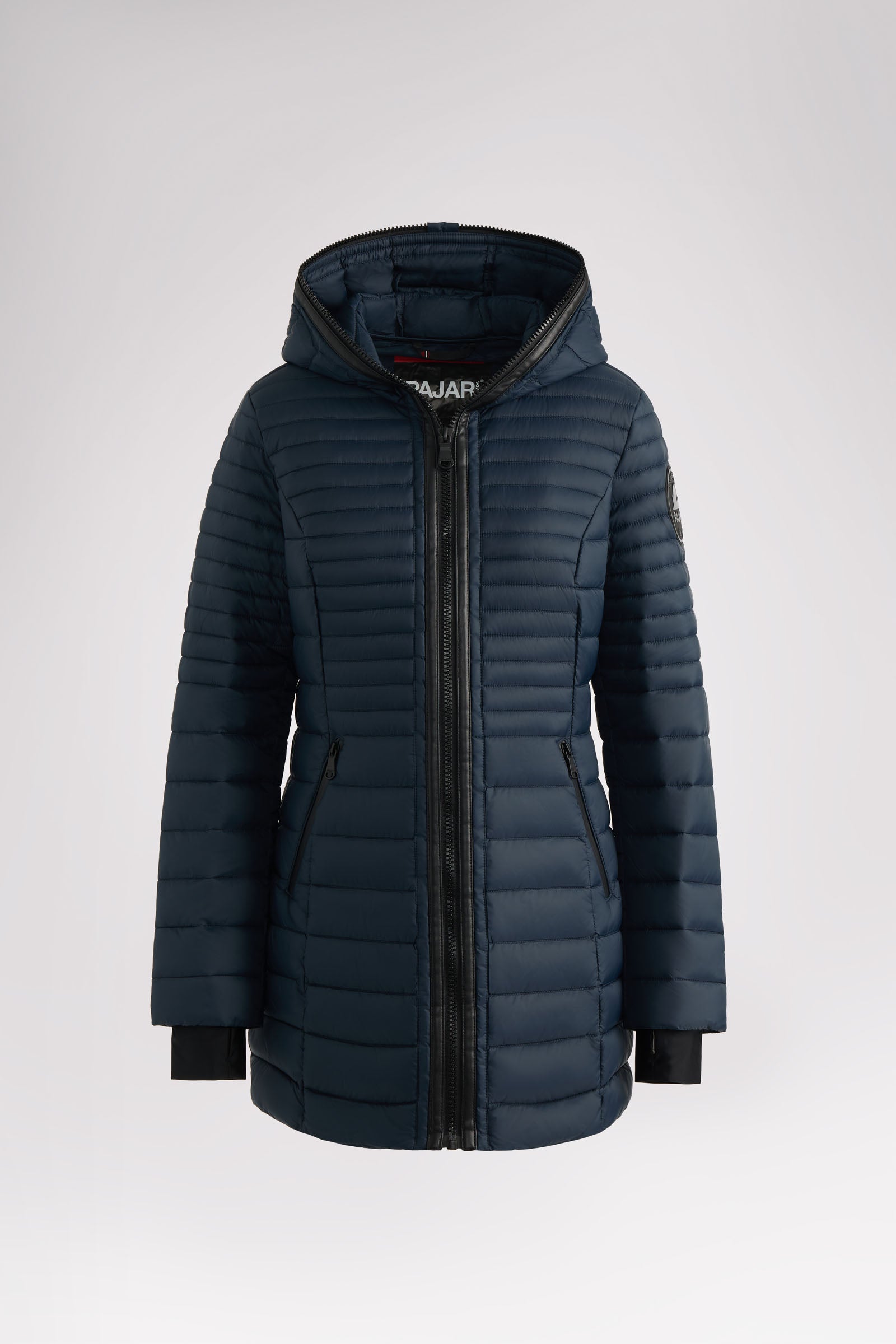 Women's channel quilted lightweight packable 3M Featherless Thinsulate puffer. PU trim zipper frame. Equipped with an exposed zip-to-top closure, zipper pockets with hi-lo hem and fixed hood. Jersey knit storm cuffs with thumbhole.