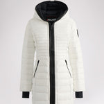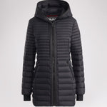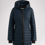 Women's channel quilted lightweight packable 3M Featherless Thinsulate puffer. PU trim zipper frame. Equipped with an exposed zip-to-top closure, zipper pockets with hi-lo hem and fixed hood. Jersey knit storm cuffs with thumbhole.