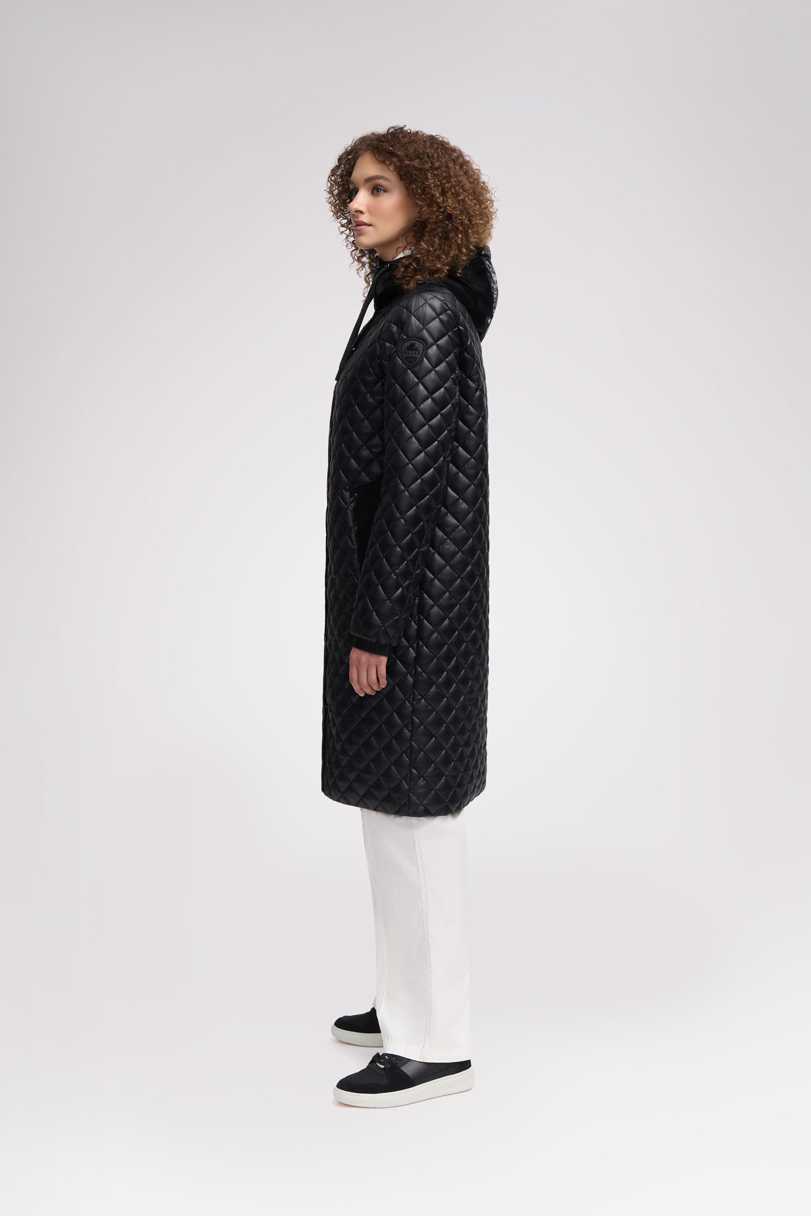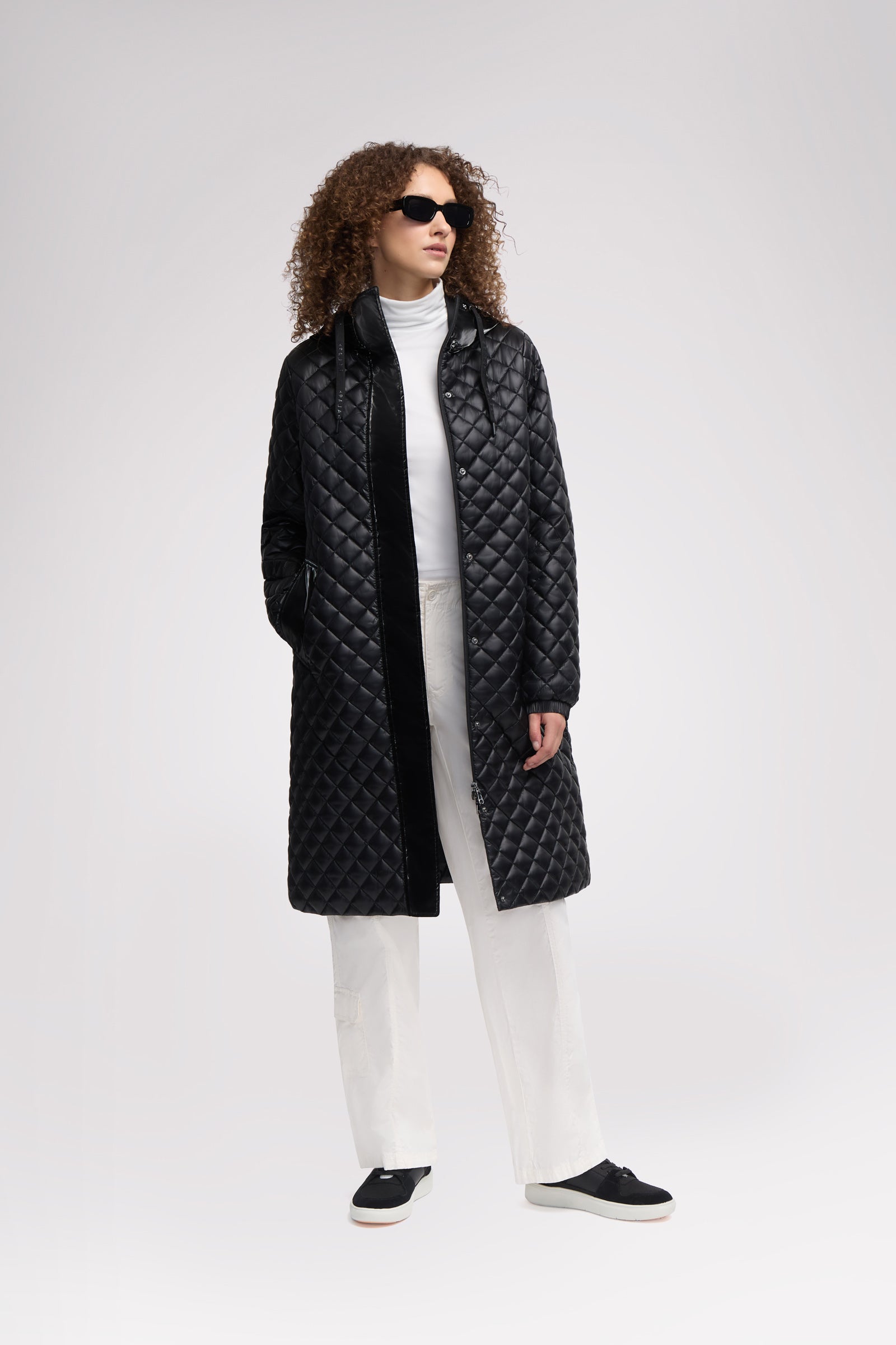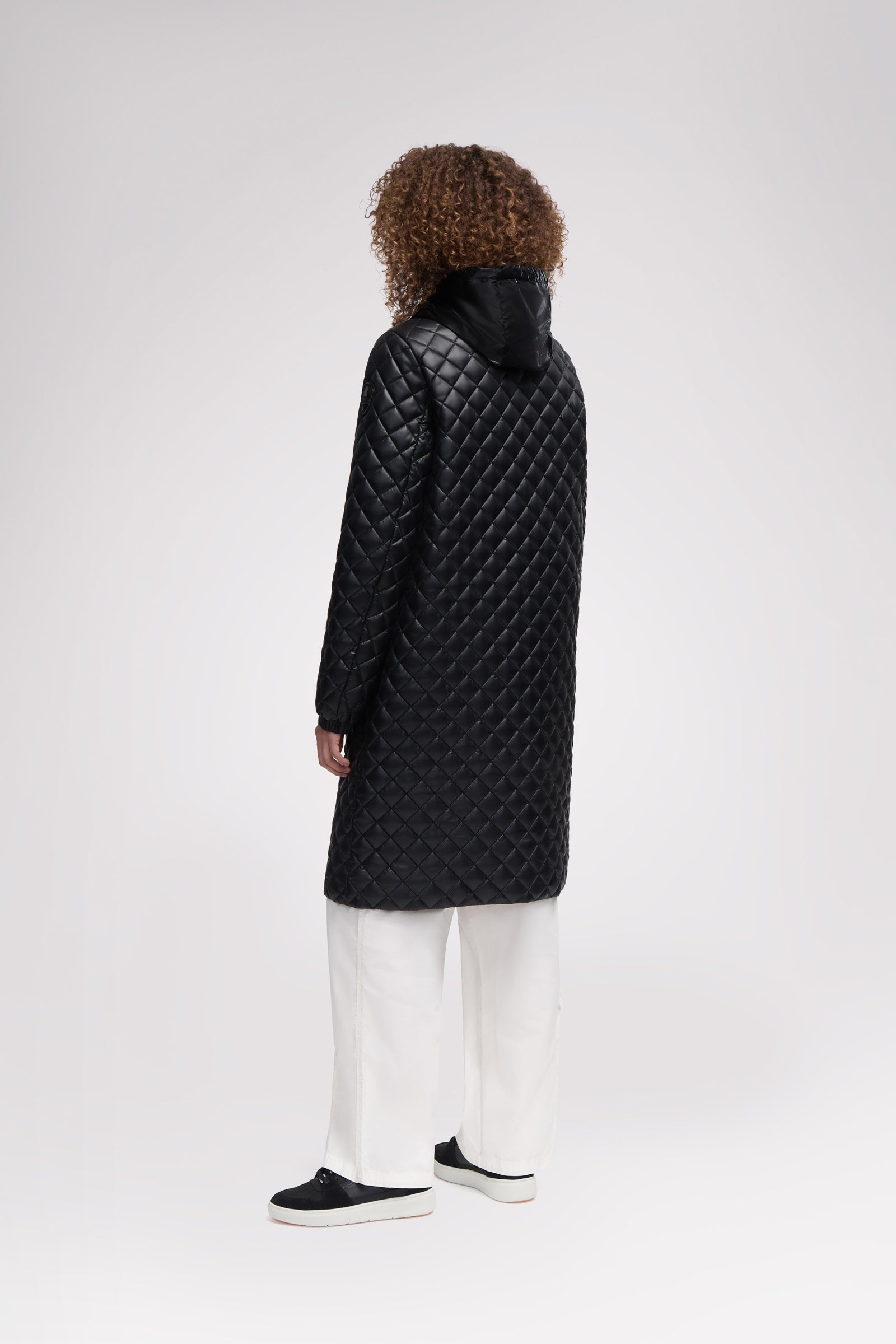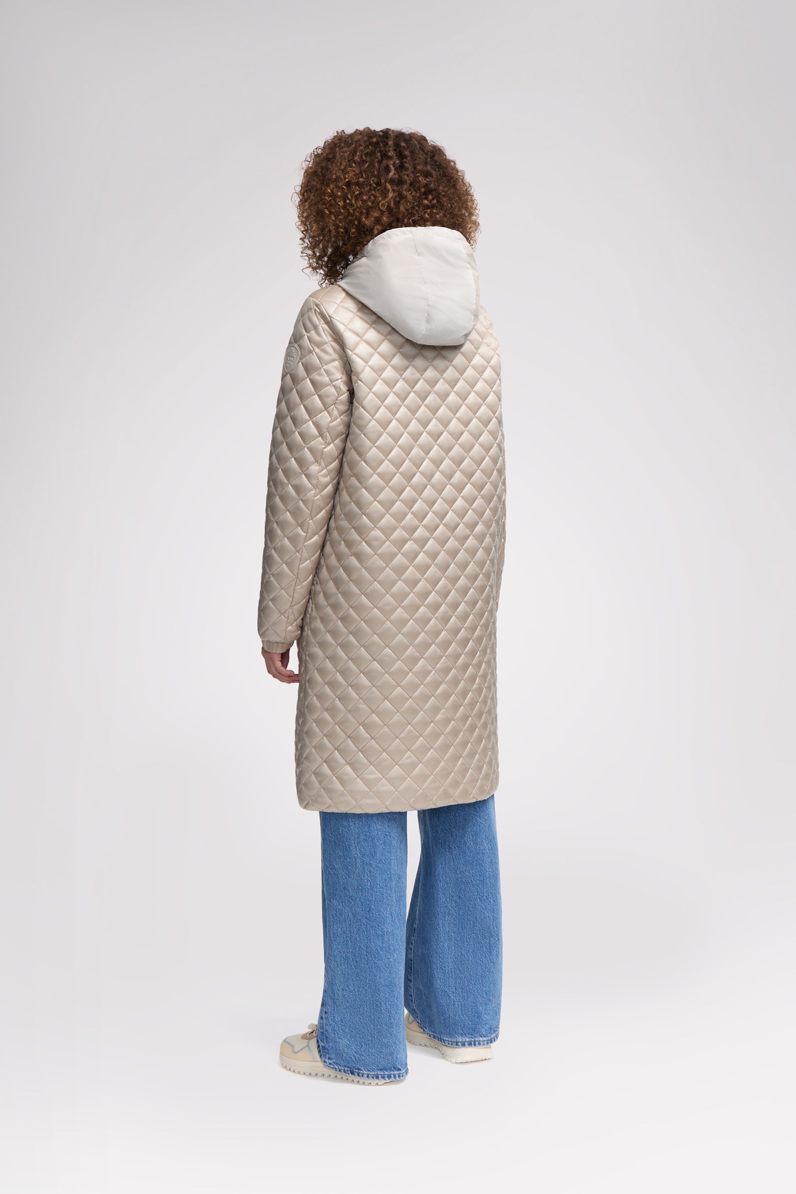 Crisp, smooth fabric with a pearl-like surface sheen, coated @back to repel water, and offer wind protection