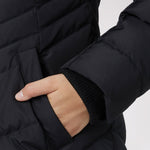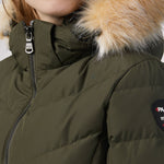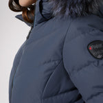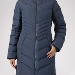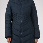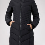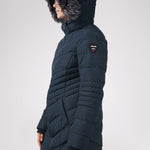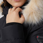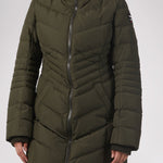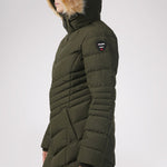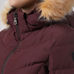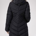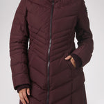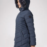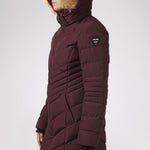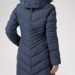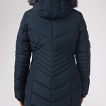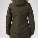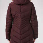 Women’s Chevron quilted puffer with detachable hood & faux fur trim. Featuring side vent zipper detail and side pockets with snap fasteners, and cozy rib knit storm cuffs.