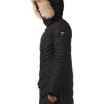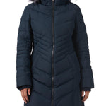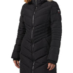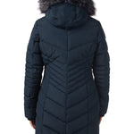Chevron quilted puffer with detachable hood & fur trim. Featuring side vent zipper detail and zipper pockets and cozy rib knit storm cuffs.