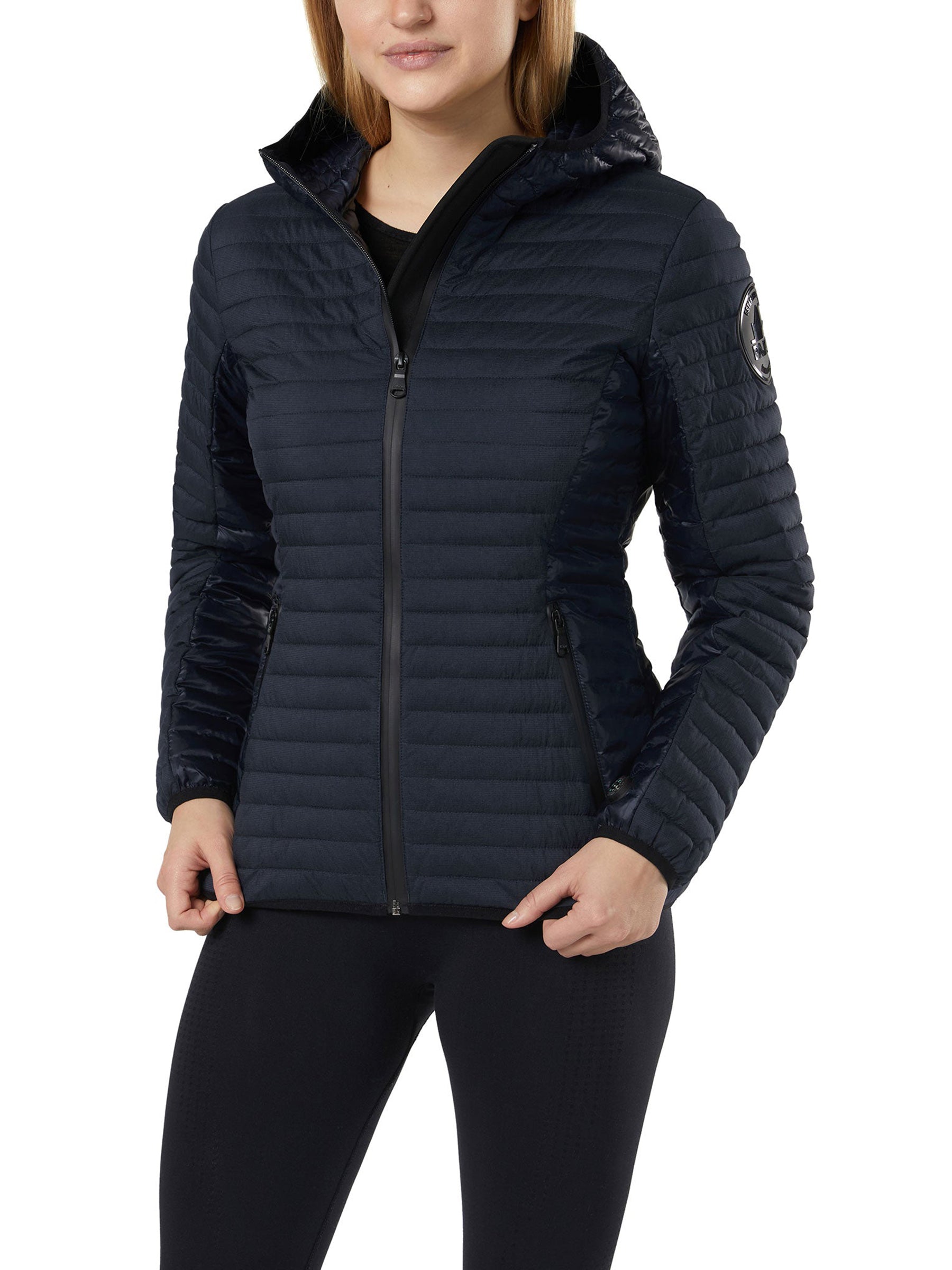 Ladies micro-channel quilted lightweight packable 3M Featherless Thinsulate Puffer. Zip front closure with combo shiny ciré panels. Lycra binding hood, sleeve and bottom hem.