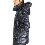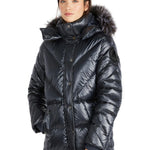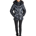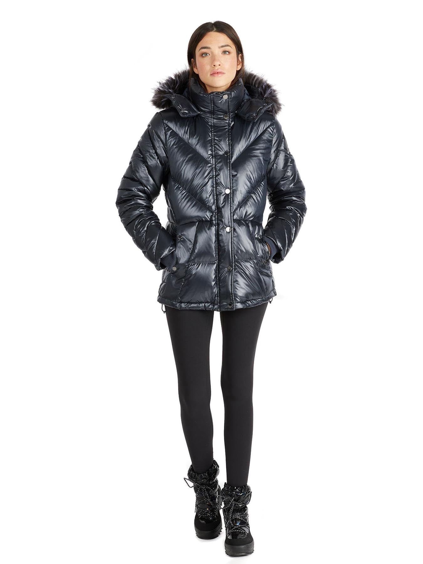Women’s chevron quilted puffer with detachable faux fur trim and hood. Equipped with zip & snap front placket closure and angled snap closure welt pockets. Adjustable bottom hem bungee drawcords. Cozy rib knit storm cuffs.